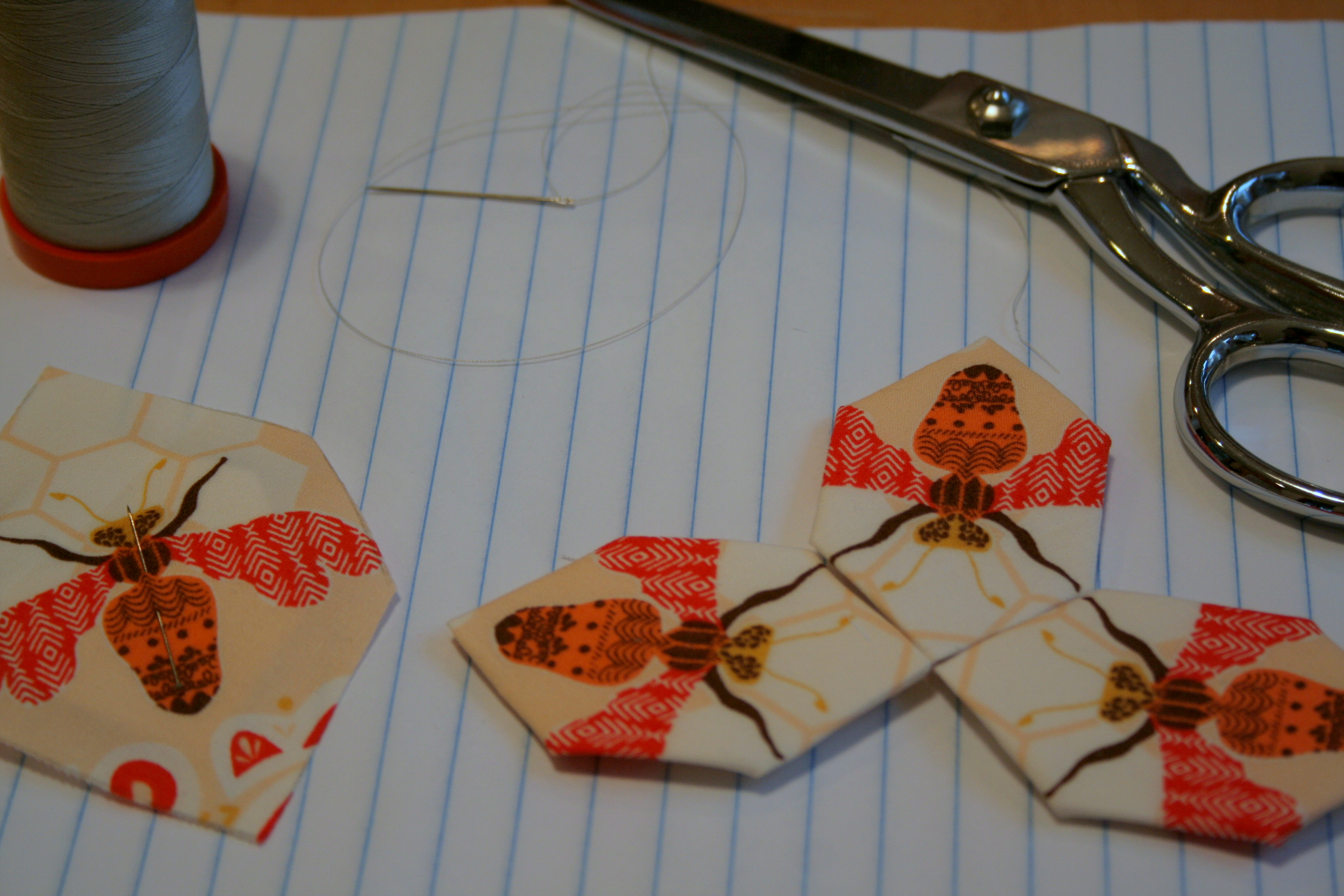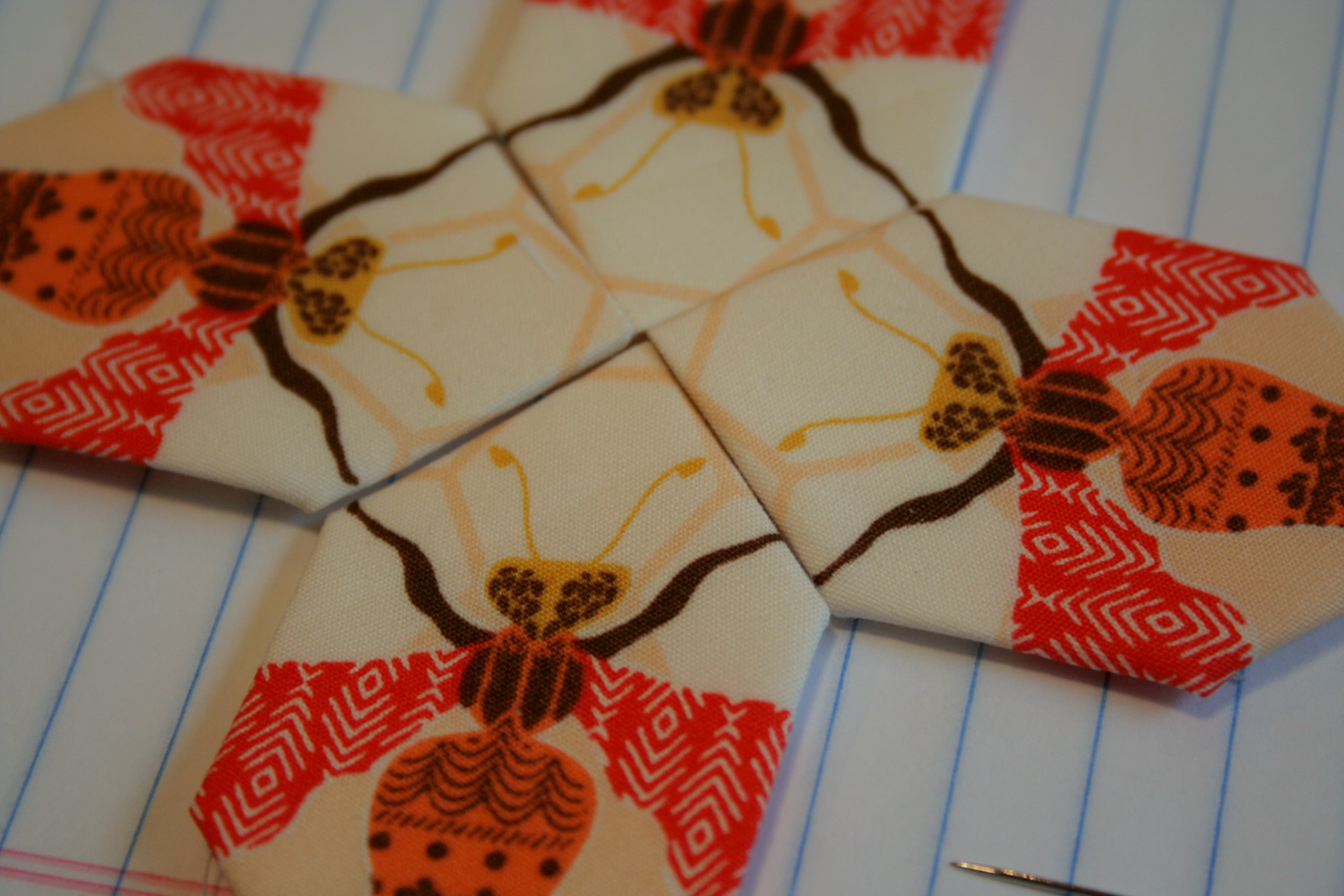 I have not yet removed the papers from either of the blocks, except the four center bee pieces more as a test to make sure I could get the paper out than anything else, and I love the way the backs look. Every little basting stitch, the crisp folds, the tiny hand stitches holding them all together: beauty.