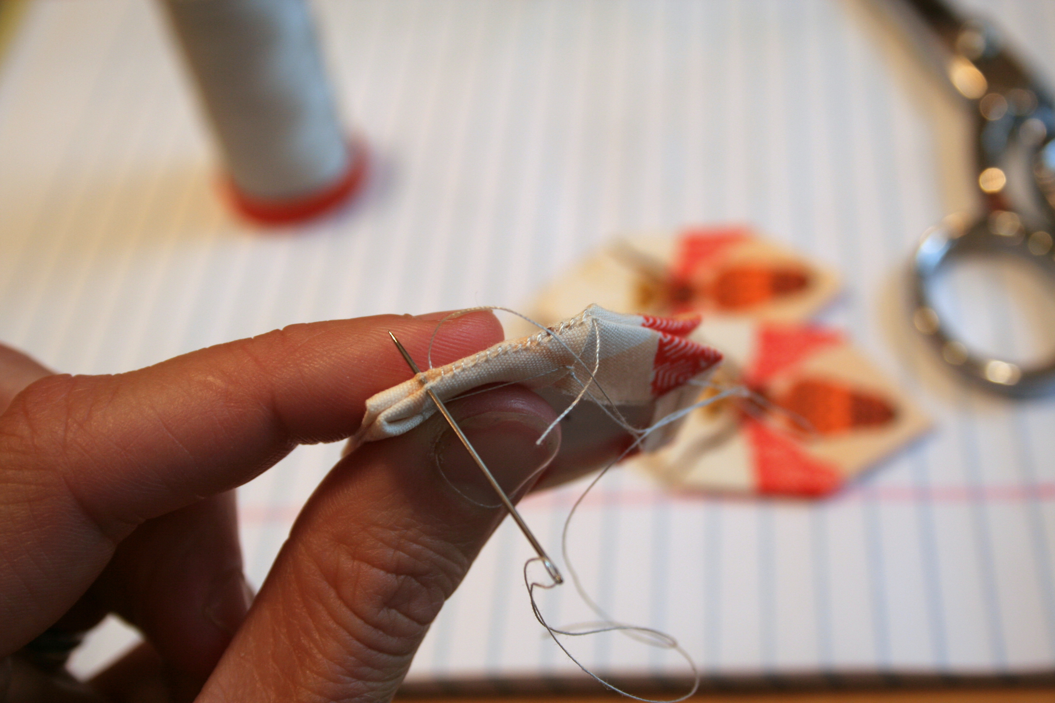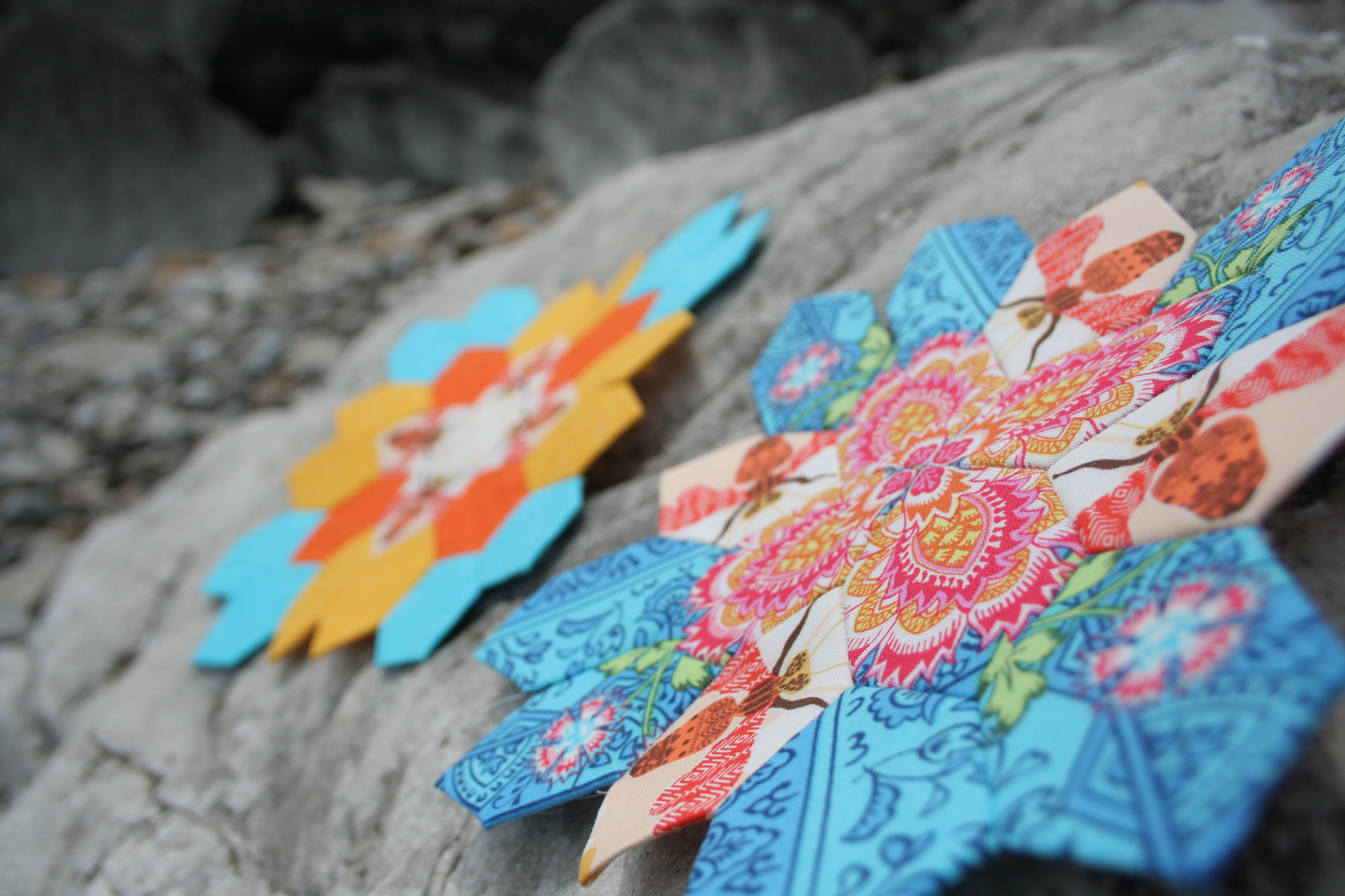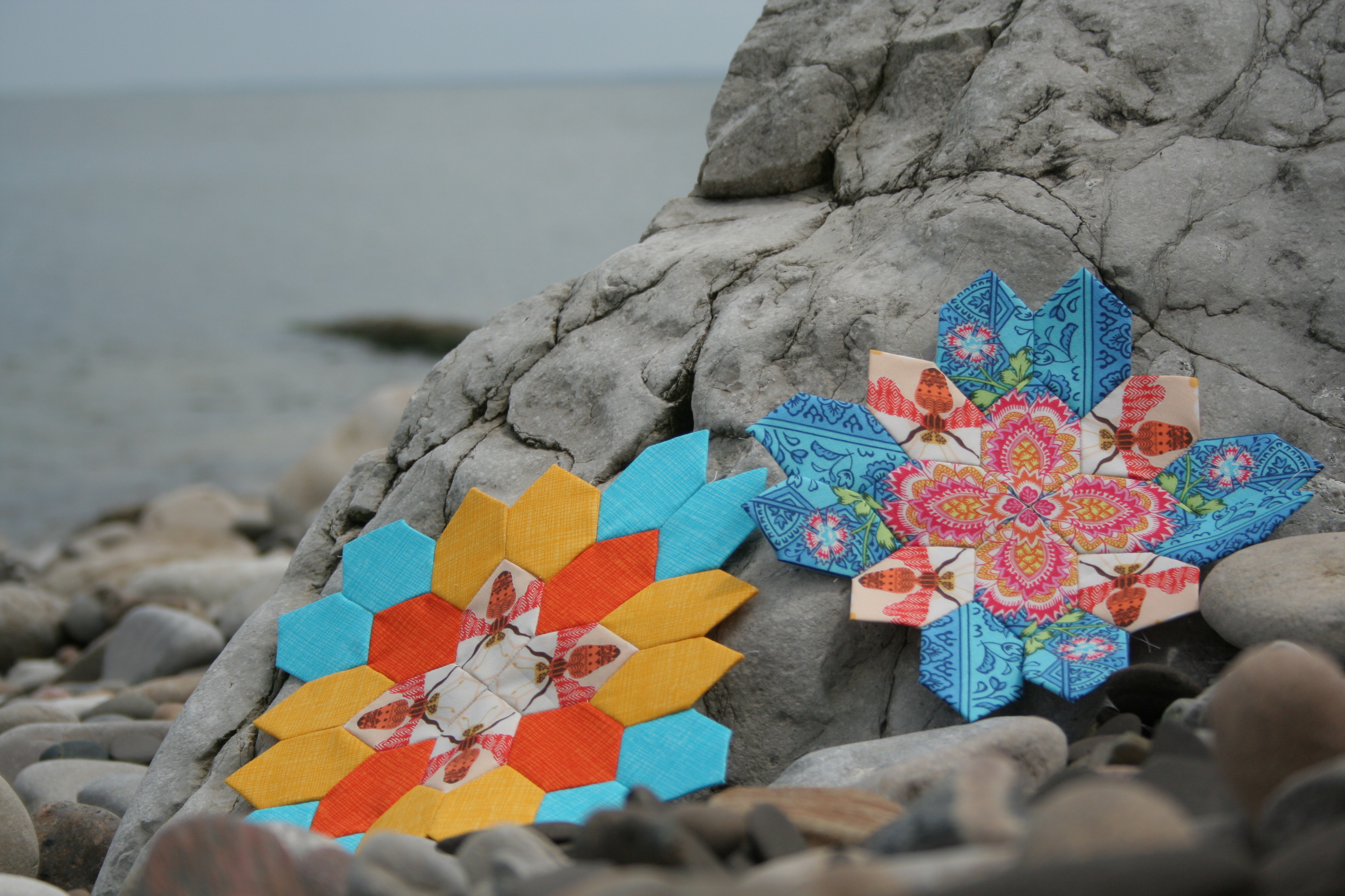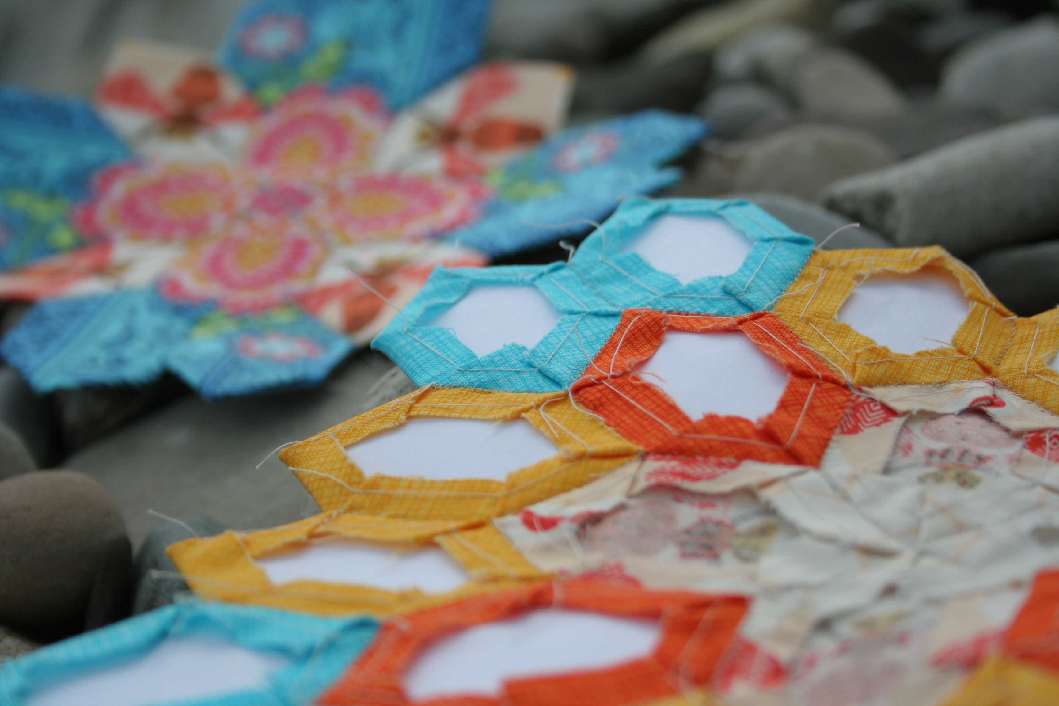 I then might add one more outer edge of some other color, to make the center block larger than the outer ones. I am really enjoying the process of English Paper Piecing, specifically how portable it is and how it is so easy to pick up and put down for even just a five minute sewing stint. I’m looking forward to exploring other EPP template shapes. So far I’ve found hexagon, diamond, and triangle templates, but it looks like there are no rules; any shape or combination of shapes can be made into templates. Let the pattern creation begin! Well, after I finish these blocks of course.