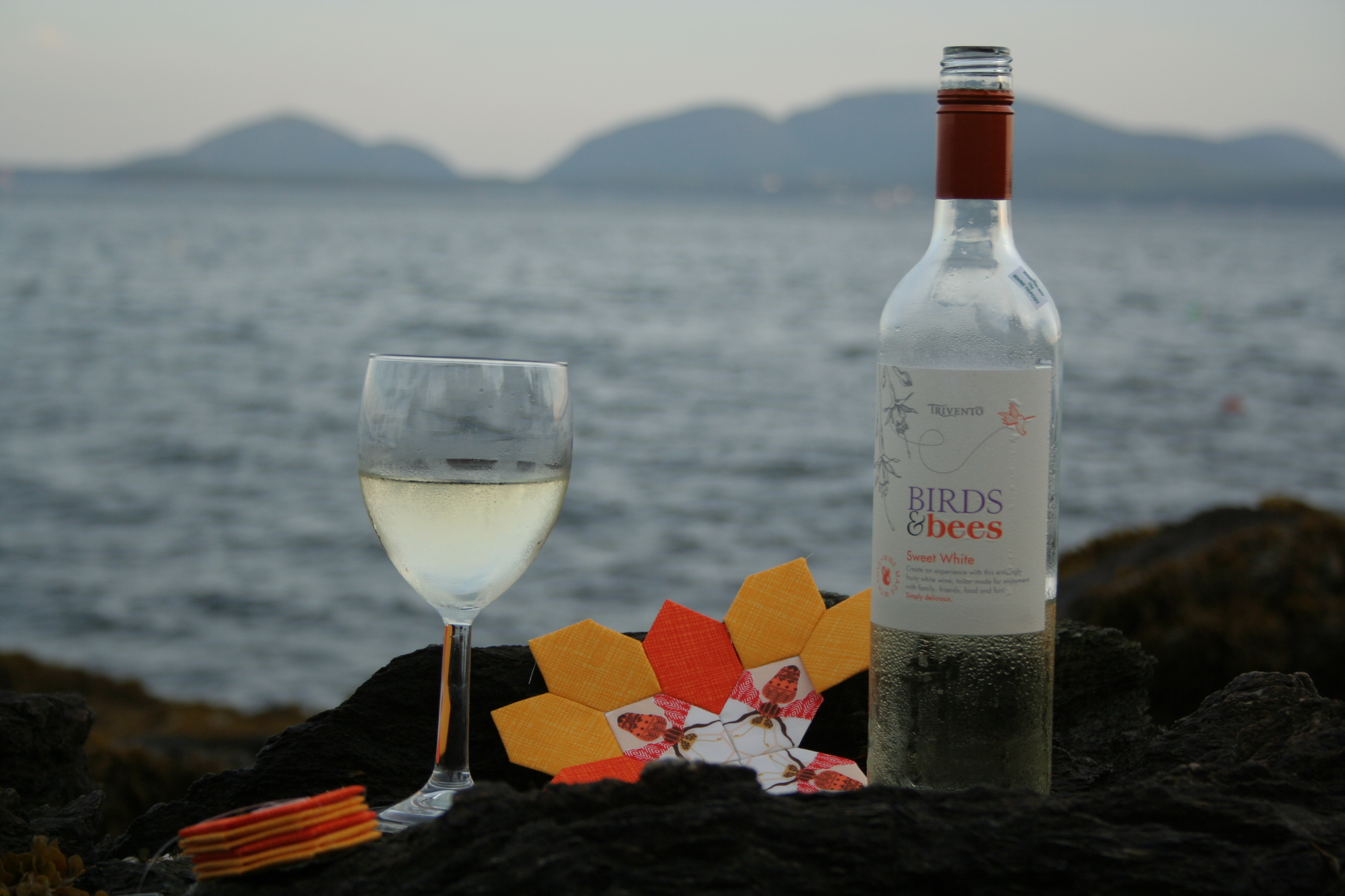 I think I have decided that these blocks will be turned into a table runner or centerpiece. My plan is to make another block the same as my first with the four bees in the center, and use the new Lark-heavy block as the center with the two bee blocks on either end, joined and bordered by some other background fabric. I still have to decide what color to use in the outermost border for the center block, but I’m leaning toward yellow.