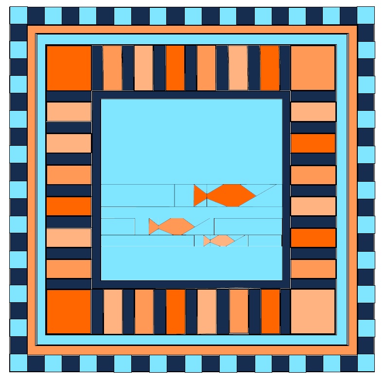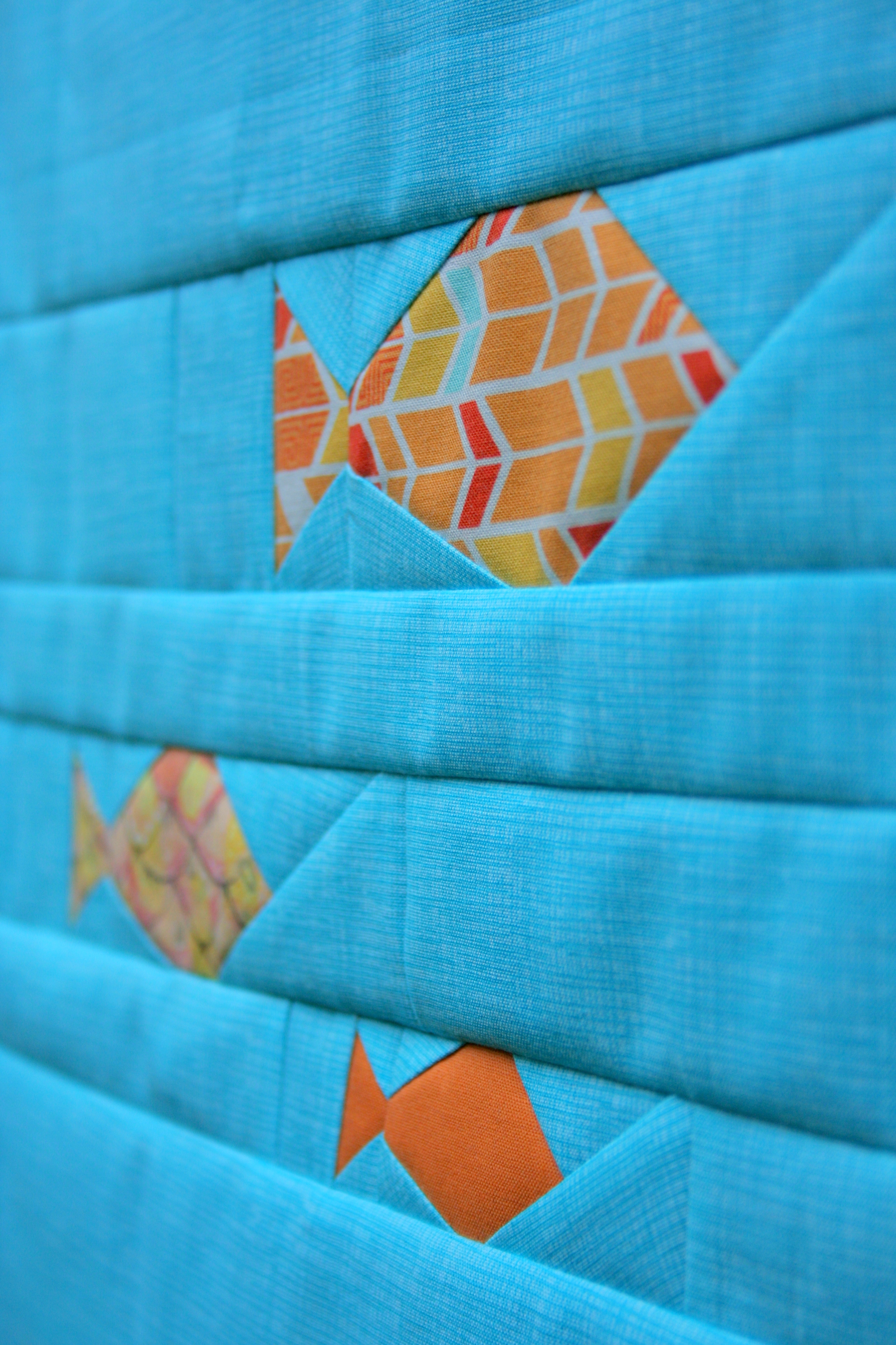 This pattern began as a pillow pattern (in the fabric pull above, the bottom fabric is intended as binding and the second-from-bottom is the backing fabric), but as I pieced it and envisioned it more, I realized it would make a great center panel for a baby quilt or underwater nursery wall hanging, too. I decided to offer the pattern simply as a panel pattern so that the end product can be left to your creative desires. The pattern includes foundation paper piecing patterns for three different sized fish, finishing at 2″x9.5″ (large), 1.5″x7″ (medium), and 1″x4.75″ (small), as well as cutting instructions and a piecing diagram for a full 16″x16″ finished panel (16.5″x16.5″ unfinished).