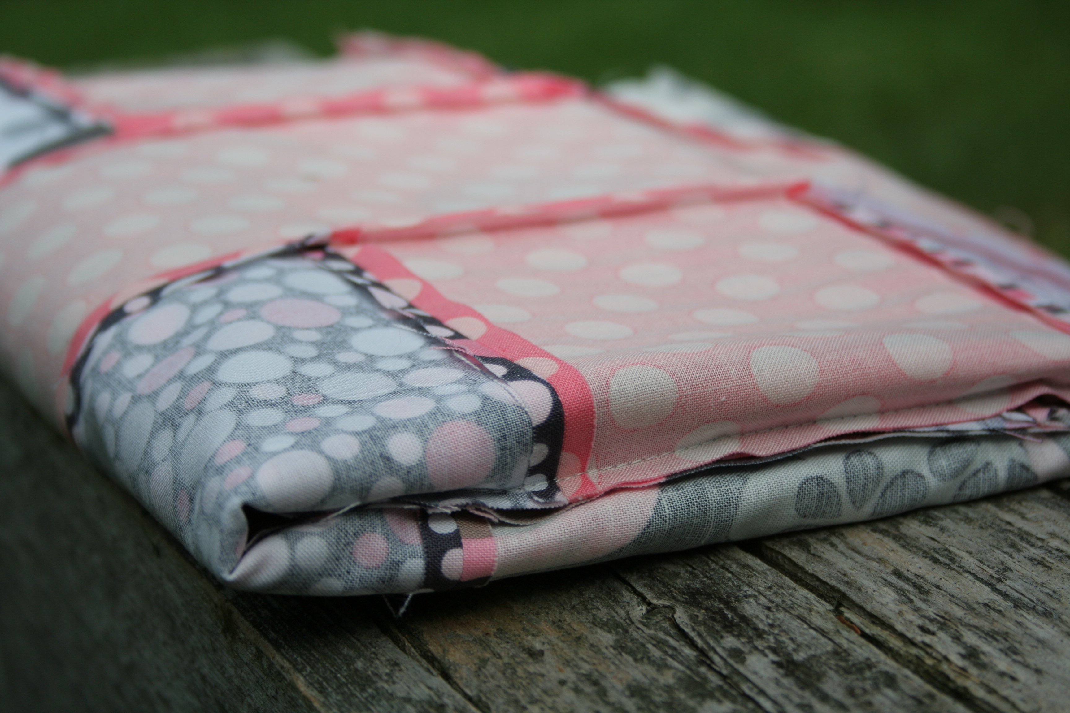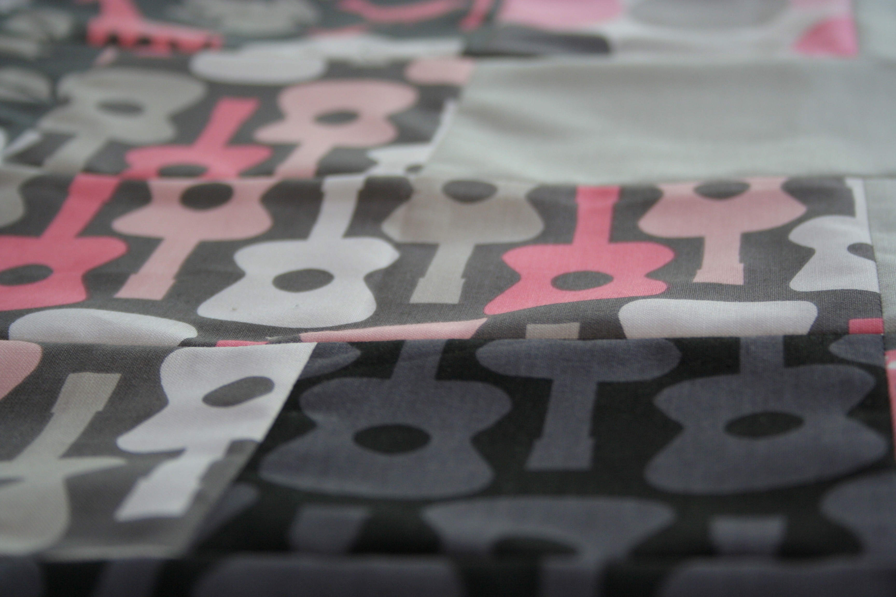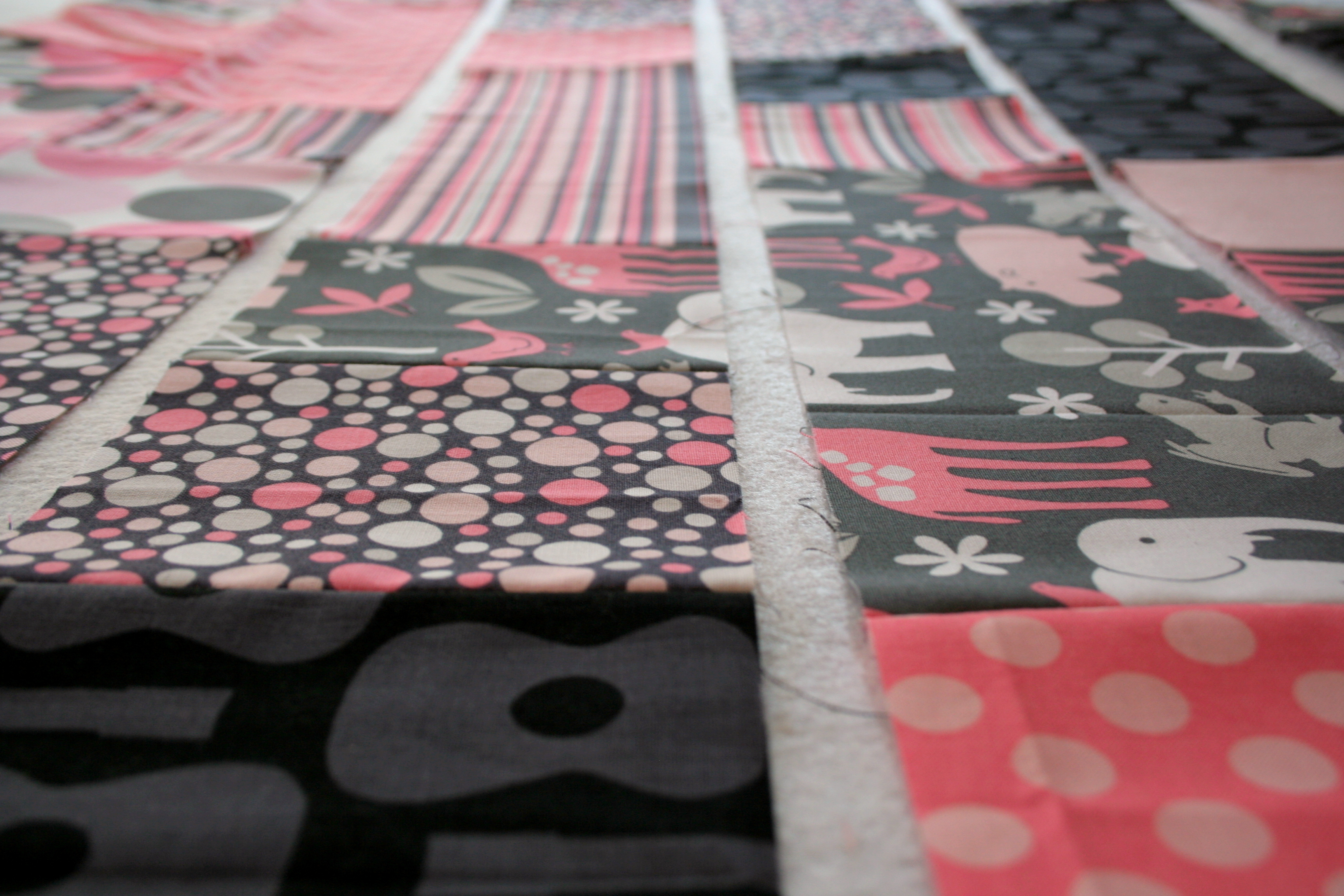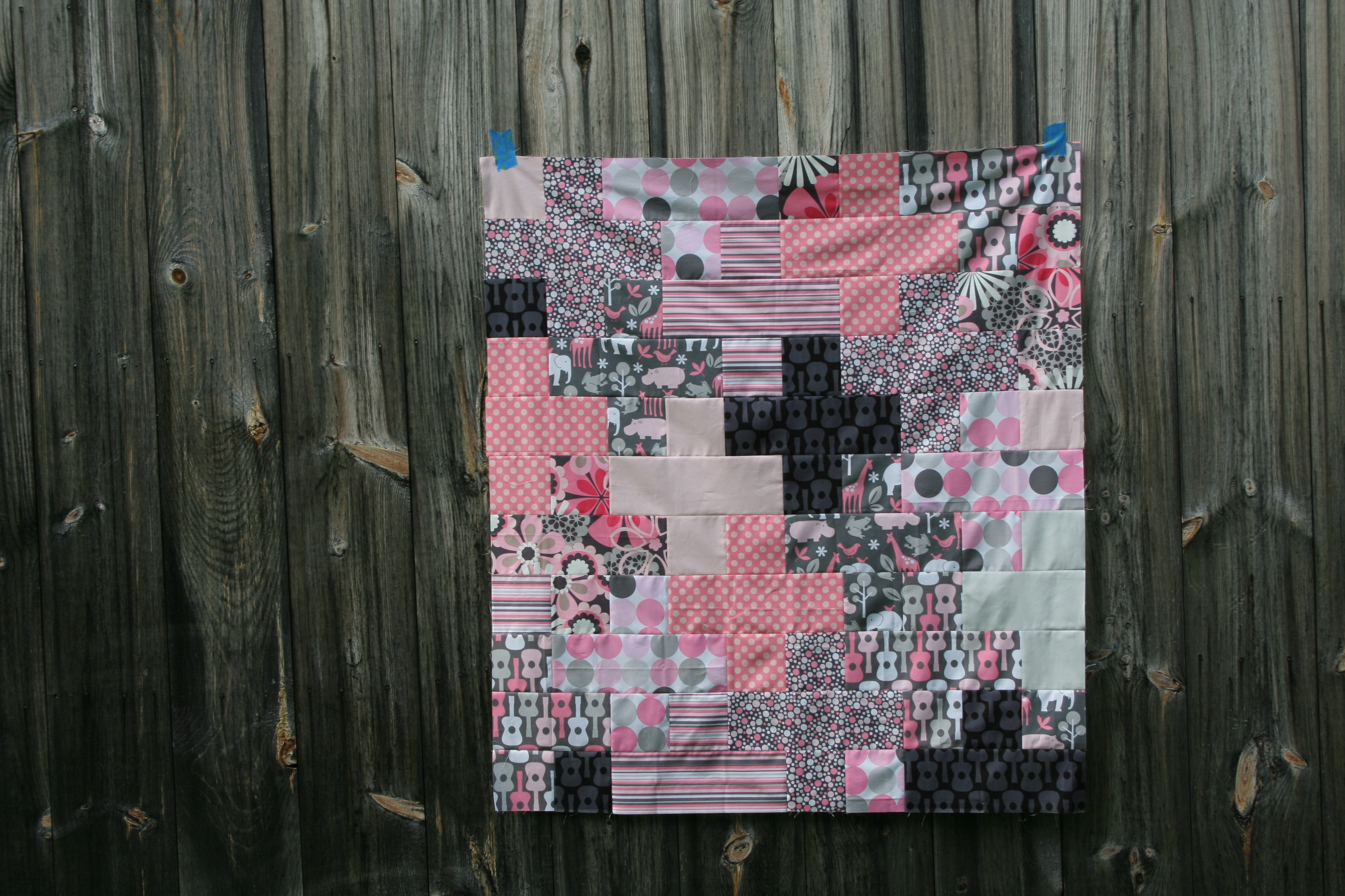 This is my first quilt to be listed for sale in our Late Night Baby Etsy shop, which is primarily run by Michelle & Stephanie, my Late Night Quilter soul sisters. I bought a Michael Miller pink & grey fat quarter bundle over a year ago, since I am totally in love with the color combination. I love grey in general and am typically not a huge pink fan, but together it works so well. When Stephanie, Michelle, and I started talking about opening an Etsy shop in which to sell baby quilts and other sewn items, I was immediately excited to finally make a quilt from this bundle. I added a tiny splash of Moda solids, and if I were to make this quilt again, I think I would add more solids, but overall I’m very happy with how this quilt is turning out.