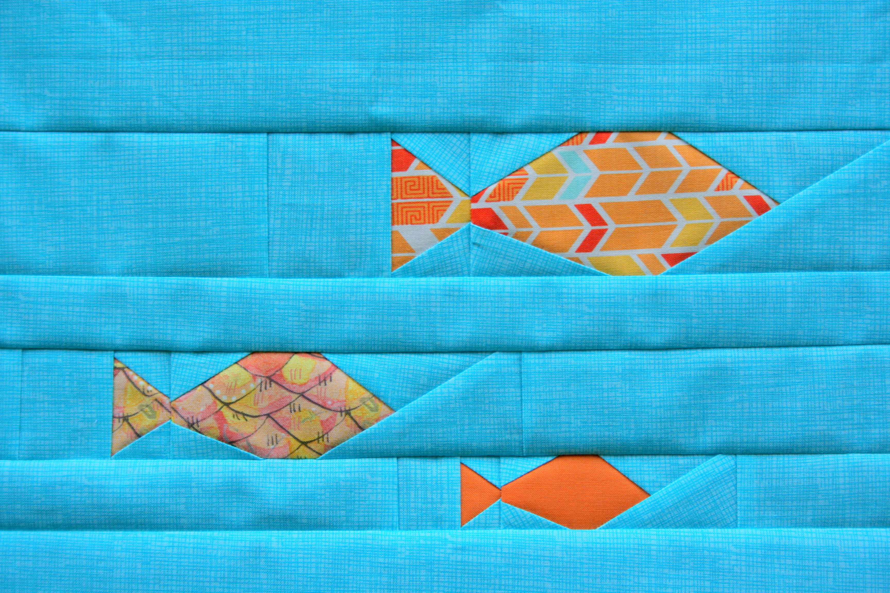 I can see this pattern being created with any number of fabric color and pattern vs. solid combinations, as well as different layouts. For color, I’m itching to make a version with a scrappy low volume background and rainbow fish. I could also see using the fish individually for other smaller projects, maybe fabric bins for a playroom, kids’ place mats, or even at the bottom of a little girl’s dress.