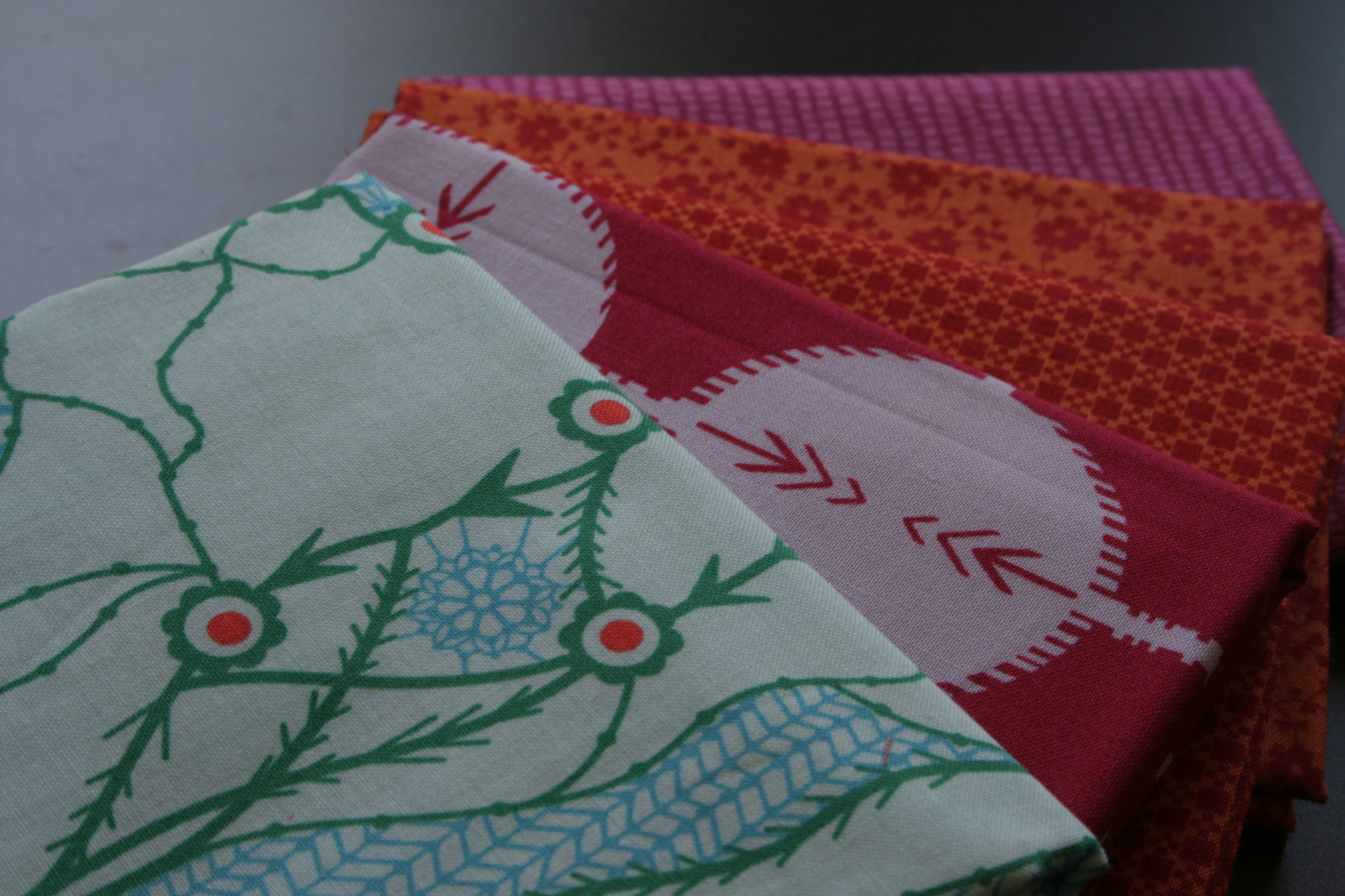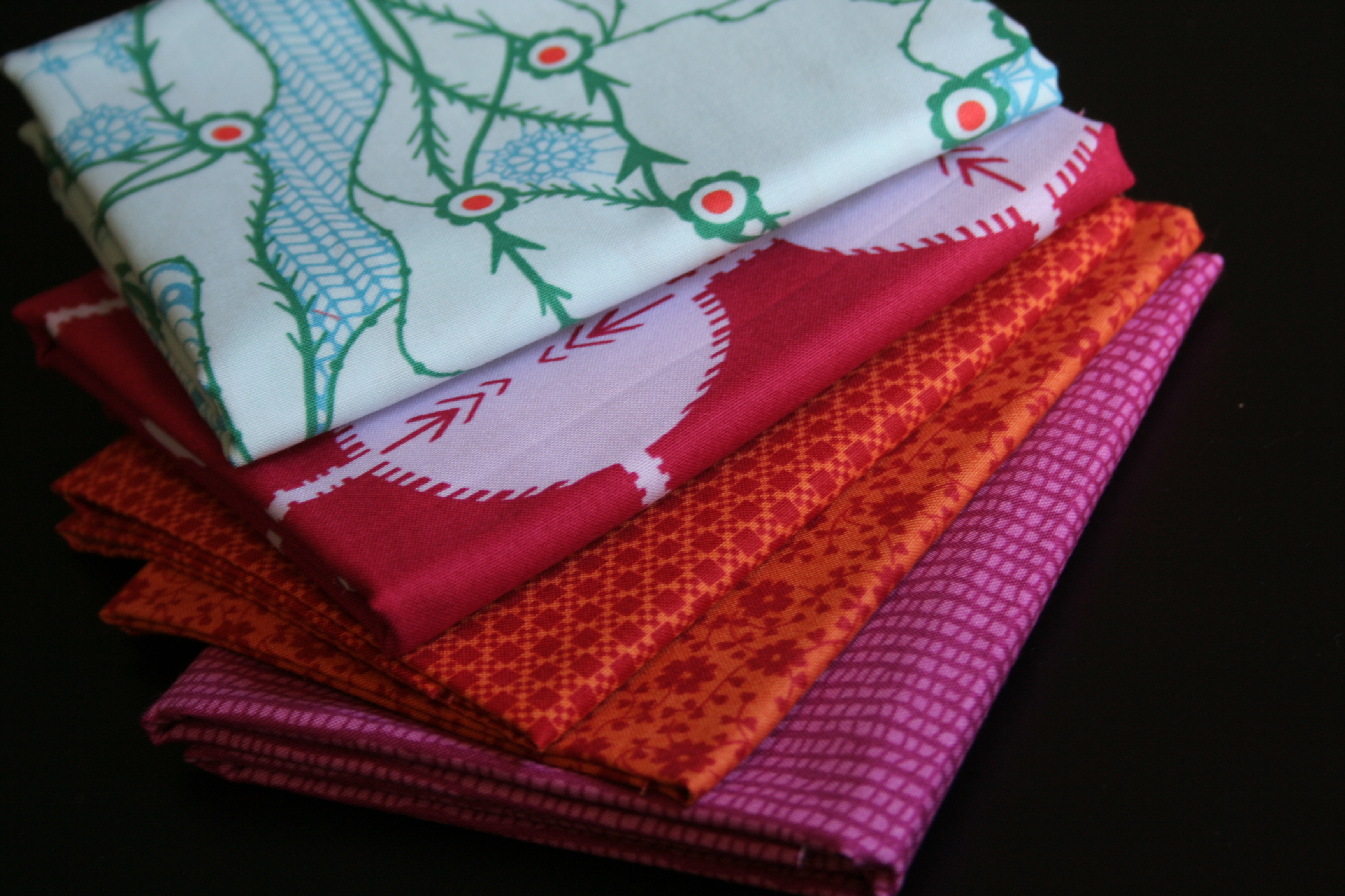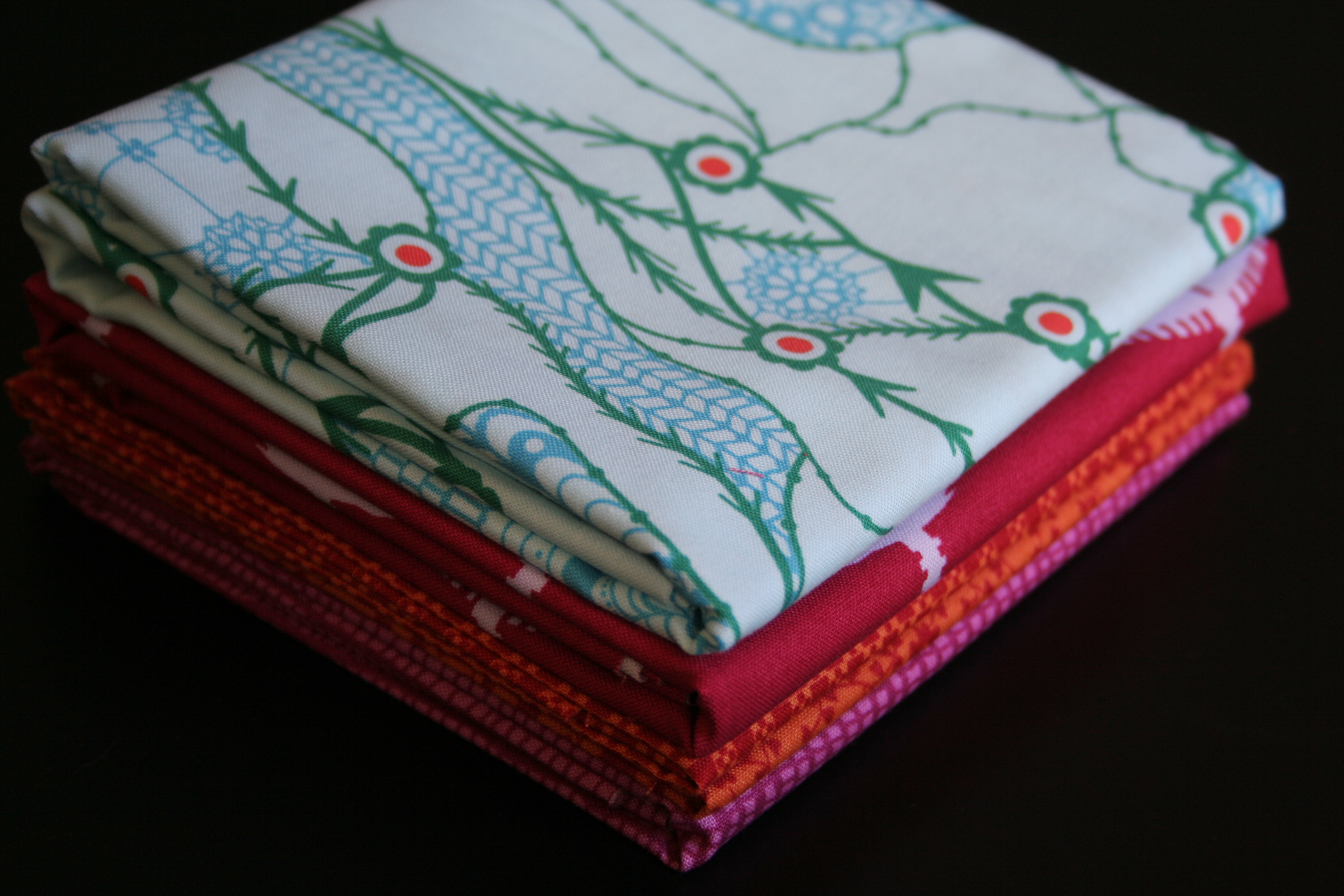 It’s a fabric bundle including half-yards of Migratory Lace Aquatic and Coordinates Plum from Anna Maria Horner’s Field Study Collection and fat quarters of Cross Square in Red, Bleeding Hearts in Red, and Ladder Dot in Fuschia from Denyse Schmidt’s Chicopee Collection.