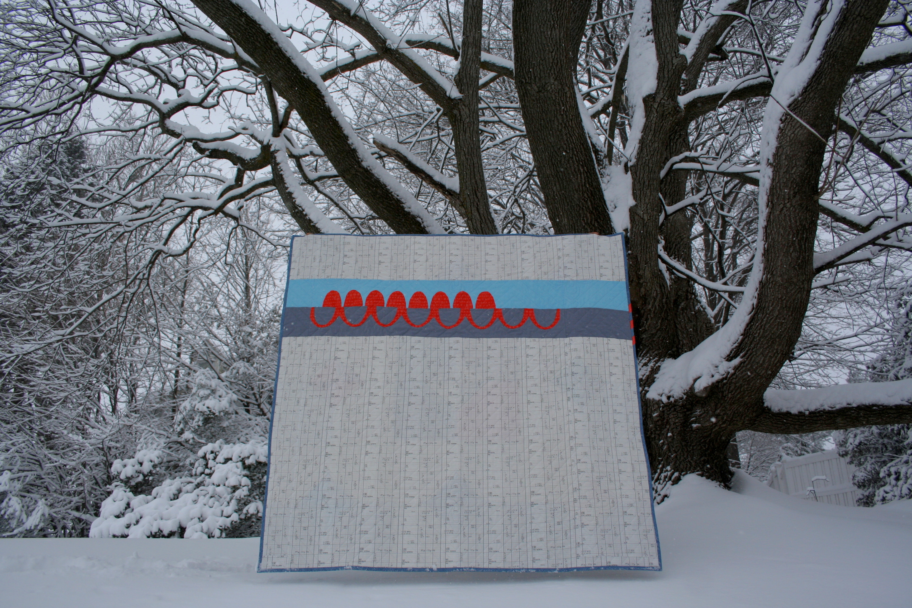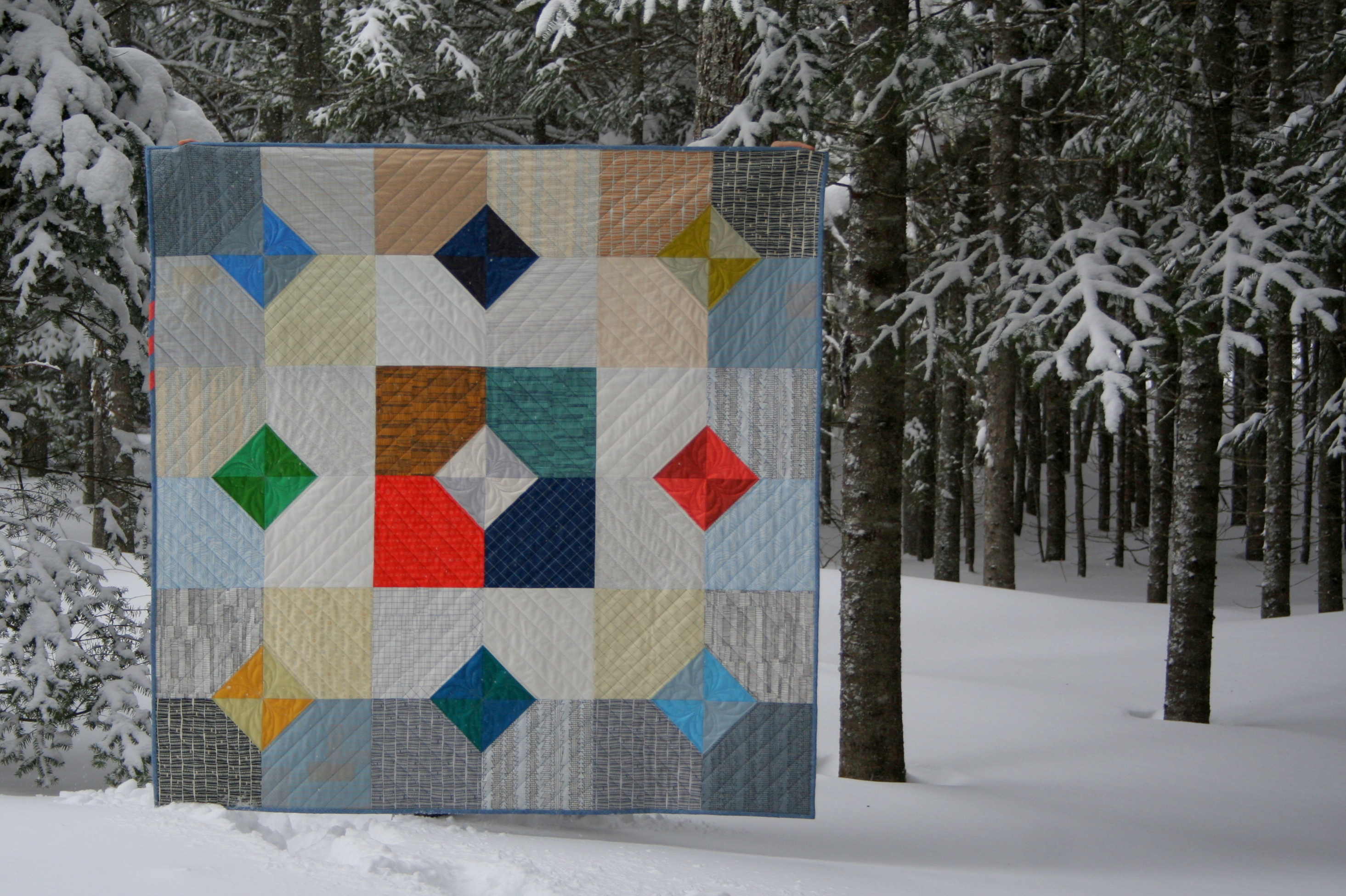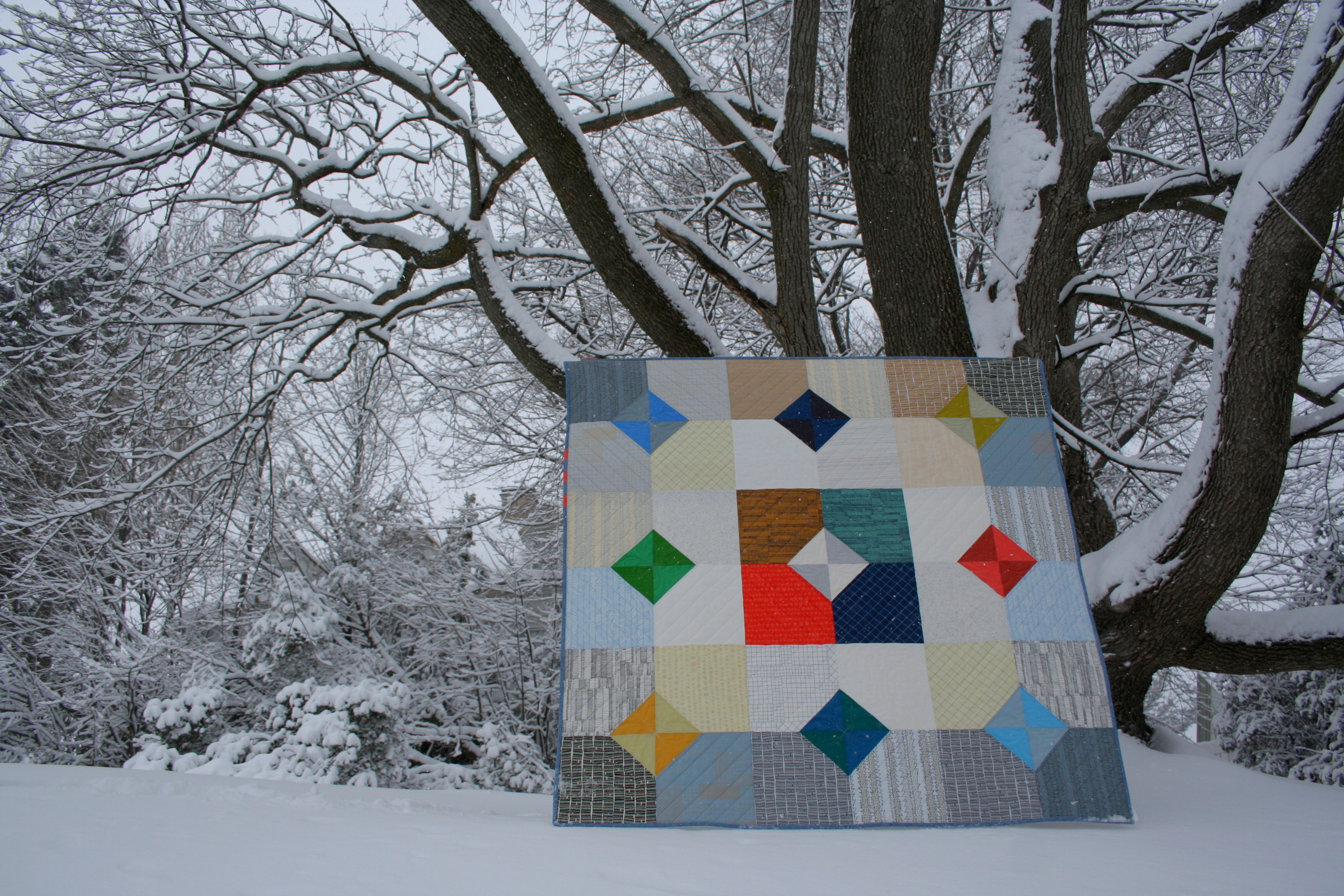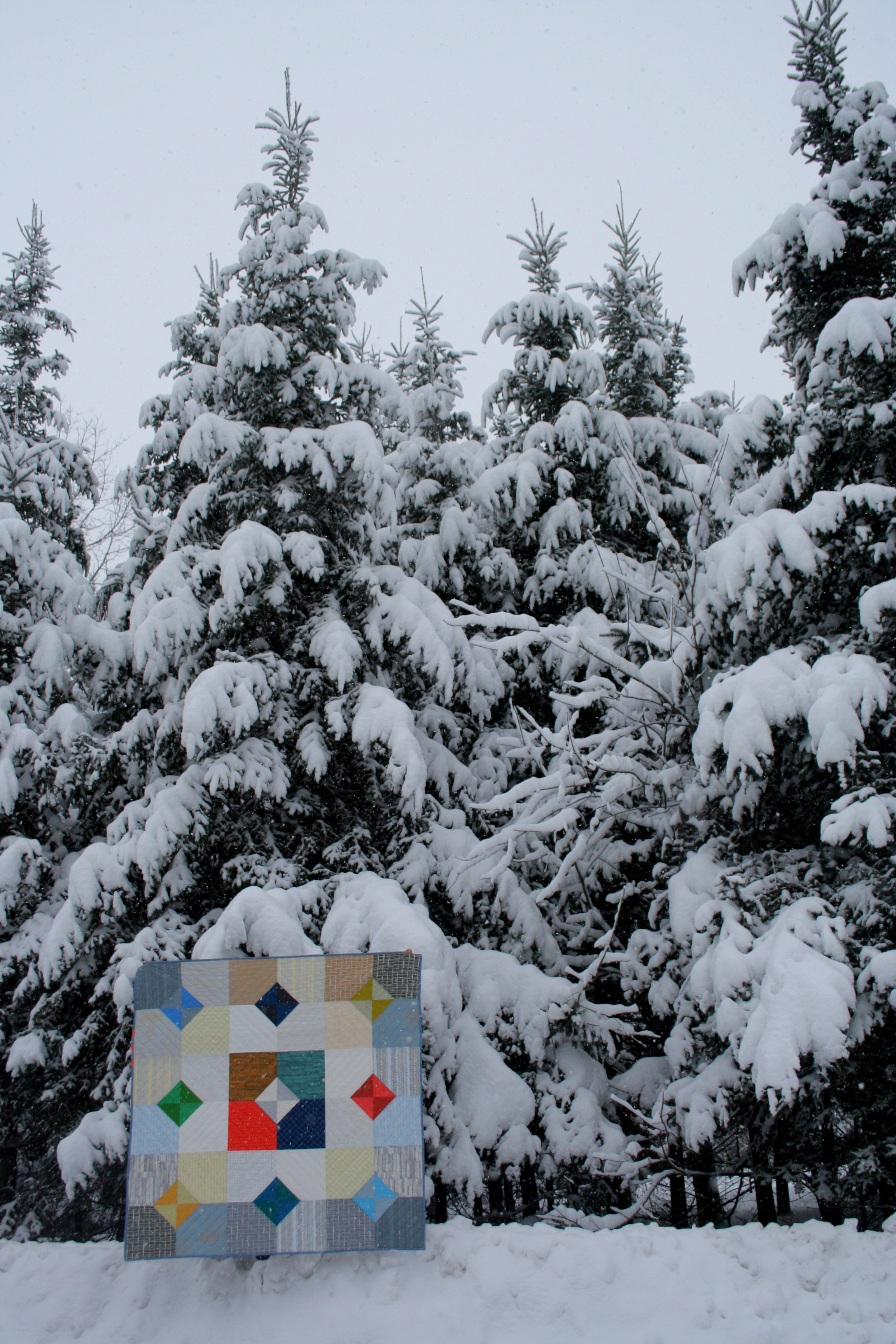 My family helped me photograph the completed quilt during one of our recent blizzards (there seems to be one every few days). We had a little bit too much fun, as you can see.