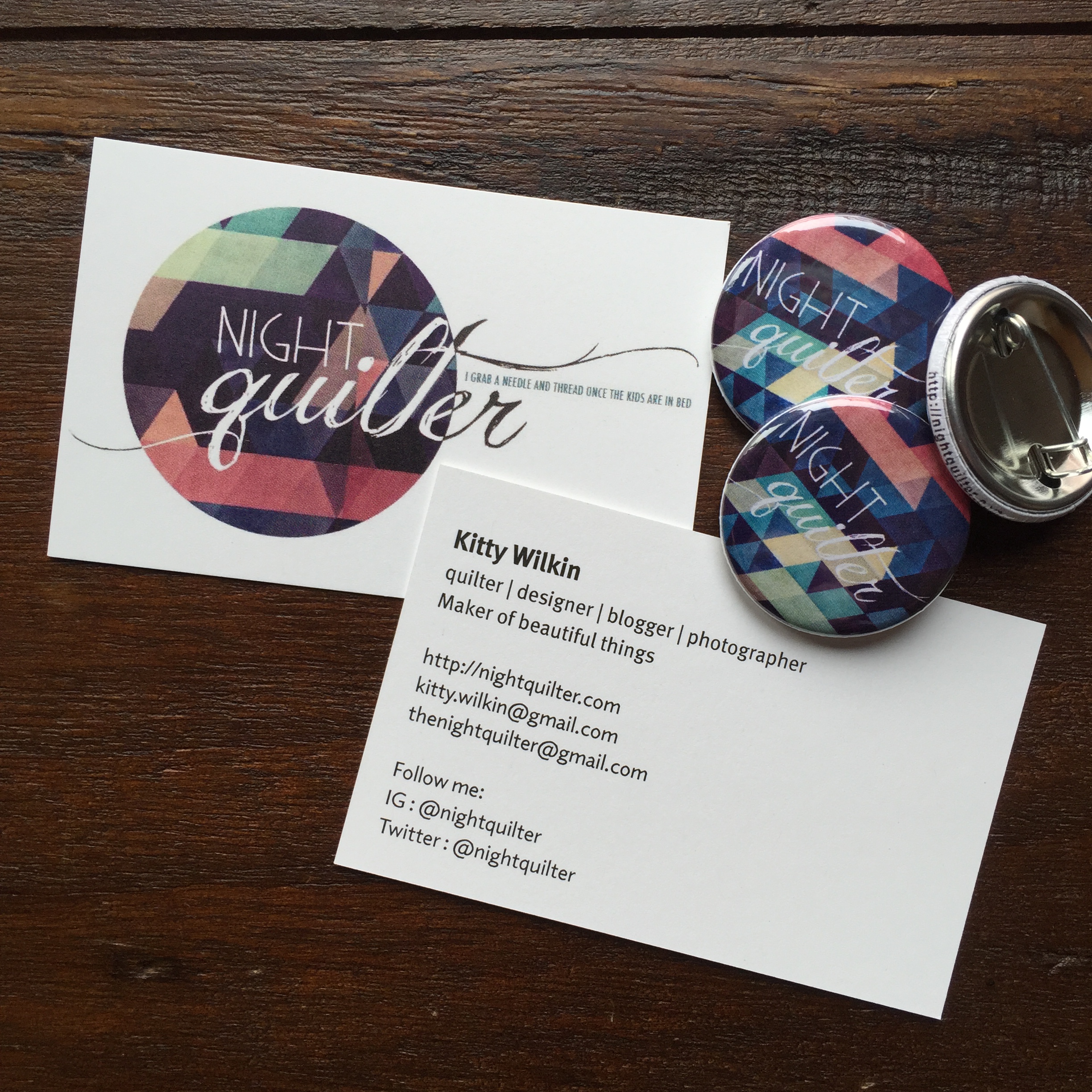 Yvonne of Quilting Jetgirl proposed a fun idea a month or so ago, where we dress up as our QuiltCon Alter Egos for the Moda Dance Party Thursday night. The idea was to dress like your blog name, since everyone will recognize blogosphere monikers far more easily than actual names or faces. I decided to make a belt reflecting my new Night Quilter logo (see business cards and pins below), and I will be wearing a navy blue shirt with silver star stickers all over it. Night Quilter? I hope it works!