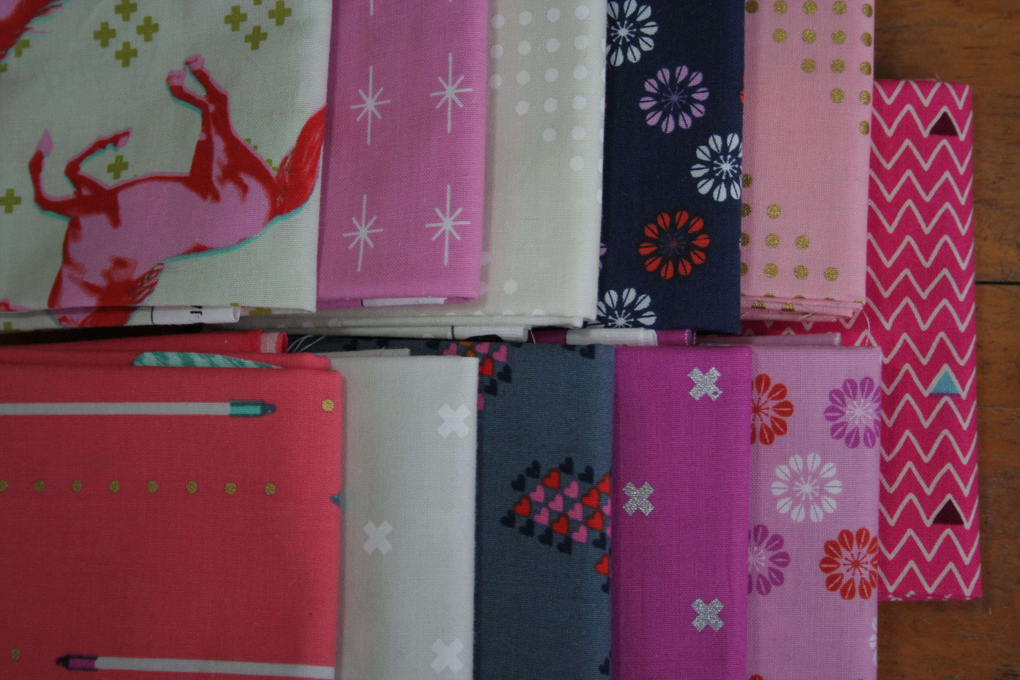 First up was my Fat Quarter Back Sneak purchase from Mariner’s Compass during Superbowl weekend. I’m not much into football and didn’t even watch the game, but I certainly couldn’t resist 10 fat quarters for $15! It’s my first Cotton + Steel bundle: the pink Mustangs by Melody Miller and some Basics.
