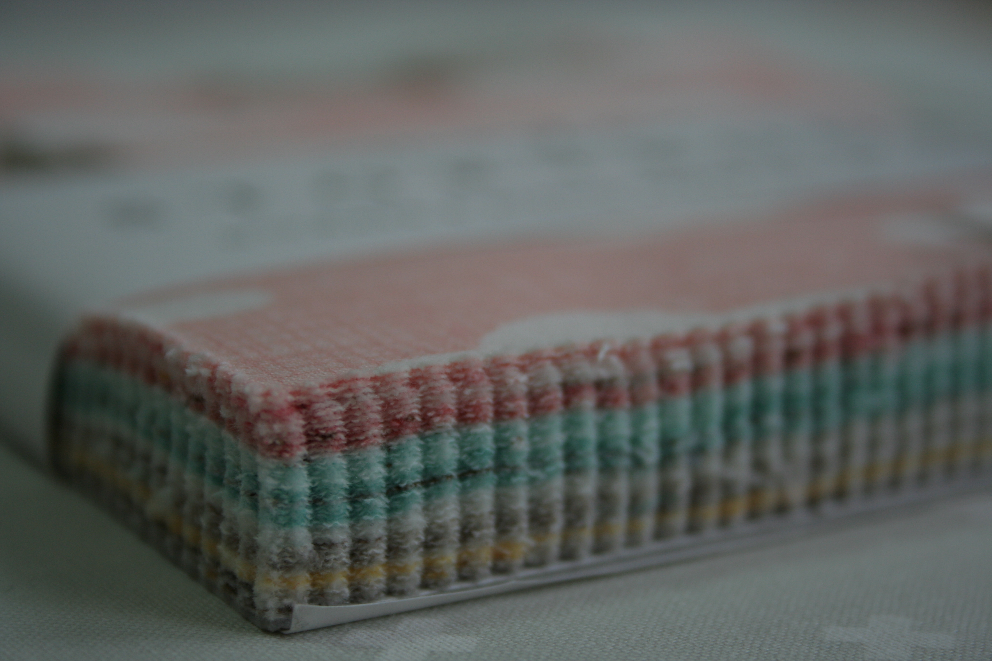 Two quilting thread colors converge.