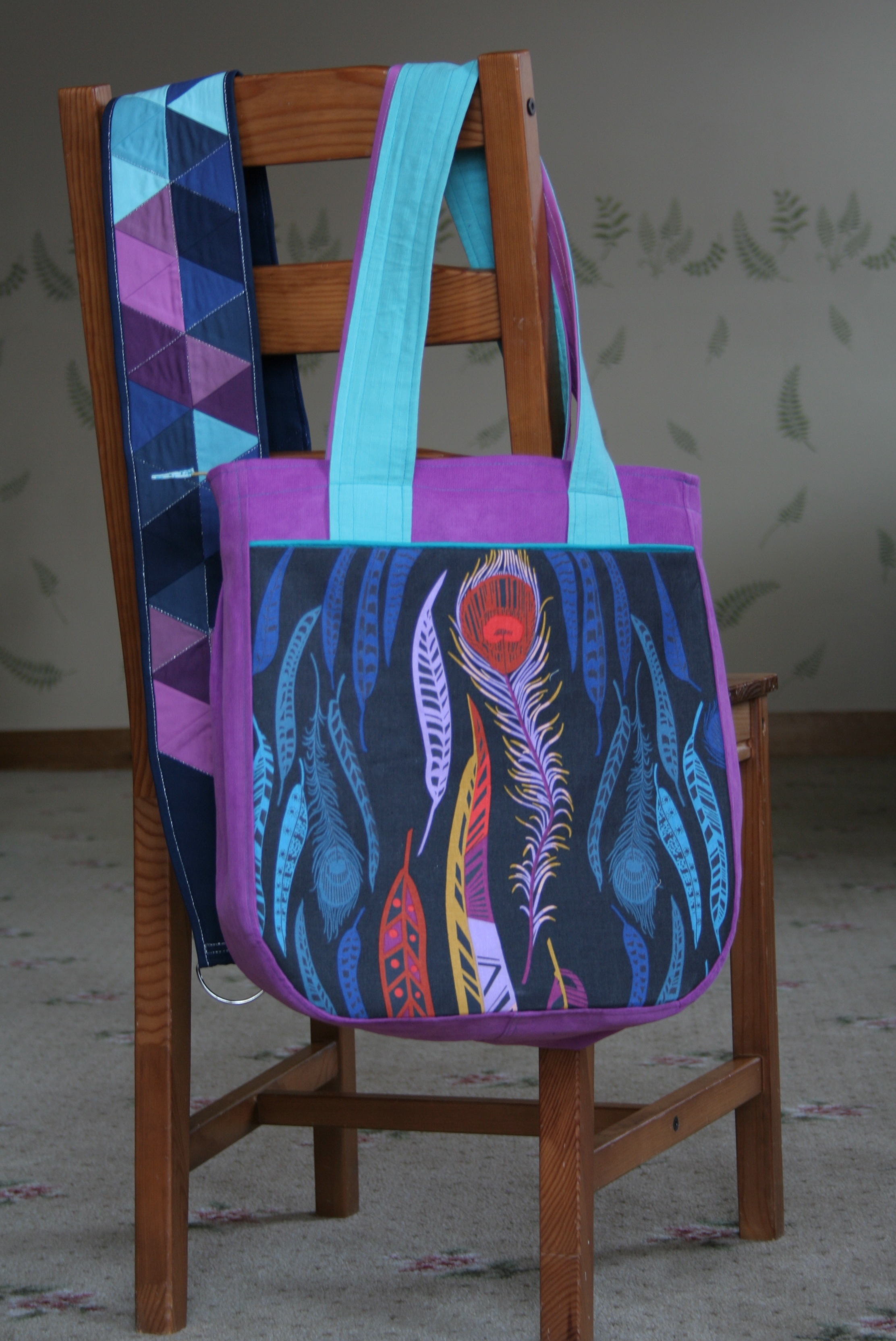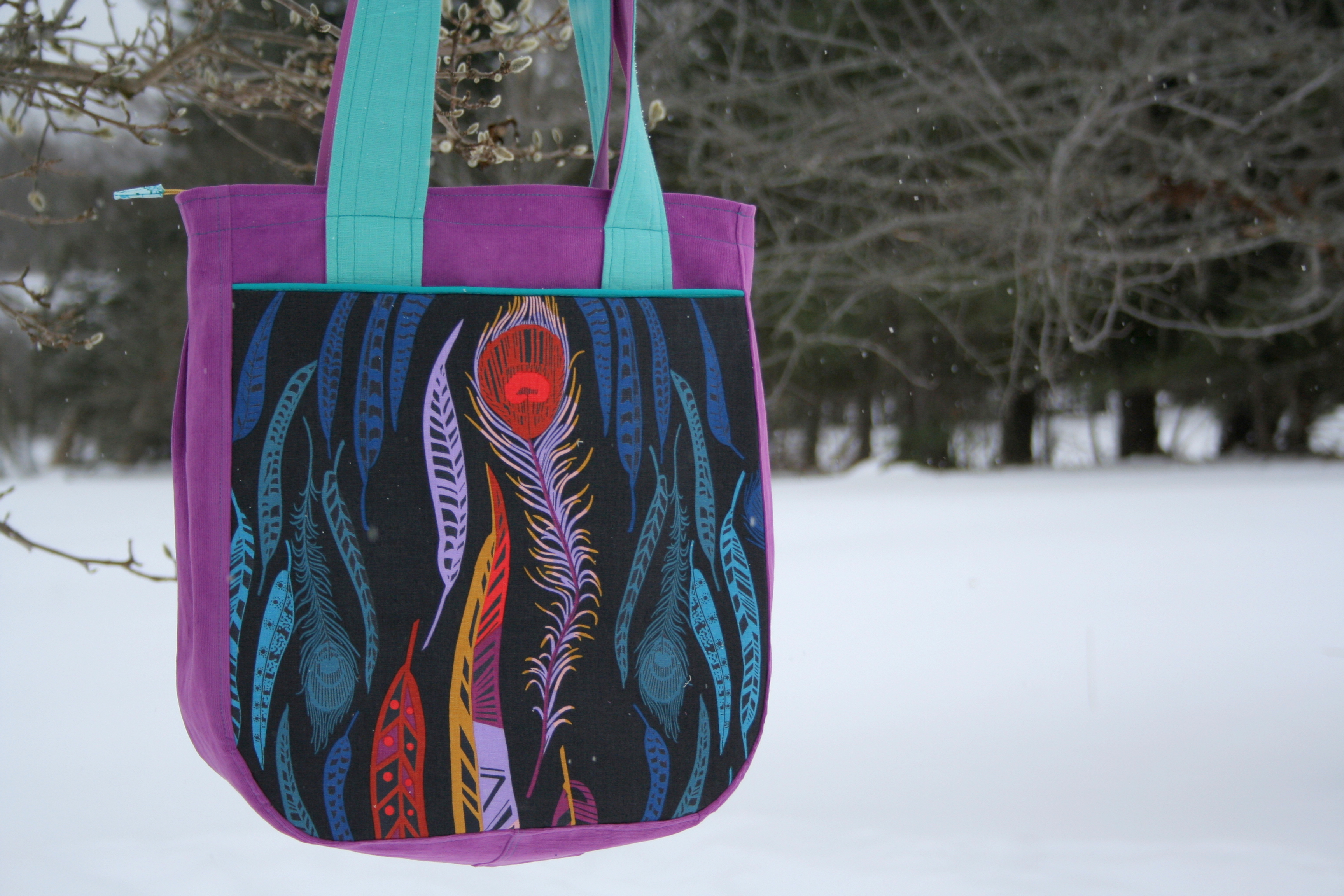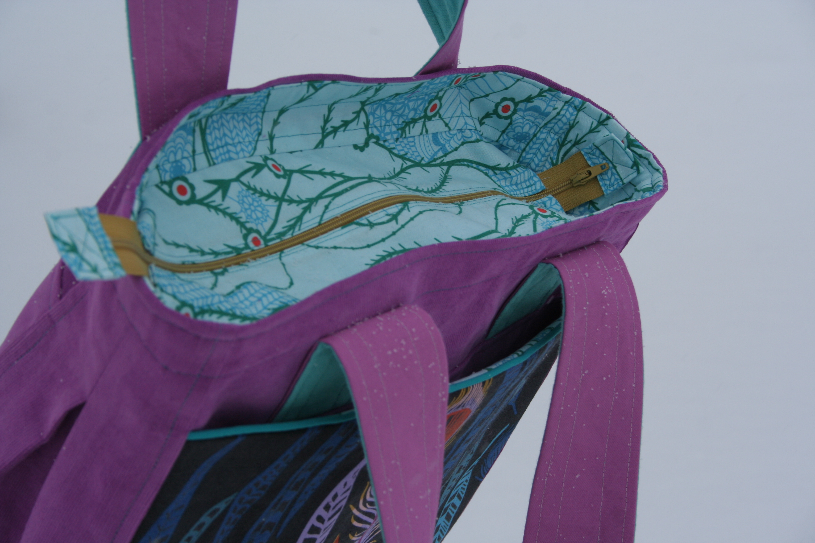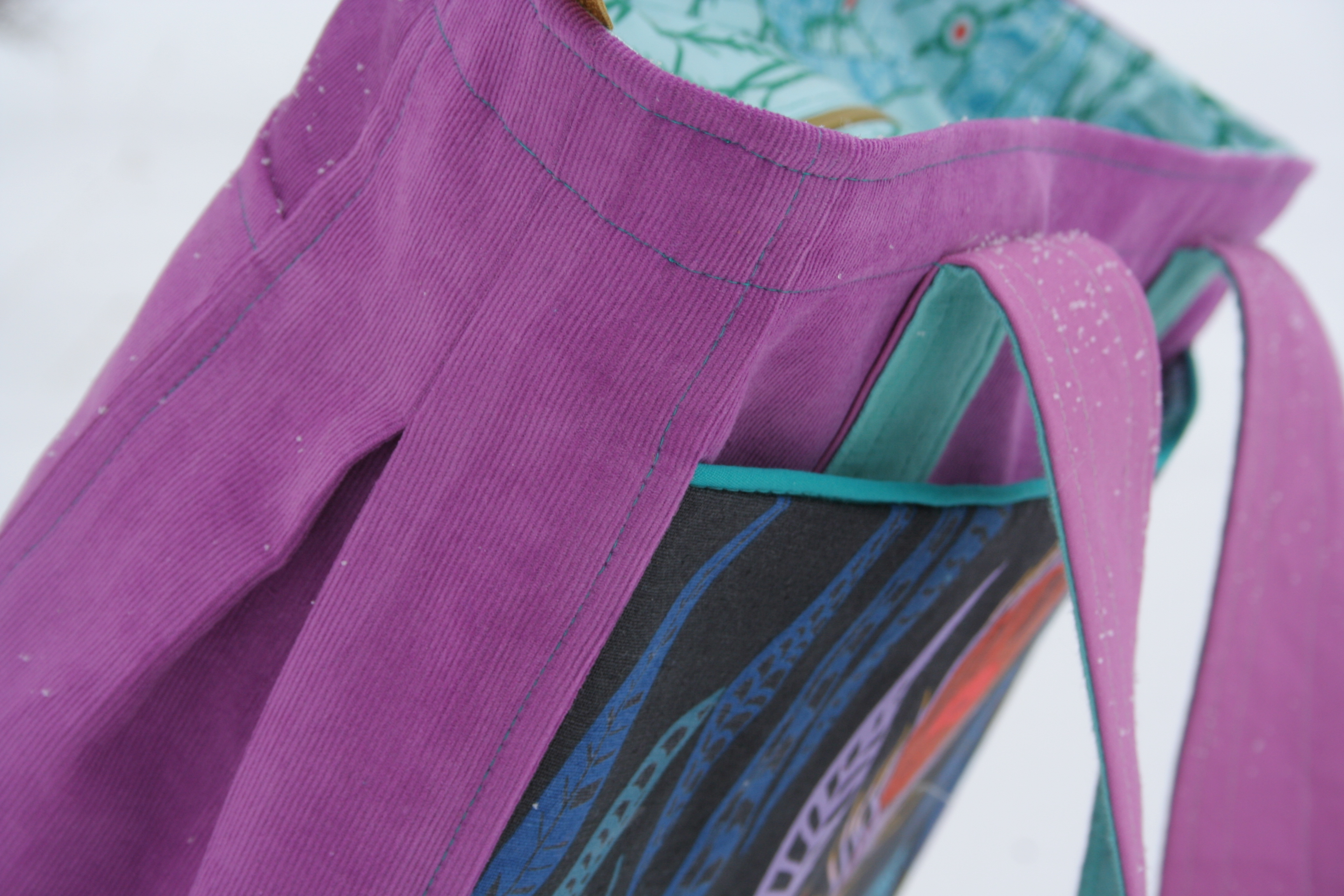 I amazingly finished sewing this Super Tote (pattern by Anna at Noodle-head) so that I will have an awesome handmade bag large enough to carry all my supplies around QuiltCon. Only the second bag I’ve ever made, there are a number of things I messed up or would do differently next time, but I am happy with it! I used Anna Maria Horner’s line Field Study for both the front pocket and lining, and used Robert Kaufman 21-wale corduroy for the body.