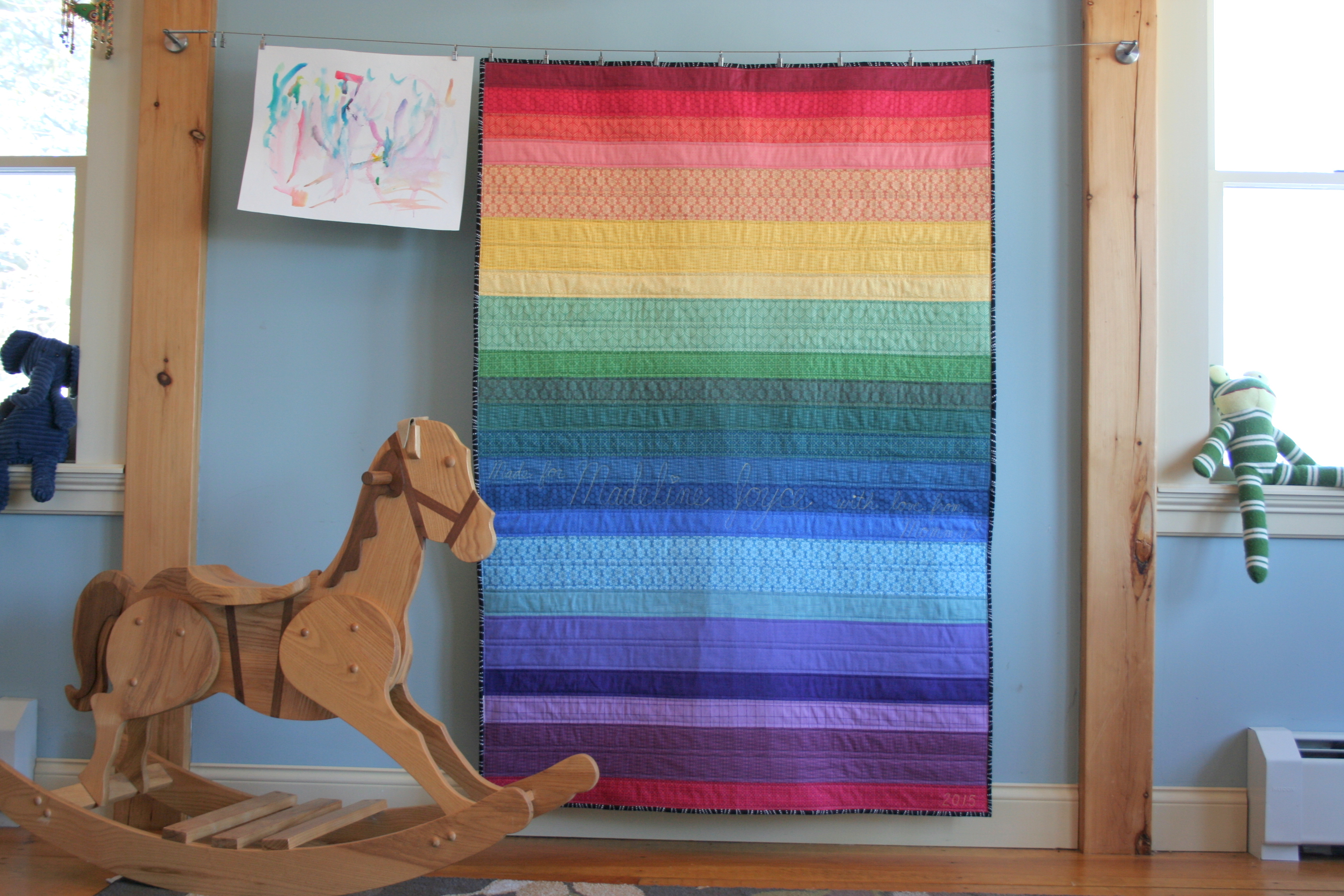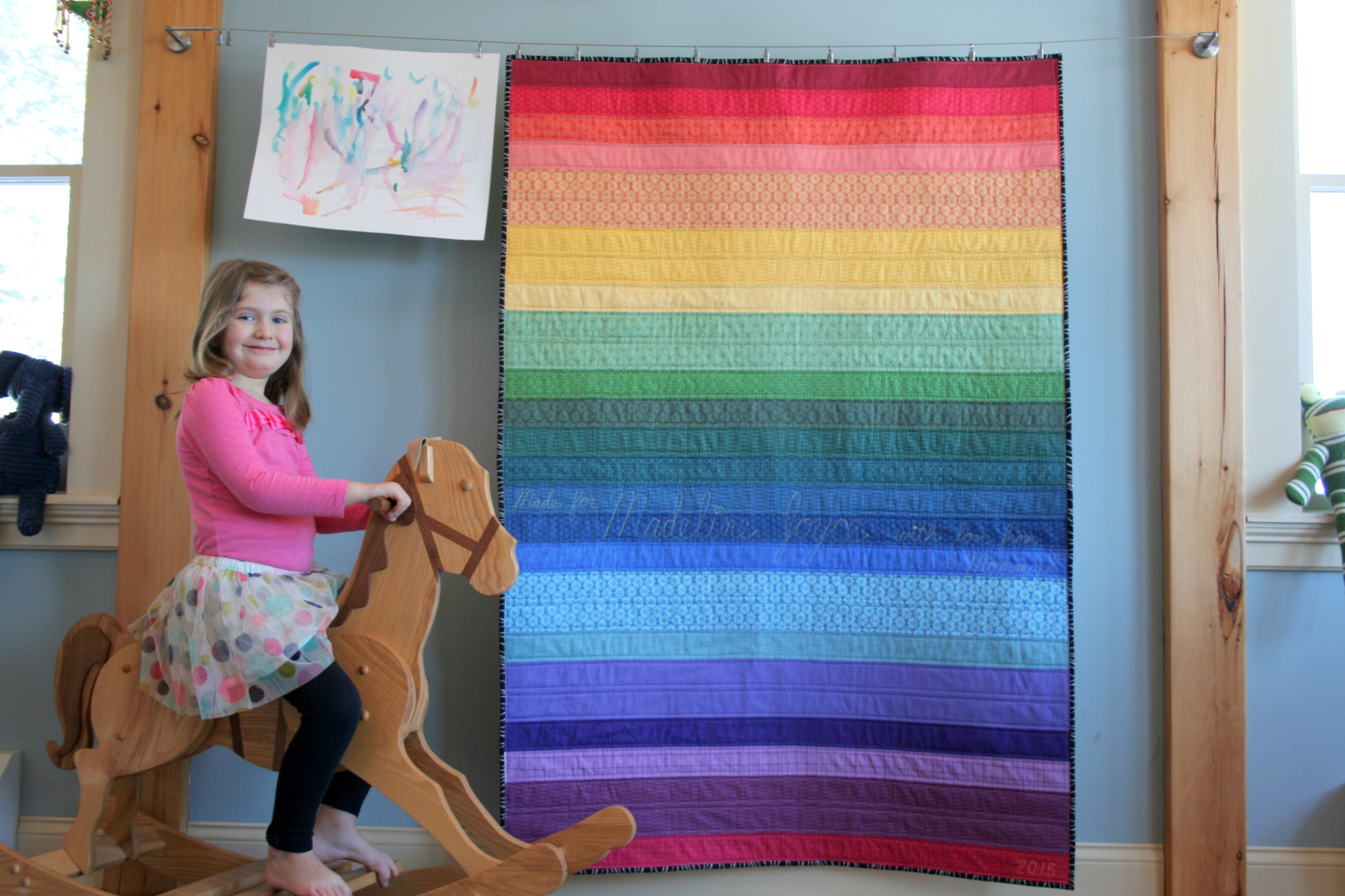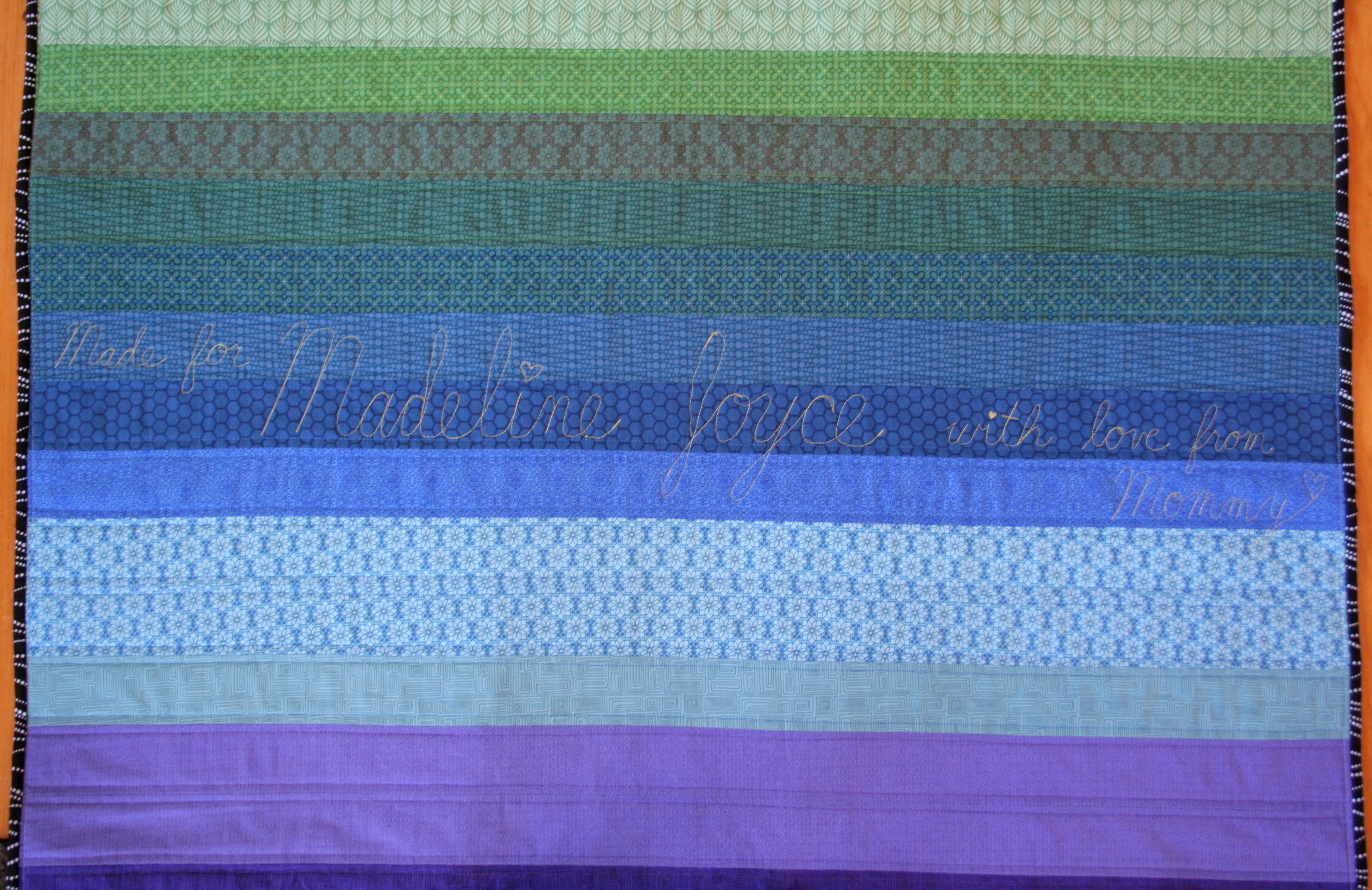 Quilting: Straight line echo quilting 1/4″ from each seam; Free motion quilted dedication: “Made for Madeline Joyce with love from Mommy” “2015”
