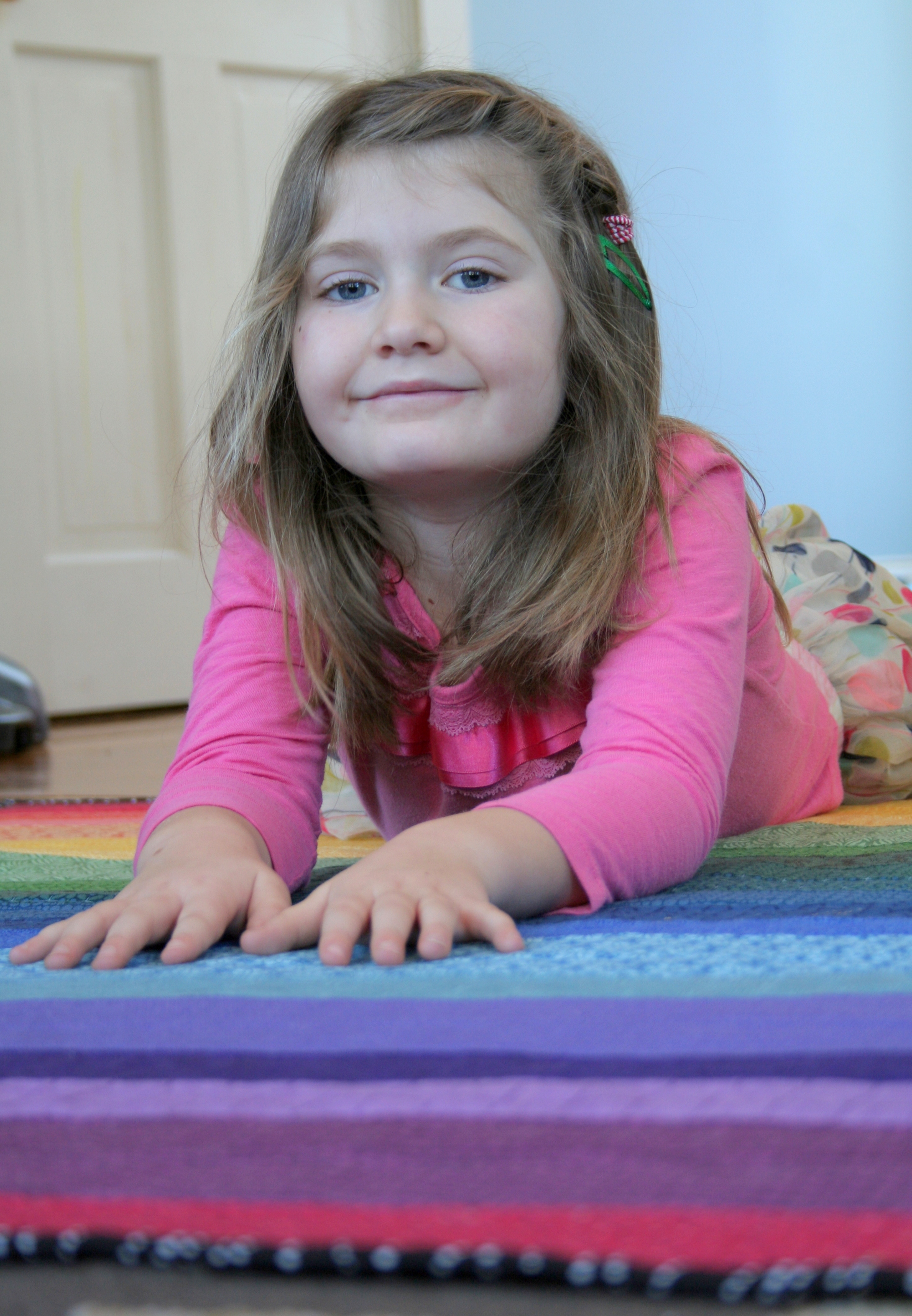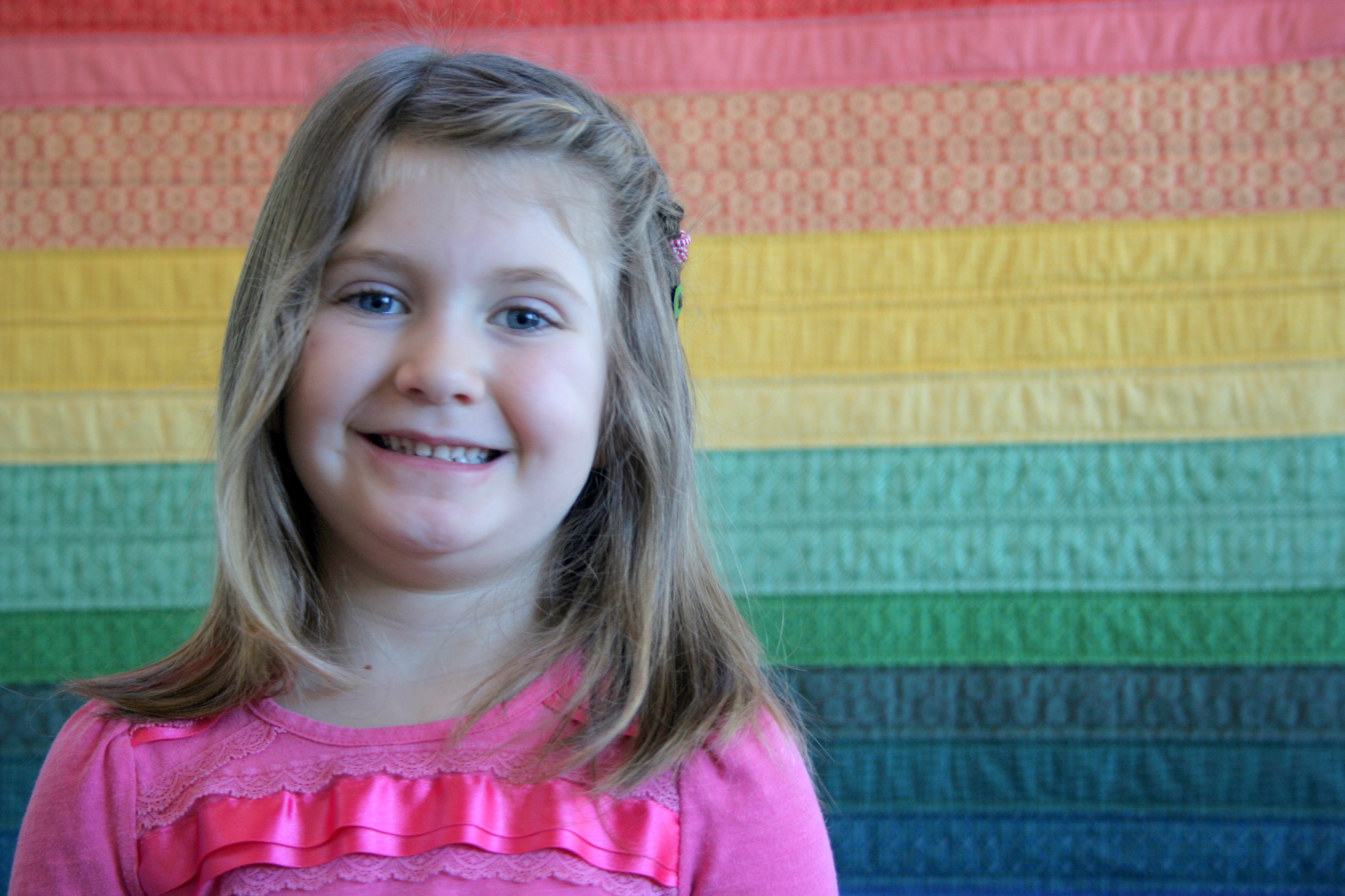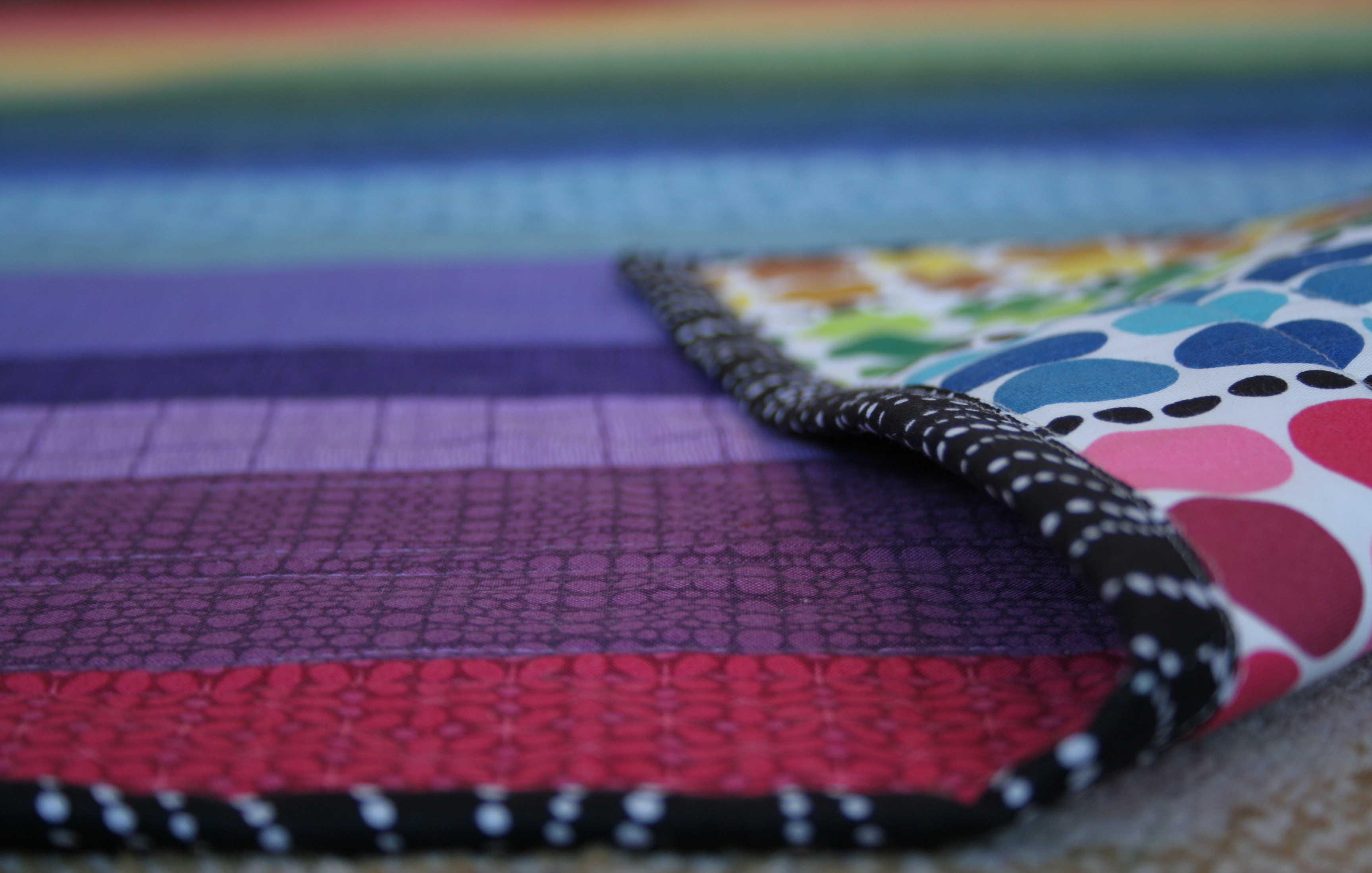 With one day to go, I did it! I finished my daughter’s first quilt–a Rainbow Jellyroll Quilt! I’m excited on many levels, since not only was this my first finished quilt for an immediate family member, it was also my goal for February in A Lovely Year of Finishes. A late night binding session last night and a specially requested free-motion quilted dedication session this morning were the final touches.