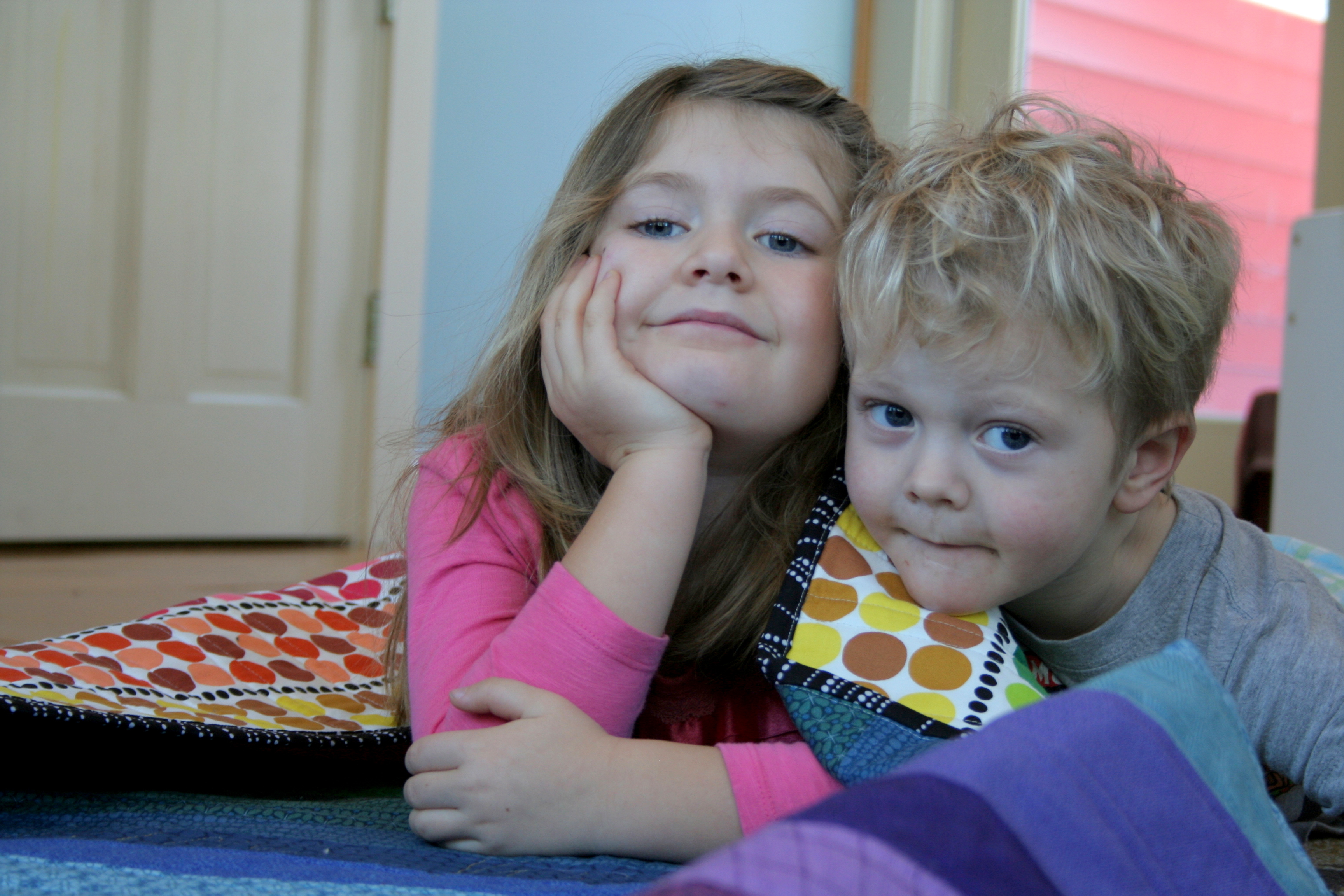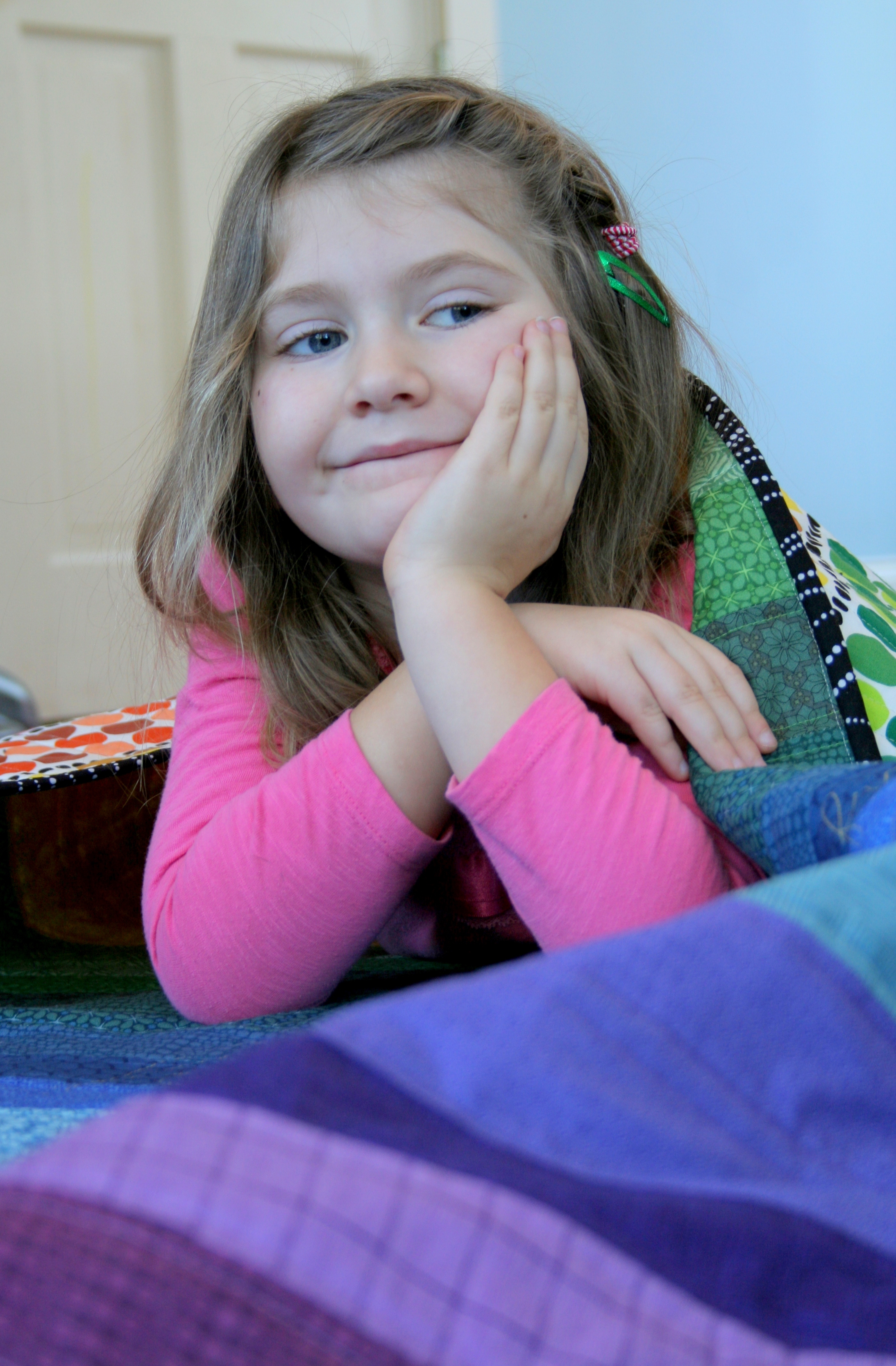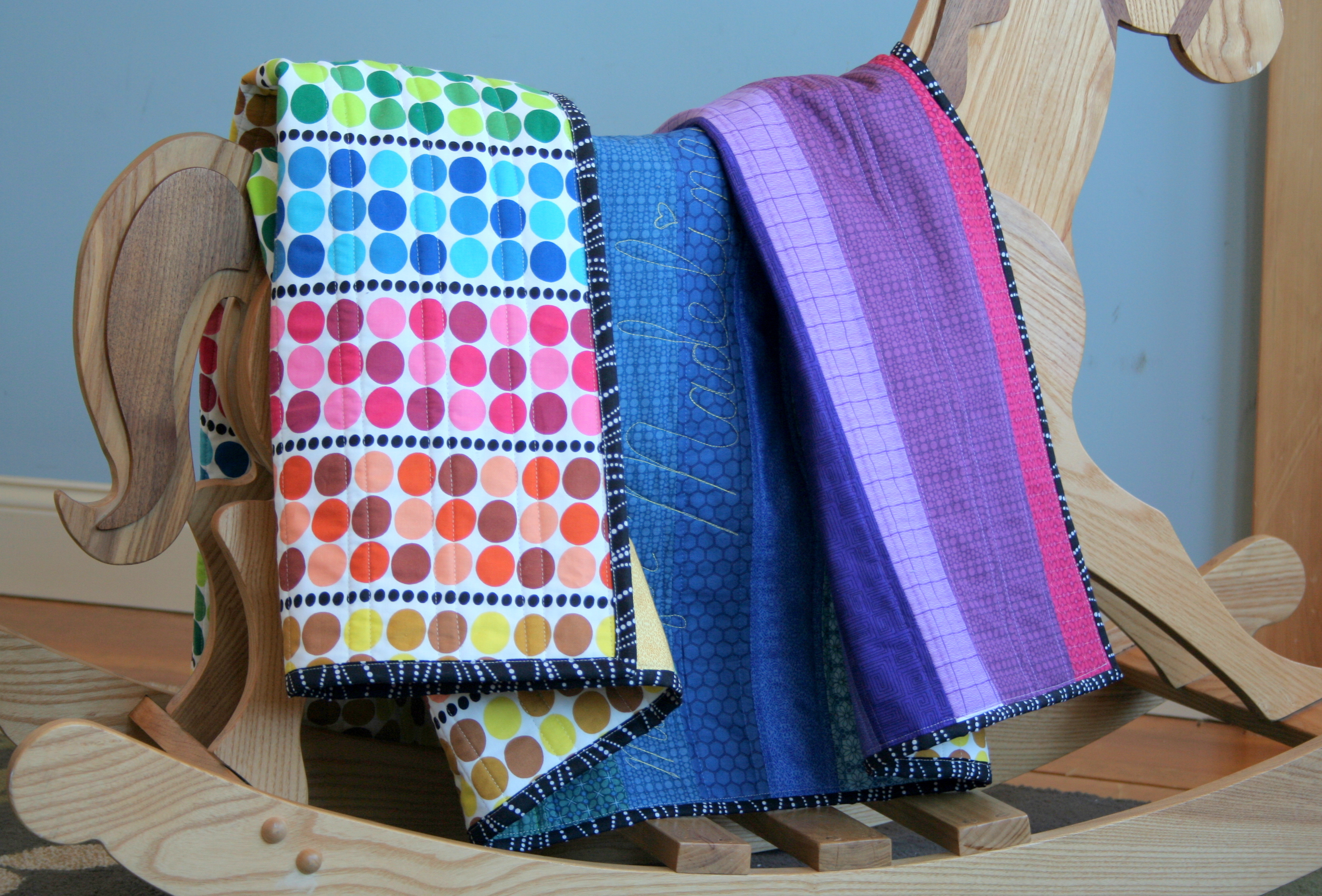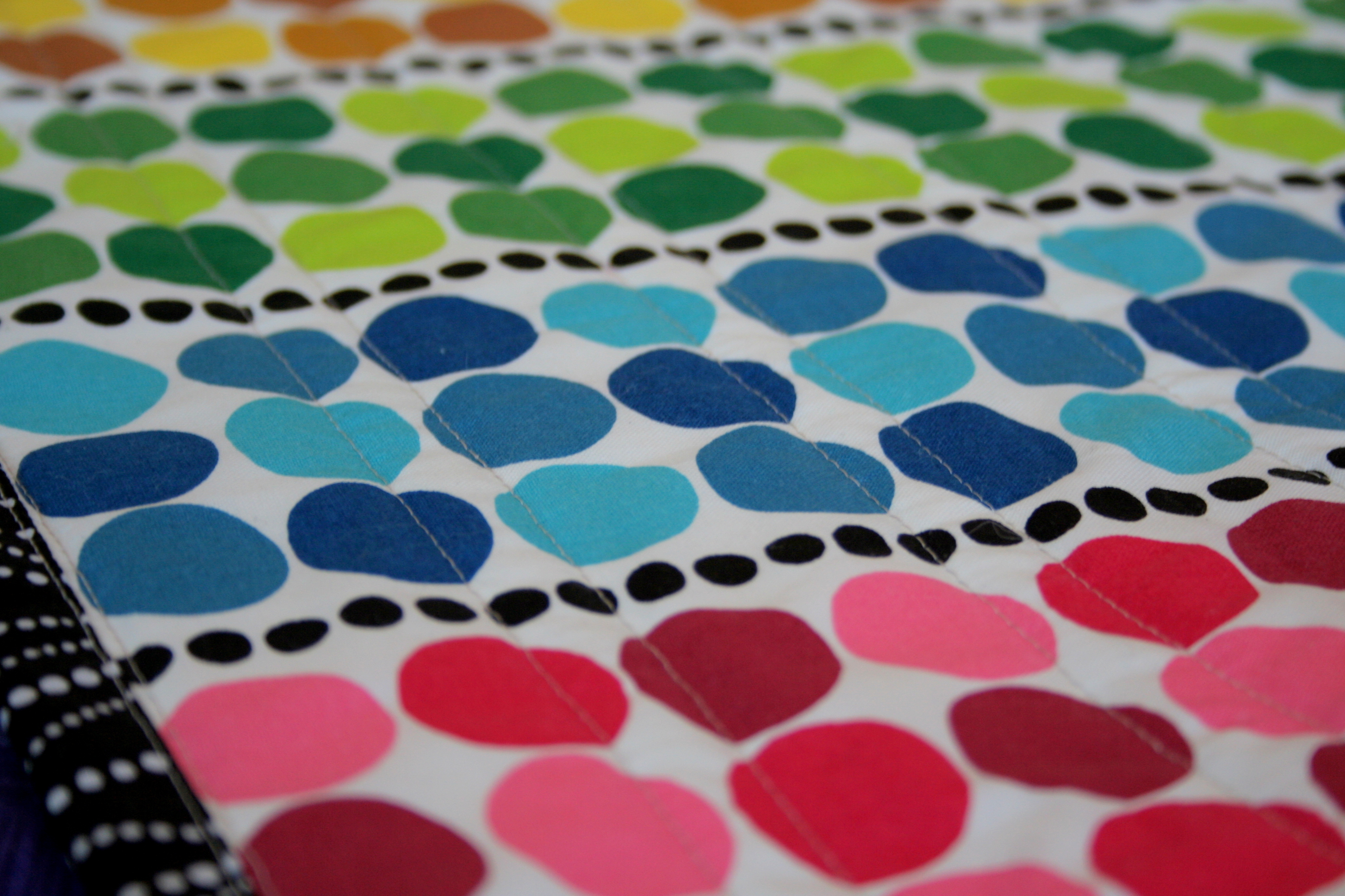 I do like how the quilting from the front looks on the back, even though it’s not perfectly parallel to the dots. Maddie certainly doesn’t love it any less due to its off kilter elements.