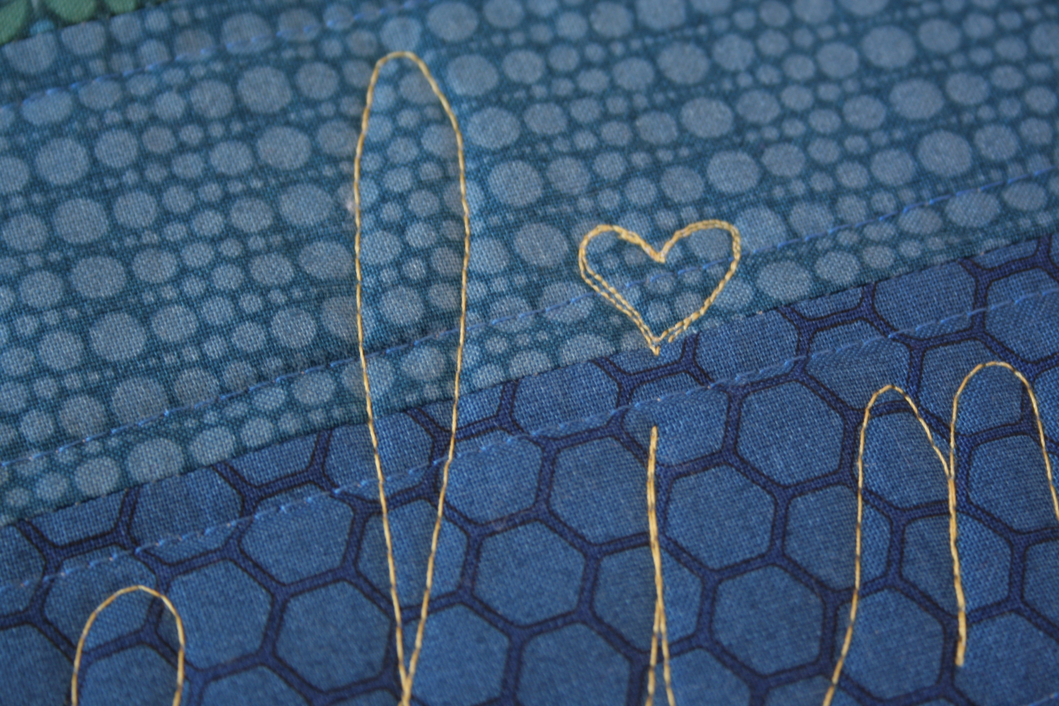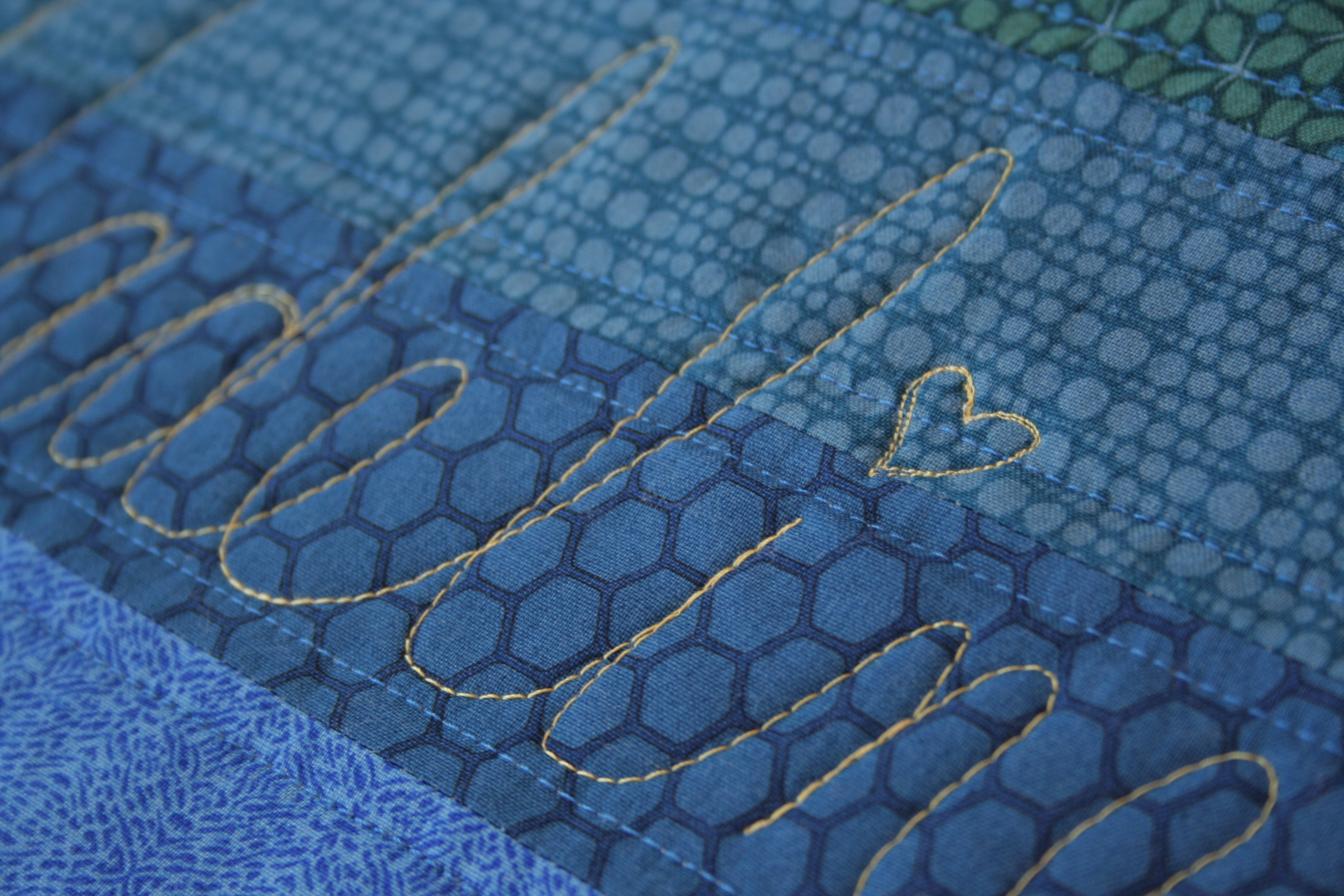 Thread: Aurifil 40wt in coordinating colors (contrasting color used for free motion quilted dedication)