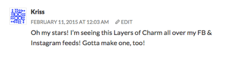 Kriss, I’ve sent you an email requesting your mailing address, so once I hear back from you and your winnings are received, you’ll be well on your way to making your own Layers of Charm quilt!