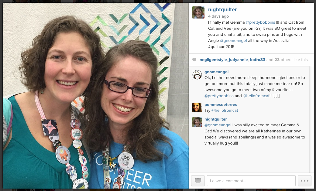 The second “meeting” that stood out as epically awesome wasn’t even technically an in-person meeting! Before heading to Austin, I emailed another close bloggy friend, Angie from Gnome Angel, asking if she was headed to Austin. Sadly, living in Australia and having a little one, she wasn’t attending, but said that some of her Aussie quilting friends would be there and told me to hunt them down. When I found Gemma from Pretty Bobbins, and then finally put it all together that she was one of the Aussie quilters Angie had encouraged me to find (I’m slow), I was SO excited! Trying to resist the urge to jump up and down (okay, maybe I did a little bit) I swapped pins AND hugs with Angie all the way in Australia (thank you, Gemma!!), and was able to tell her and share the excitement immediately via Instagram. The world is an amazing place!
