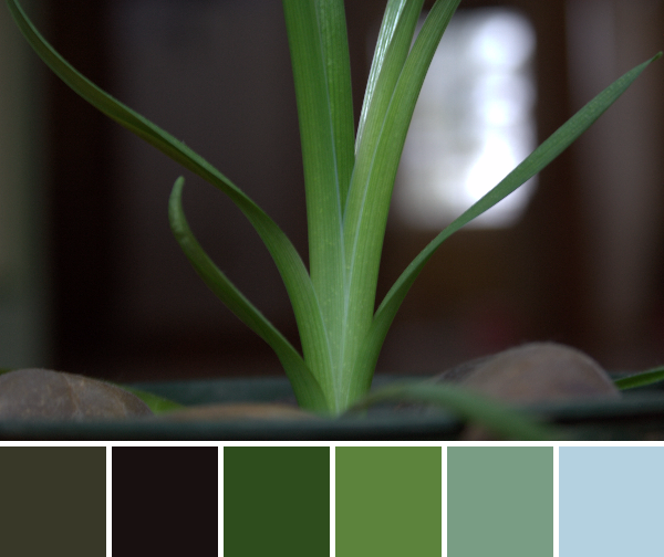 Green, I need green! While the weather has been warming and mud season is almost officially upon us (yes, it’s a real season in Maine–it falls right between winter and spring), there is still a dire lack of green or signs of new life out in the world around us. So today I gathered all the green life I could find and had a little photo shoot. Sure, they are potted, but here is some springy green and life-filled color for your inspiration pleasure. Color palettes are created using Play Crafts’ Palette Builder 2.1 and my photographs.