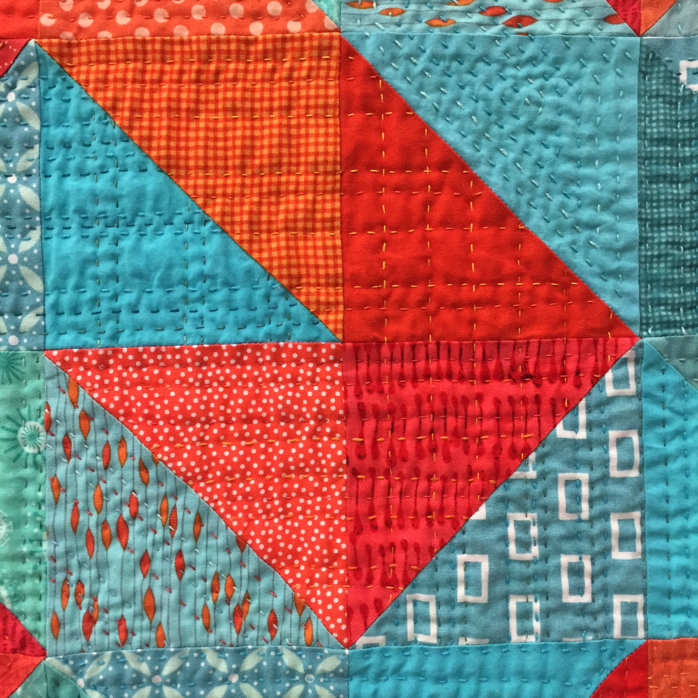 wonky triangle free motion quilting in narrow sashingBeing “wonky” certainly helps, since it means they don’t have to be–and in fact, shouldn’t be–perfect. For a beginner free motion quilter (FMQ) like me, this is the perfect pattern to play with when there’s a quilt full of narrow sashing to quilt!