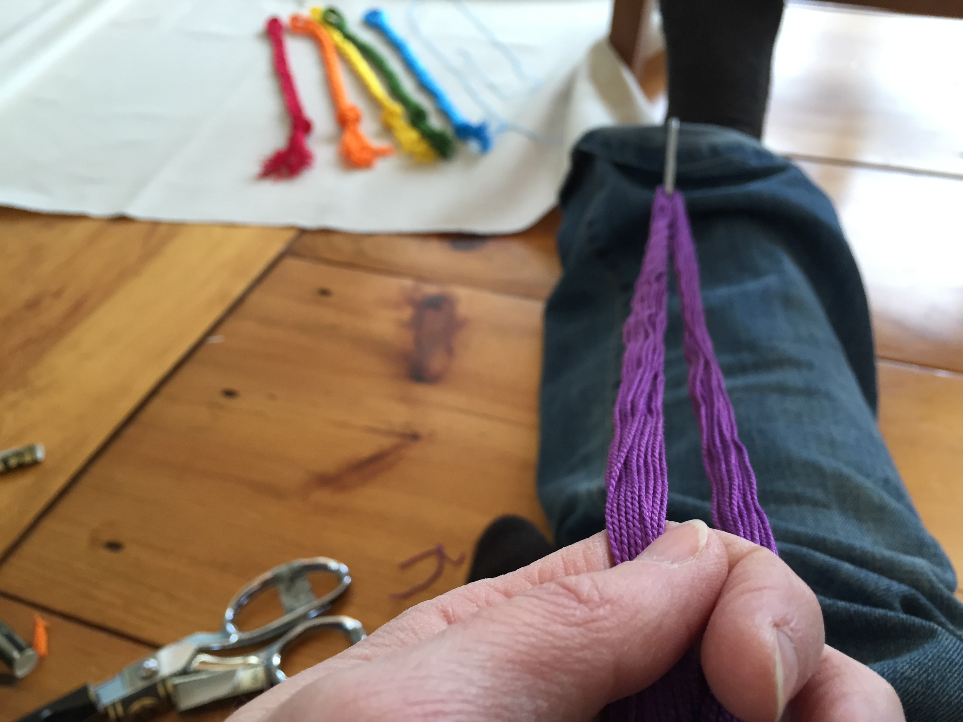rainbow floss braids on wooden dowelI just hold the braid right below the dowel, separate a single strand, pull, and viola! No muss, no fuss.