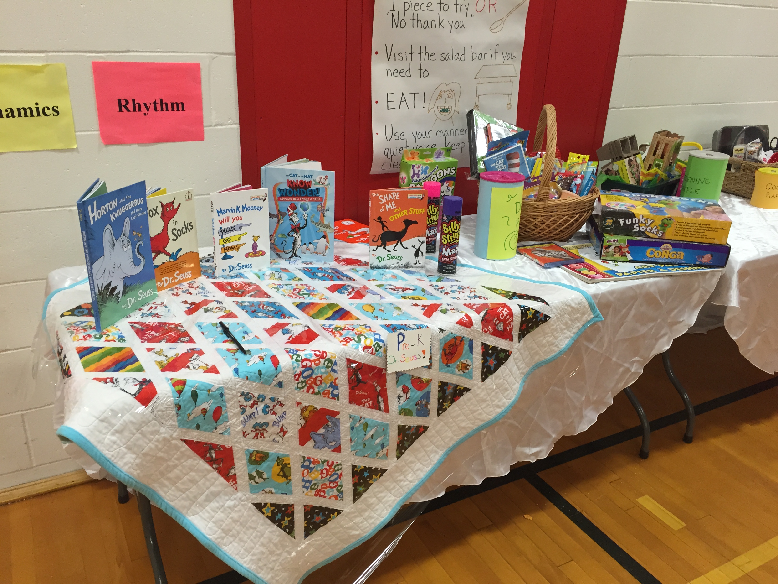 I’m happy to report that the fundraiser Poetry Jam went really well! The school raised over $700 from all of the baskets, which for a small rural school of only 50-60 students is pretty stellar! One of my daughter’s preschool friends won the Dr. Suess basket (and quilt), too, so I’m happy that it will be well loved. I have no idea how much the quilt and basket helped earn, but the ticket box was stuffed to the brim with tickets. I’m pleased as punch at the outcome.