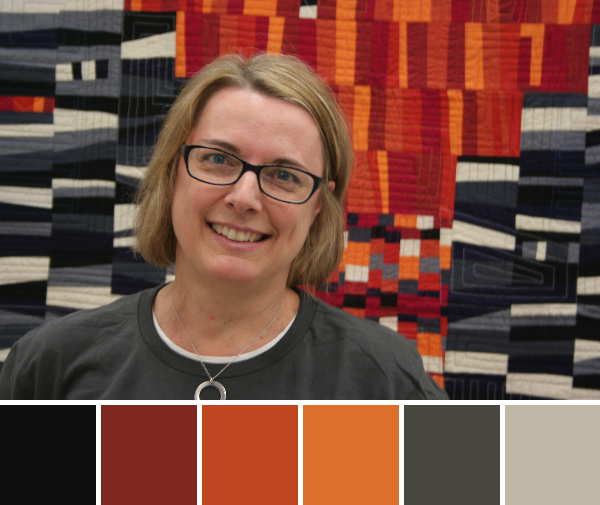 This palette features Krista in front of her gorgeous quilt Chess on the Steps, which hung at QuiltCon. I’m intrigued by this quilt, which she calls “improv under the influence”, since it’s a quilt with a very improv feel, but created using traditional chain piecing methods. Those who know me know that I struggle with improv, but I feel like this quilt may be the place to begin! Fortunately, it was the pattern of the month in September 2014 and is available for free for members of the Modern Quilt Guild.