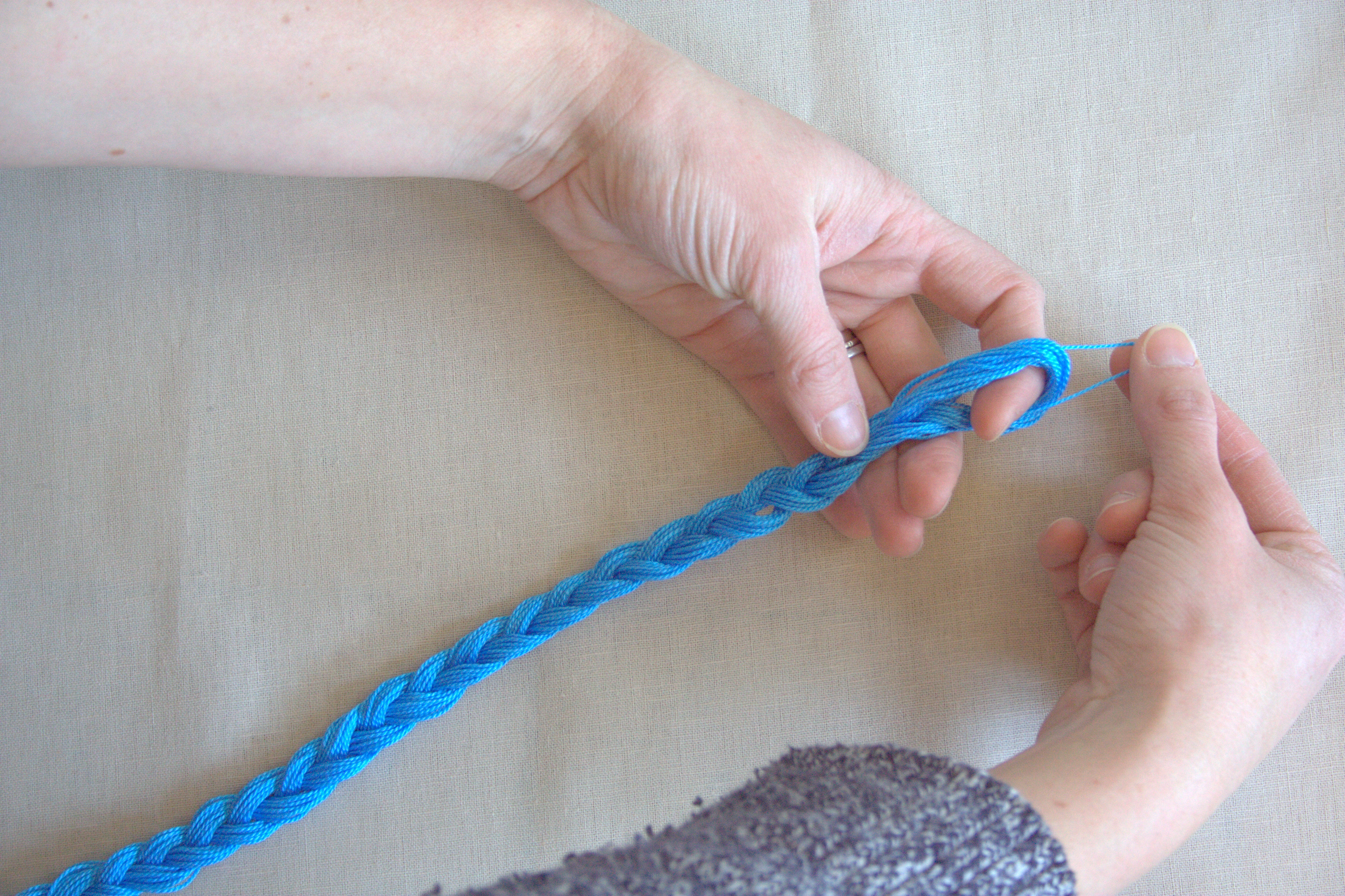 Step 7-Using a separate, short length of floss, tie a knot around the end of your braid to hold it in place.