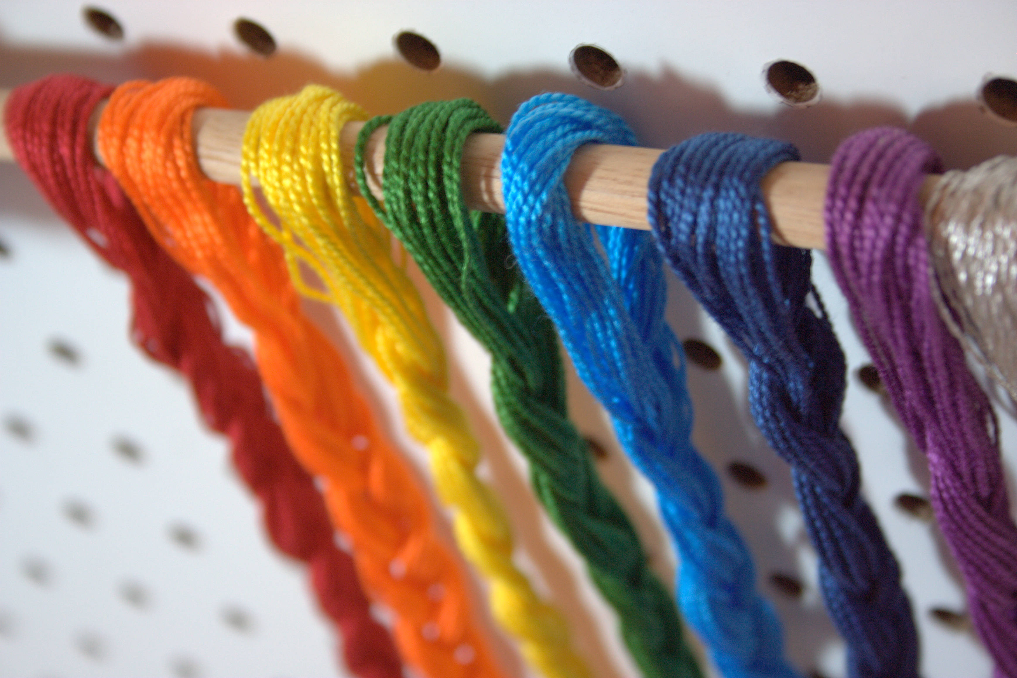 I think this method is genius, since now not only is my floss gorgeously organized and displayed, but I can get a single strand without even taking the braid off the wooden dowel!