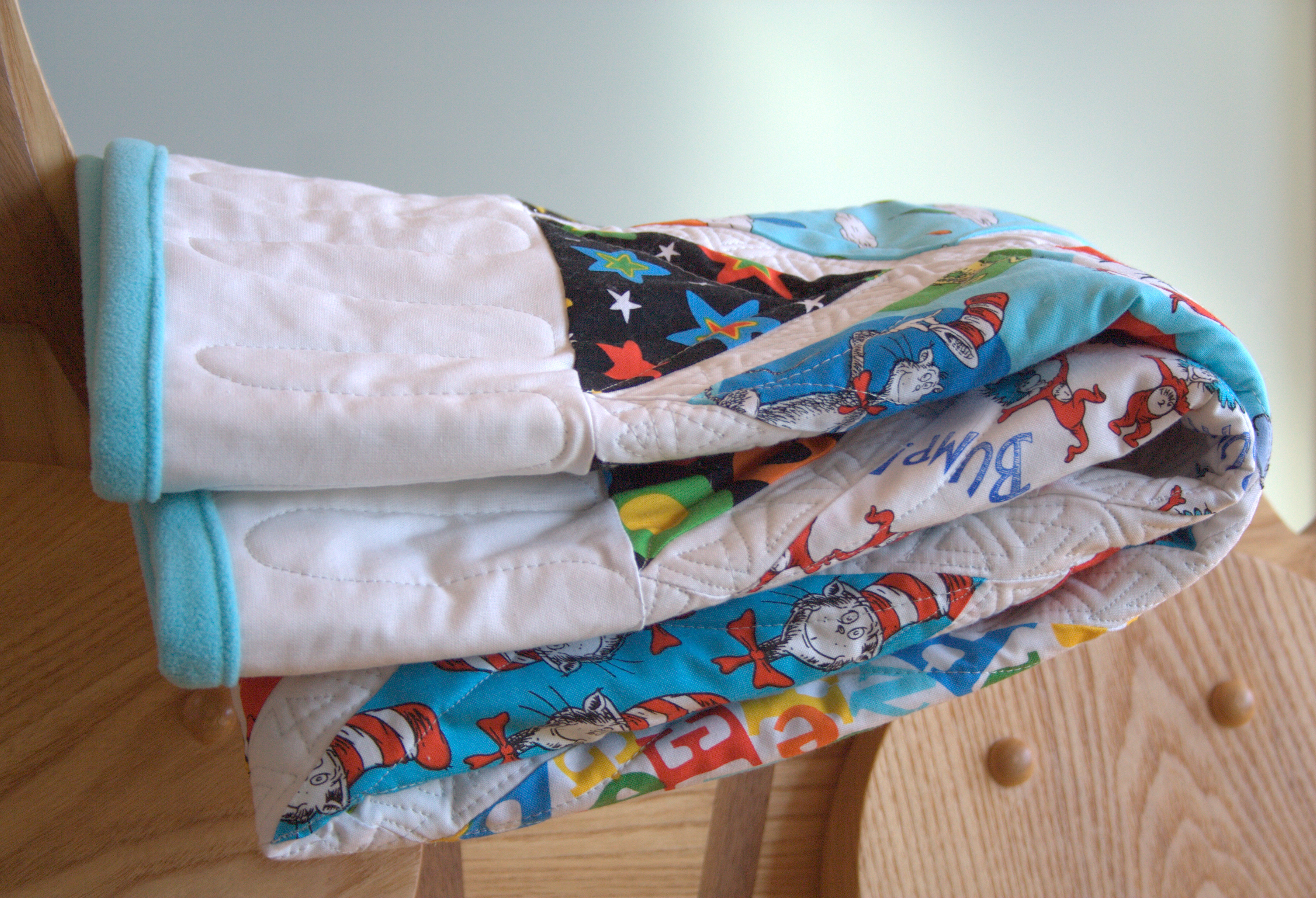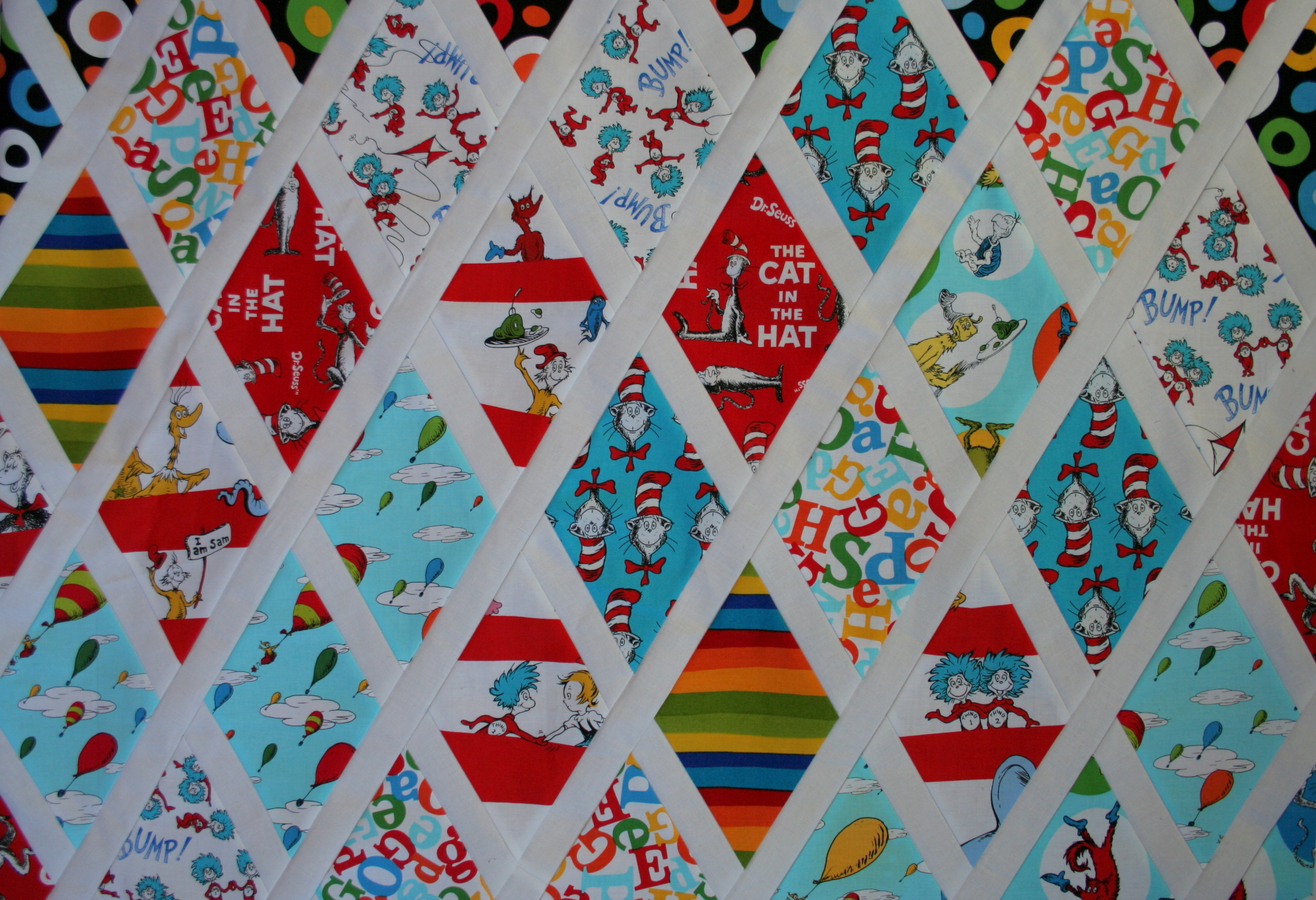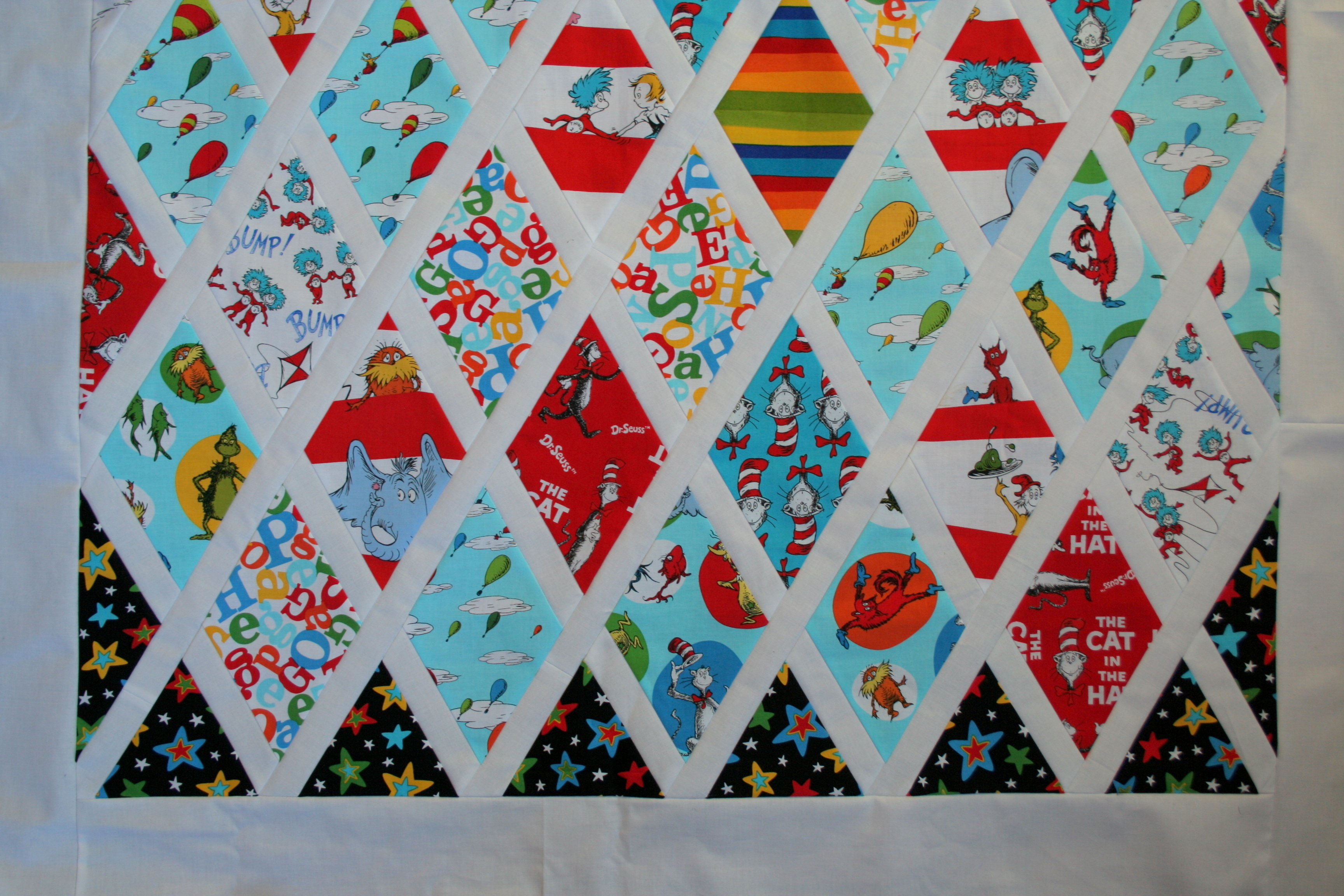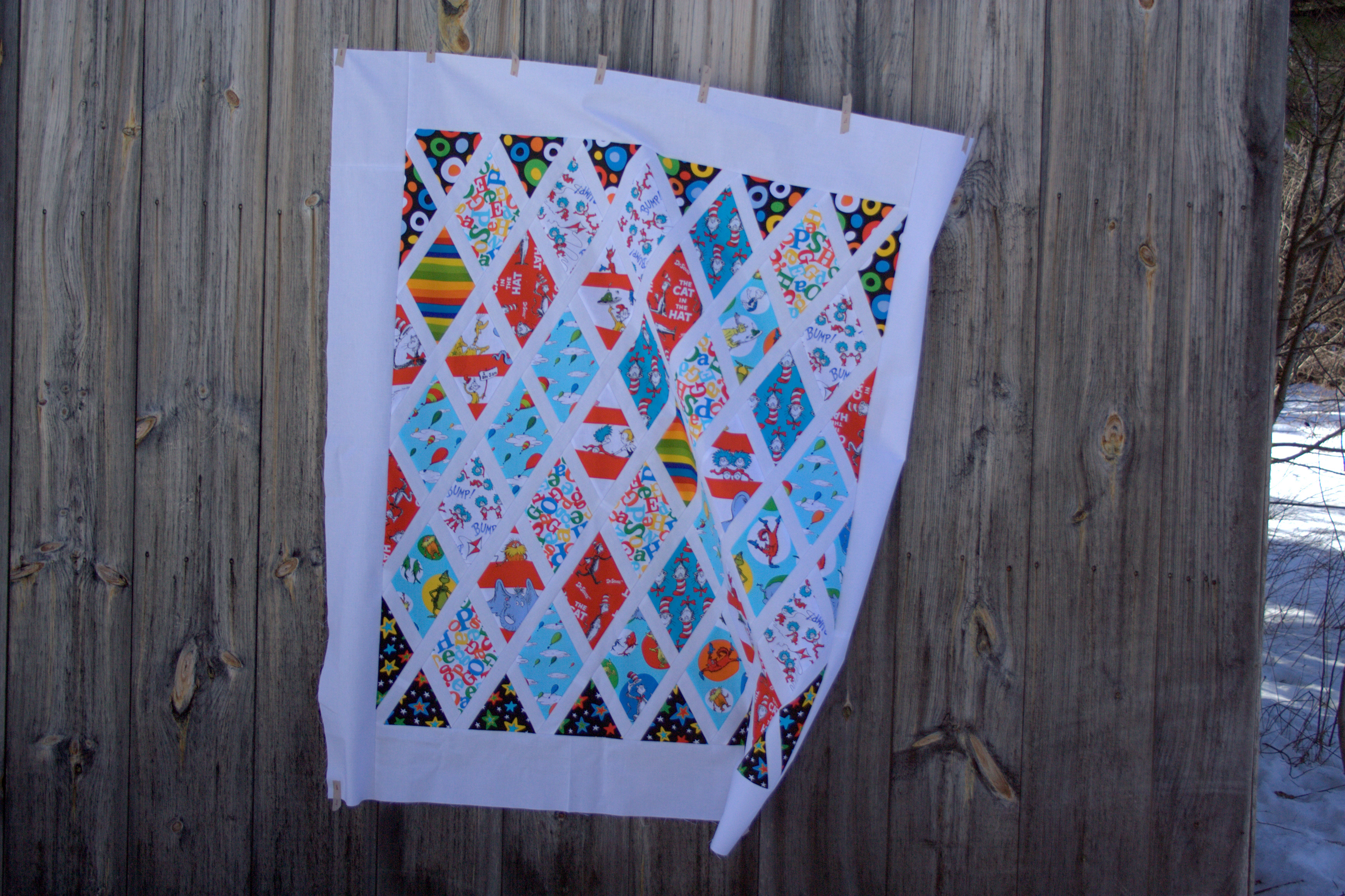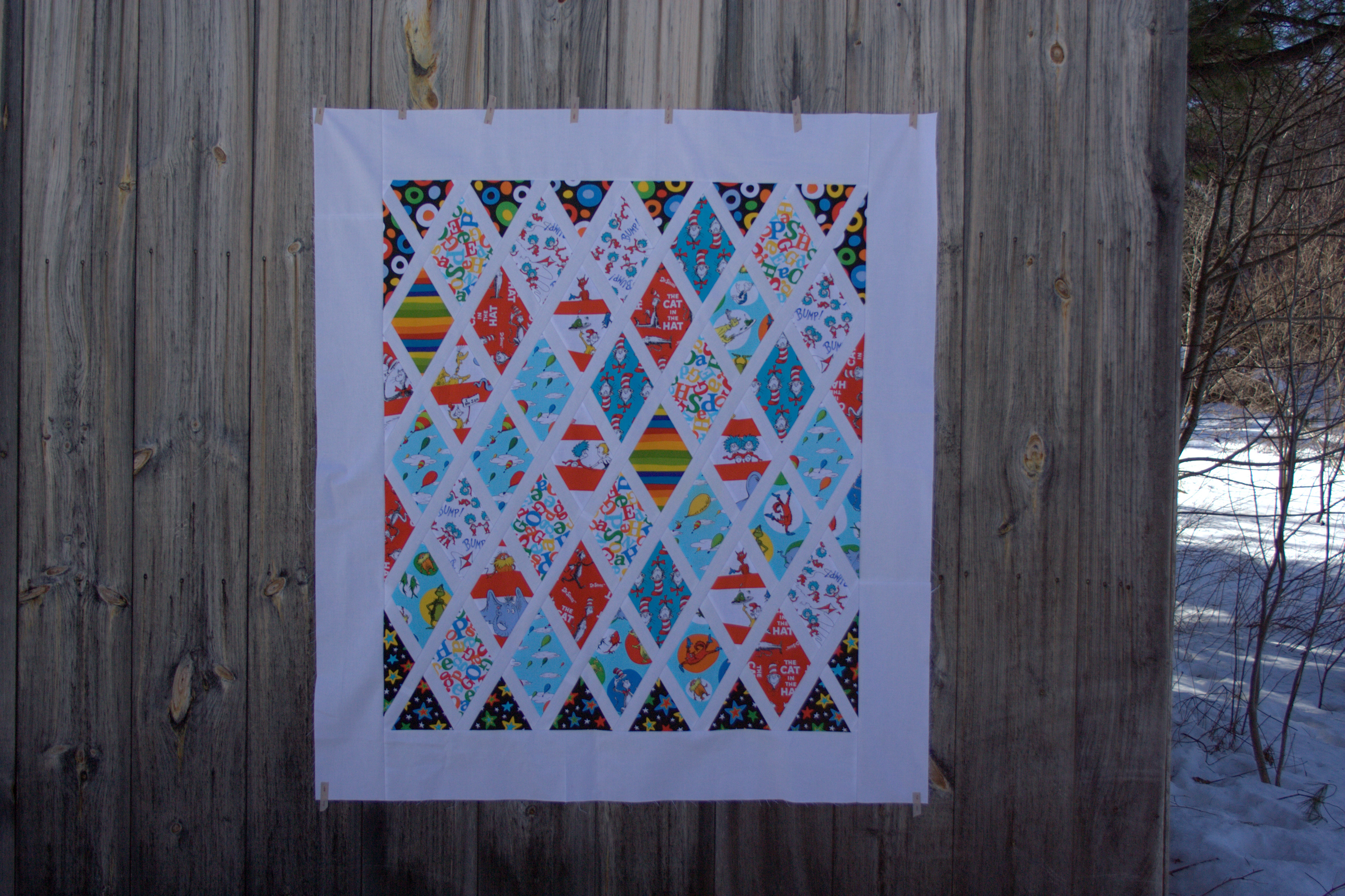 I managed to finish my March goal for A Lovely Year of Finishes quite early, so this is just a recap for the sake of linking up and meeting my March goal requirements. I basically began and finished the Dr. Seuss Diamonds quilt during the month of March, which is nothing short of amazing! It just goes to show how much tiny little windows of progress add up to a completed project. As I’ve said in previous posts, I made this quilt as a donation to a fundraiser at my daughter’s preschool. Each grade put together a basket to be either auctioned or raffled off at a Poetry Jam that took place last night, and the Pre-K’s basket had a Dr. Seuss theme.