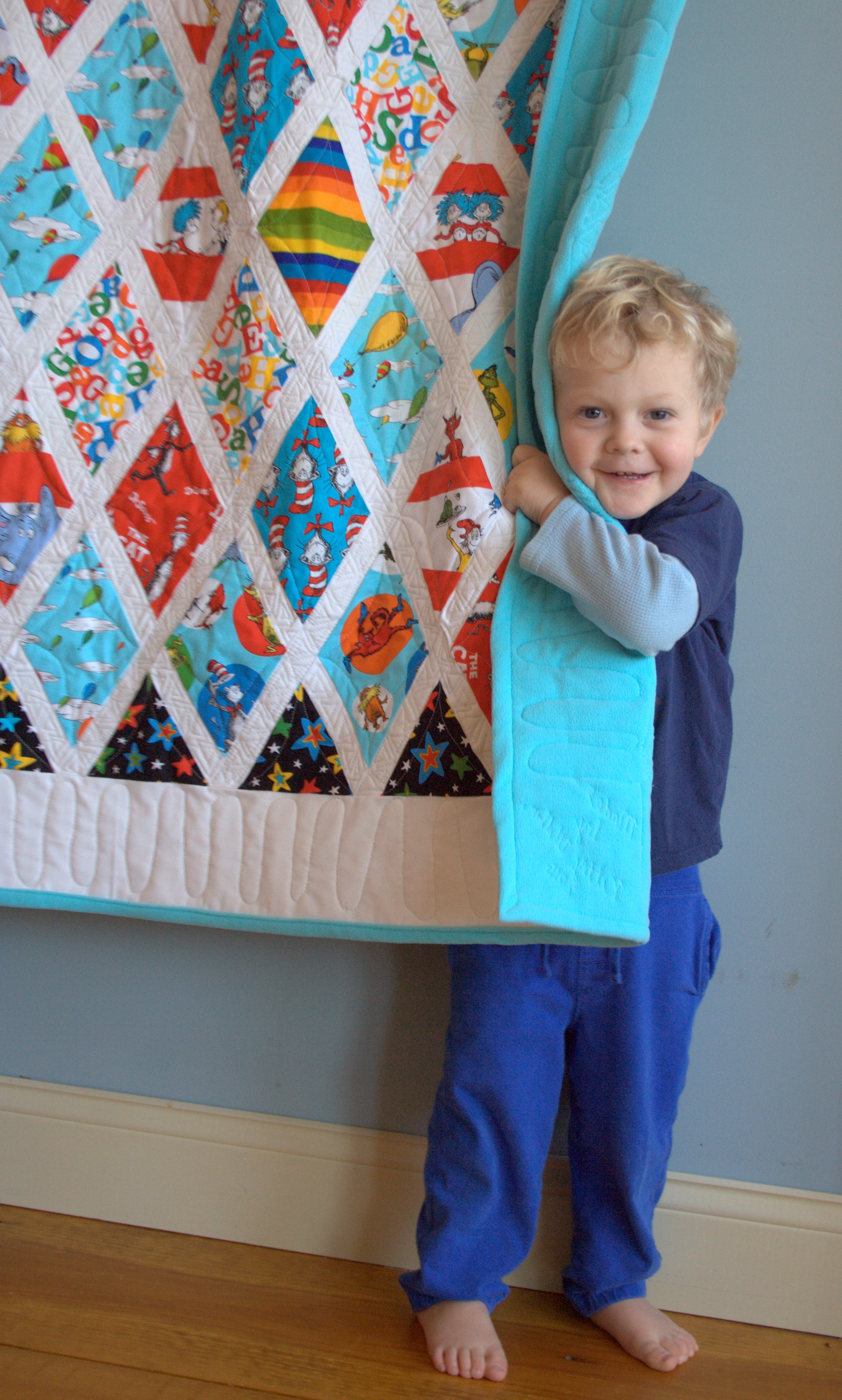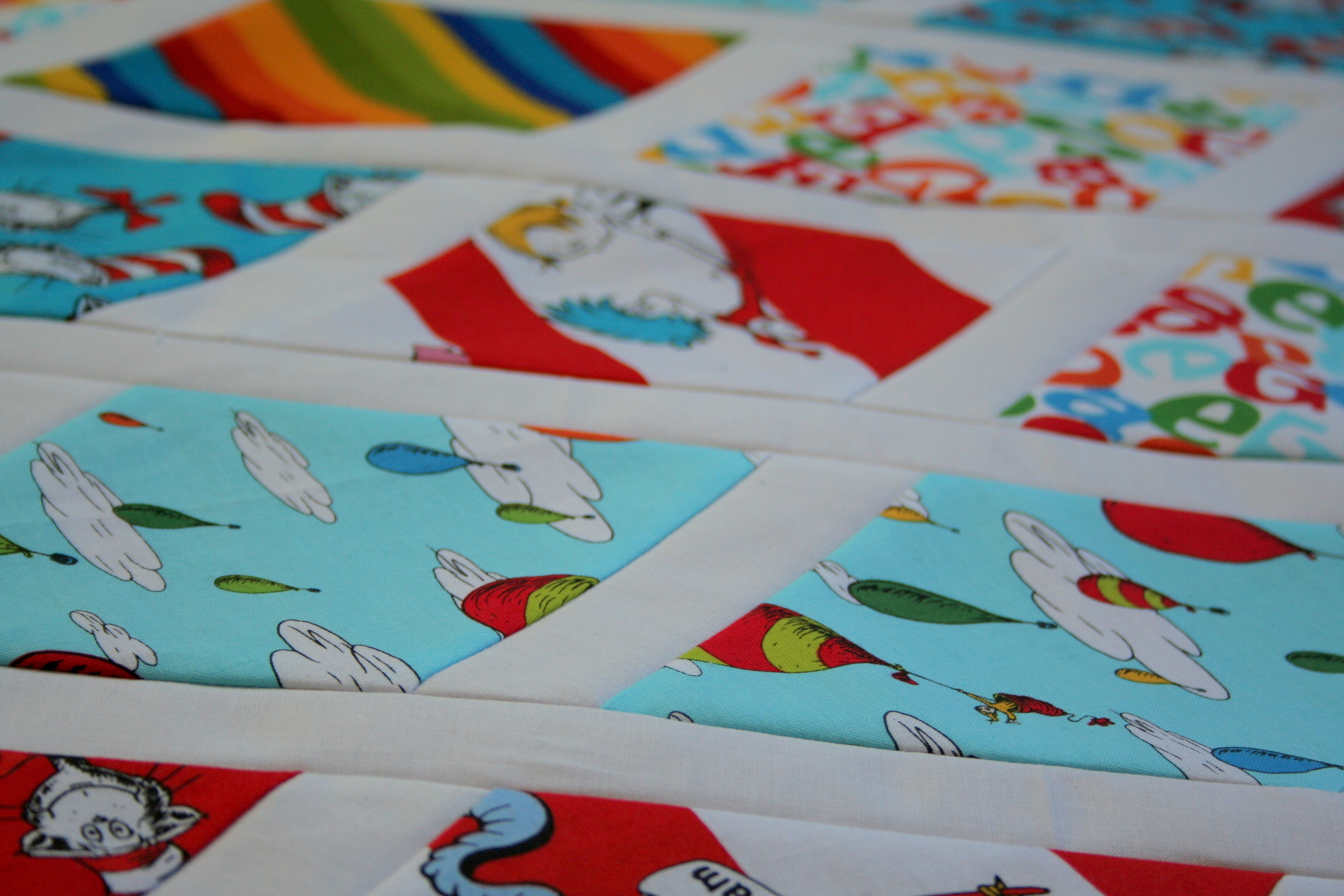 dr seuss quilt top finishMy daughter immediately spotted the one spot where the diamonds “match” across the sashing, and said how much she loves the quilt. My son pointed out characters and said, “We have that book!” again and again. I’m hoping that the recipient of this quilt loves it even half as much as my kids do.