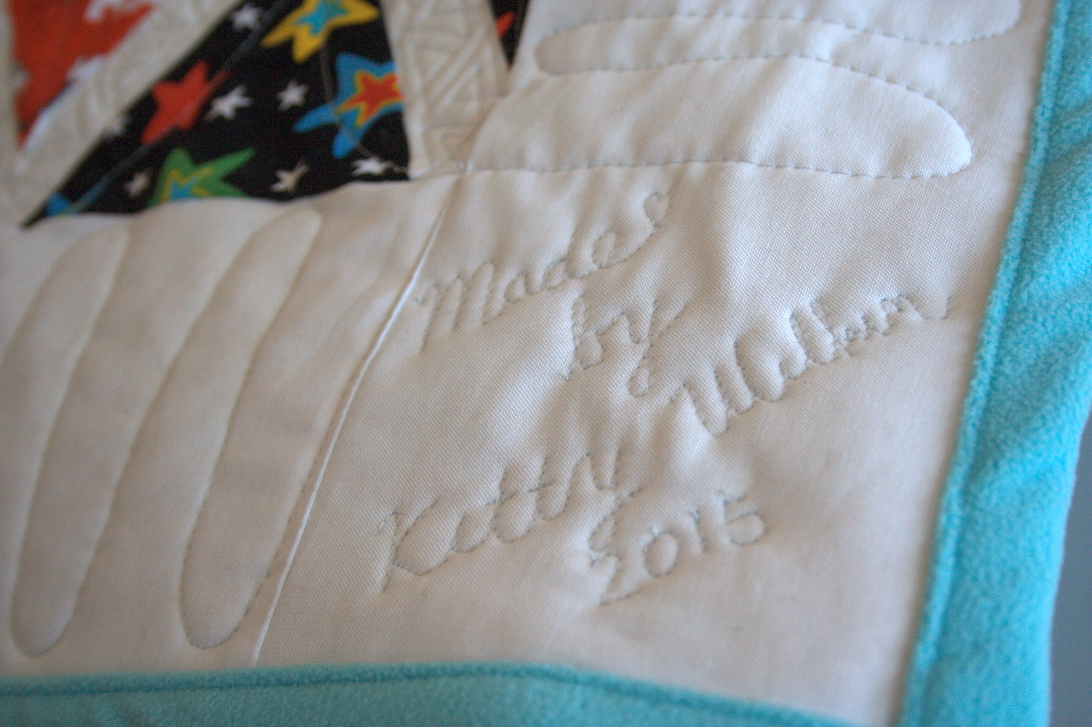 If you’d like to see more about the quilt, visit my post Friday Finish: Dr. Seuss Diamonds Quilt, or to see progress read When Duty Calls: A Dr. Seuss Raffle Quilt or Dr. Seuss Flimsy Finish.