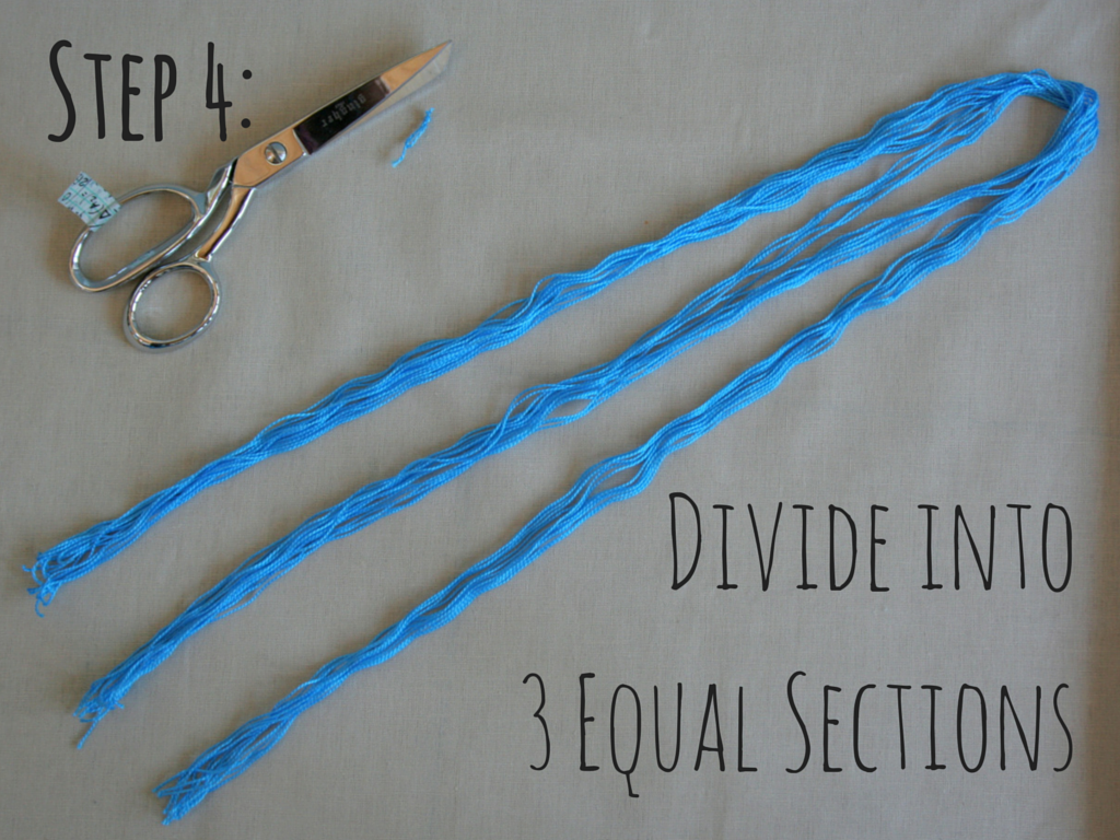 Step 4- Divide into 3 equal sectionsDivide the floss into three approximately equal sections. This doesn’t have to be perfect; I didn’t sit and count out the strands to make it perfect. If that’s your thing, then feel free to do so, but just eyeing it will be sufficient.
