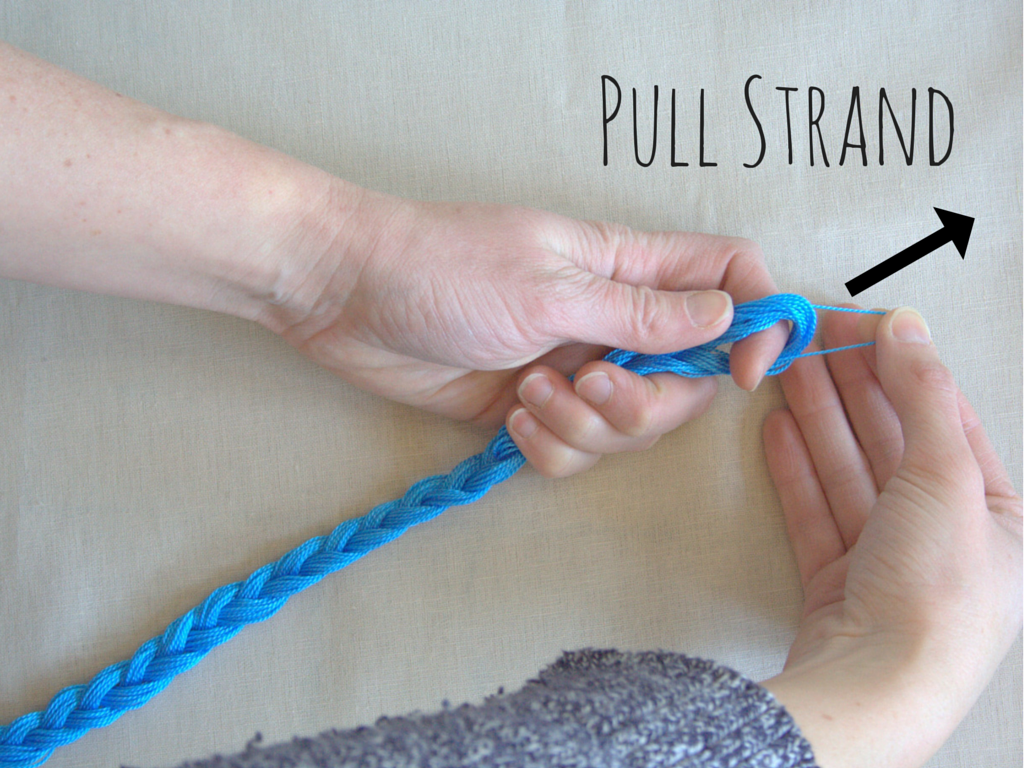 removing strand of floss from braidThen, get a bit better grasp on the rest of the braid–no need for a vice grip, just hold it steady as you pull out the single strand–and pull the strand out completely.