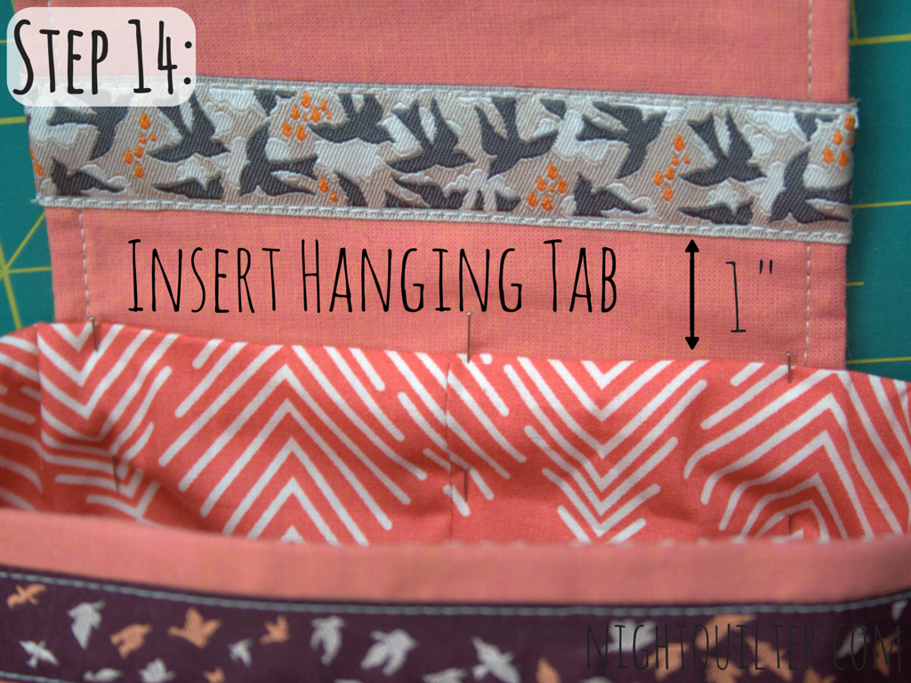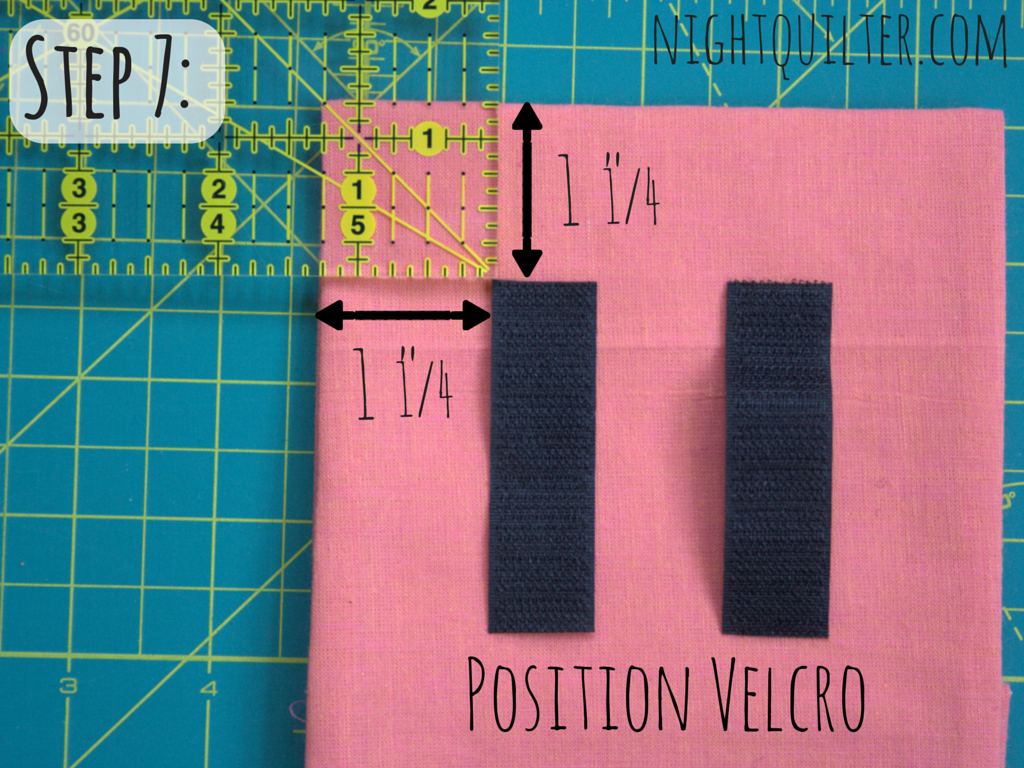 thread catch base and hanging tab directionsWith the folded portion facing away from you, and the unfinished long end facing down, position the velcro strips 1 1/4″ from each top corner. Pin in place.