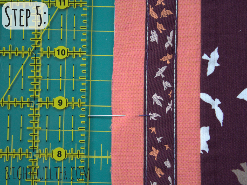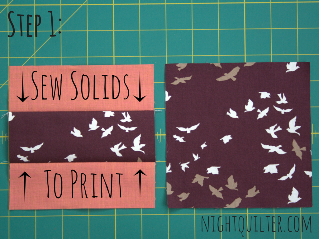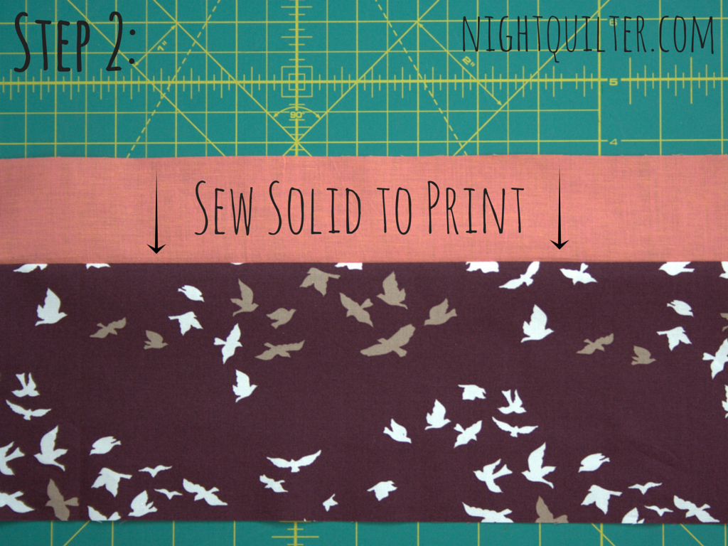 pin cushion tutorial Sew 1.75″x5.5″ coordinating solid pieces to 2.5″x5.5″ print fabric as shown, pressing seams toward darker fabric. You should now have two 5.5″ squares.