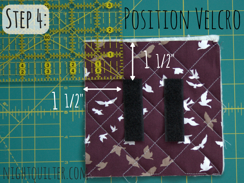 pin cushion tutorialAlign velcro approximately 1.5″ from each corner and top stitch securely. I stitched around each strip twice to ensure that it will withstand a lifetime of use. Note: Use the soft side of the velcro on the pincushion so that it doesn’t pick up thread and fuzz and everything when you move it around your workspace. The hooked side of the velcro will be sewn onto the base.