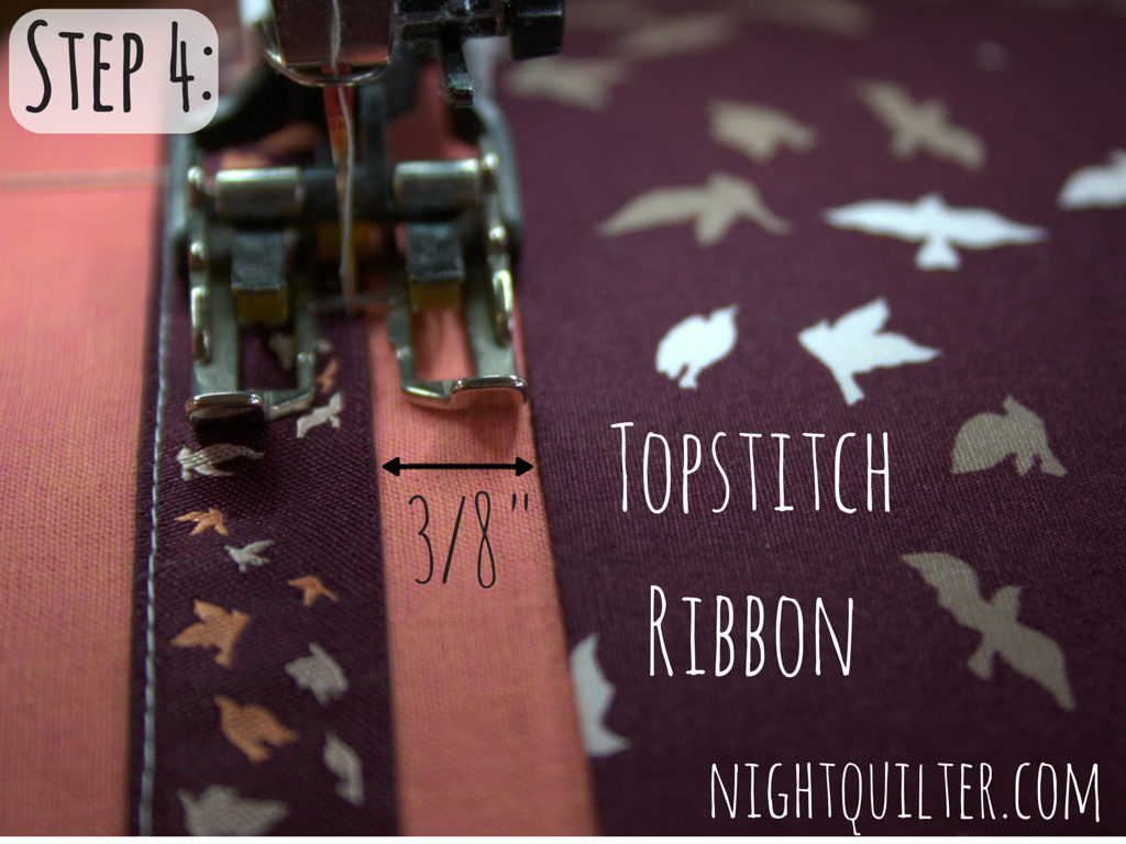 pin cushion tutorialTop stitch ribbon to both coordinating solids approximately 3/8″ away from the print fabric. Note: If you use a different width ribbon, you may want to adjust this distance. Keep in mind the 1/4″ seam allowances on the outermost edge.