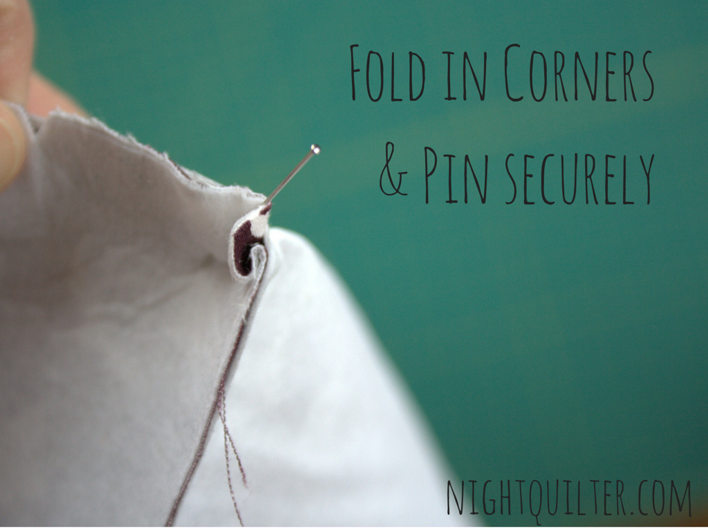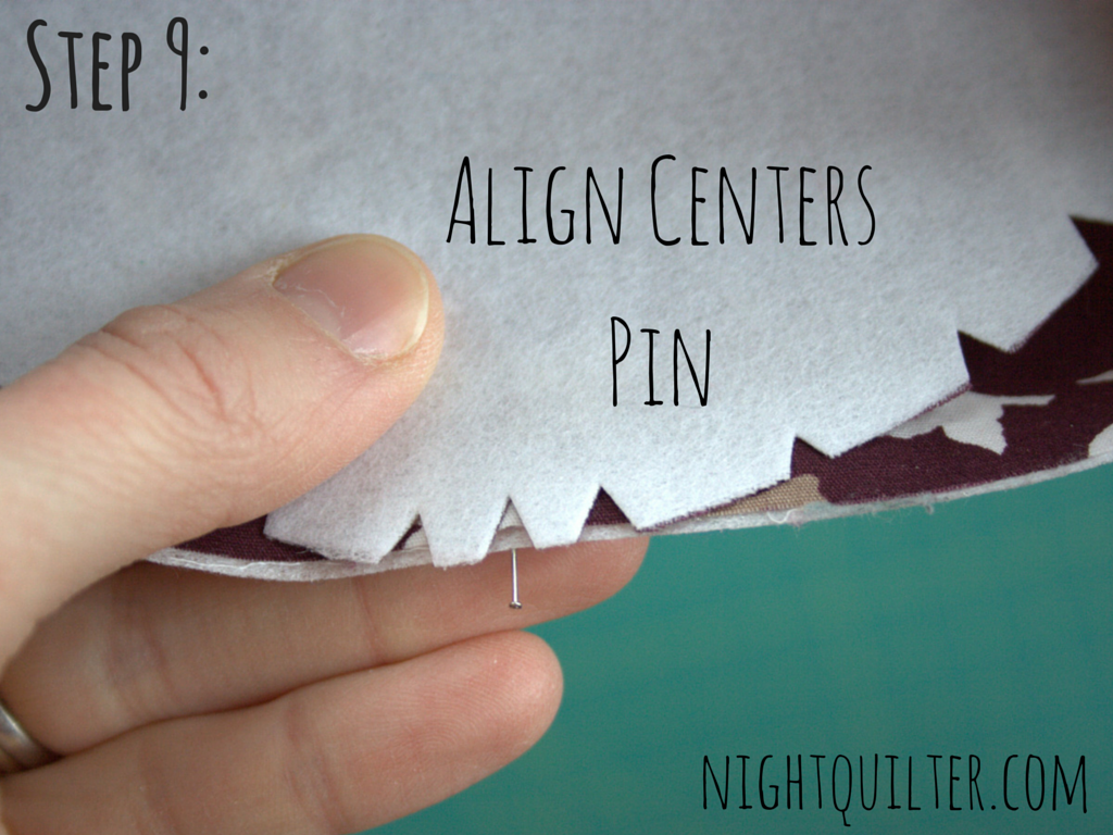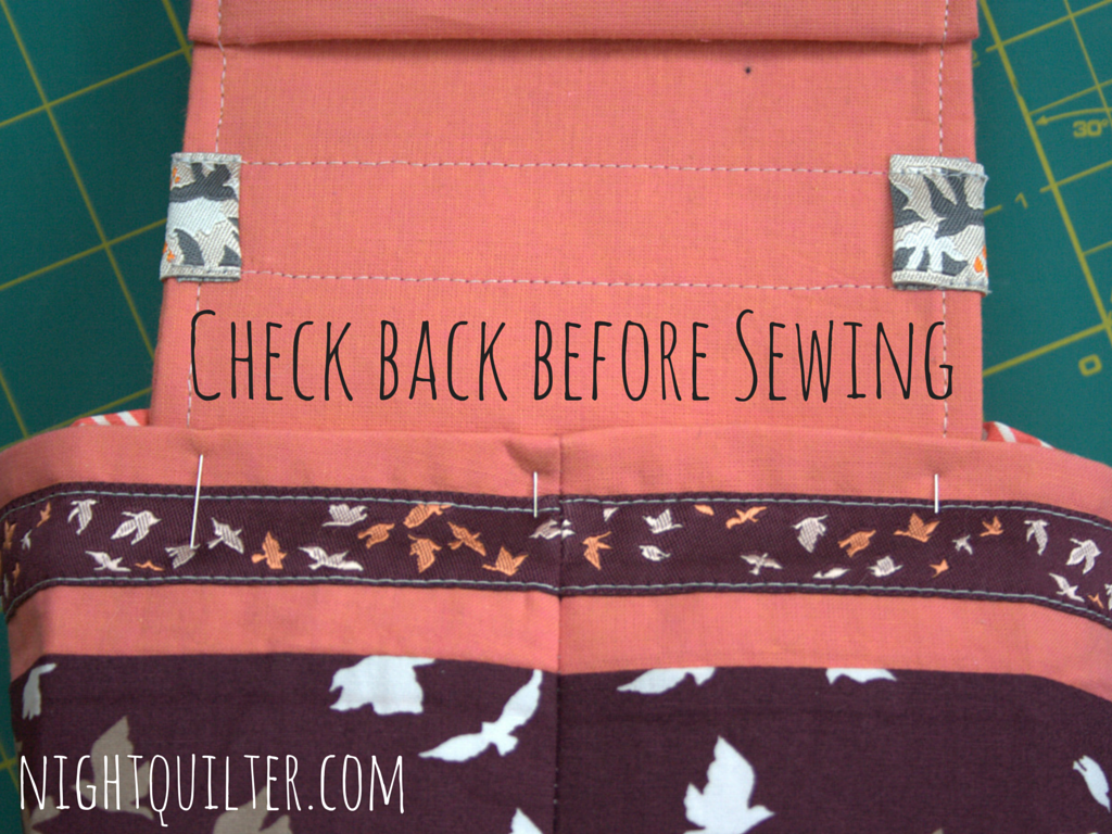 thread catch tutorialFind the center of the outer panel (8.75″ from an edge) and pin. Note that in the photo, I pinned the top of the panel. You should pin the bottom of the panel instead. (Oops)