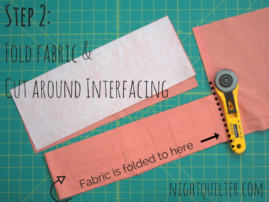 2Once interfacing cools, fold fabric in half and use rotary cutter and ruler to cut around the 14.5″x5.5″ interfacing. You will end up with two perfectly sized fabric pieces with the interfacing fused to one of them.