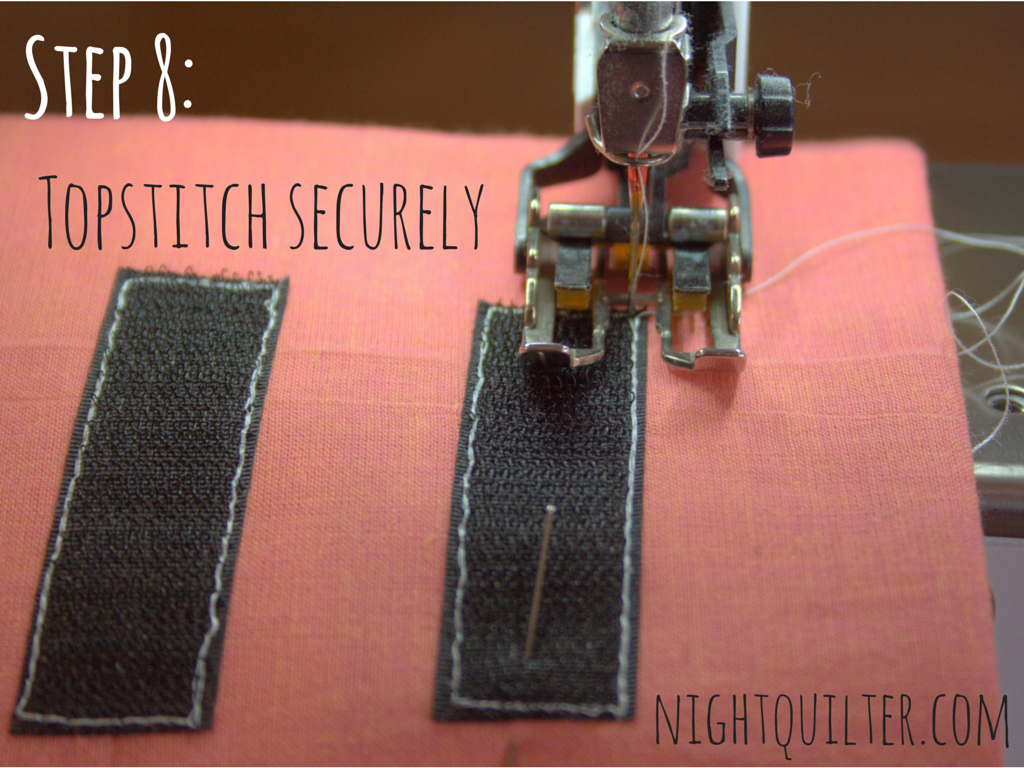 thread catch base and hanging tab directionsTopstitch the velcro in place, being careful to only sew through one layer of fabric (the portion that was pressed under will be folded up out of the way.) I stitched around each velcro strip twice to ensure the velcro stays in place even with frequent use.
