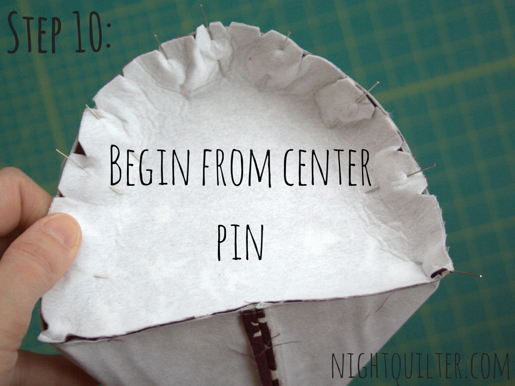 thread catch tutorialMark the center of your interfaced thread catch bottom (folding in half and creasing lightly to find the center point works wonderfully). Align the center of the bottom to the bottom seam of your outer panel. Be sure that right sides are facing away from you (you should be looking at a whole lot of interfacing) and also be sure that you are attaching your bottom to the bottom of the thread catch body (the ribbon is on the top).