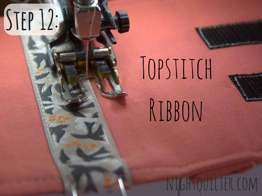 thread catch tutorialAlign the ribbon 3/8″ from the print fabric and topstitch in place. Note: If you are using a different width of ribbon, you may want to adjust this distance. Keep in mind the 1/4″ seam allowance at the top of the thread catch! You can use either coordinating or contrasting thread depending on the look you’d like to achieve. I opted to use Aurifil 50wt 2015 – Aluminum for the entire project. It seems to go with everything, in my opinion!