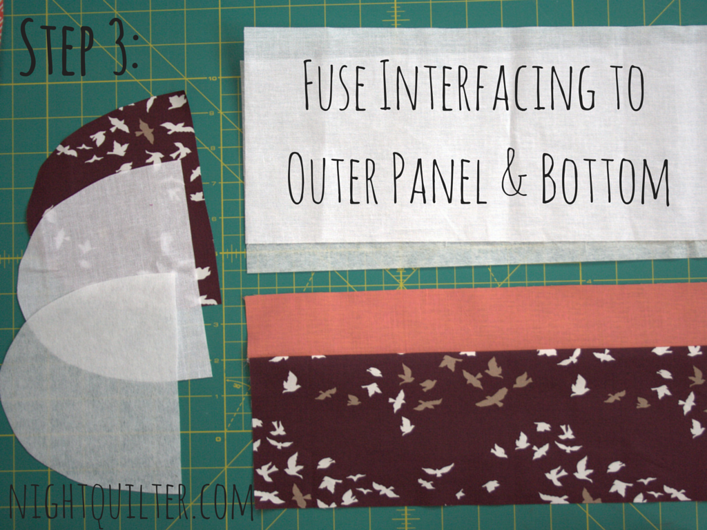 thread catch tutorialFollowing the instructions on the fusible interfacing, fuse both layers of interfacing to the wrong side of the outer panel, and to the thread catch bottom. Note that if using Pellon 101 and 808, you should fuse the 101 first since it calls for a damp press cloth and steam. Once fused and cool, then fuse the 808 for added structure. Note: Be sure to use a press cloth or other scrap fabric beneath and above your fabric and interfacing to protect your iron. Interfacing melted onto the iron is no fun!