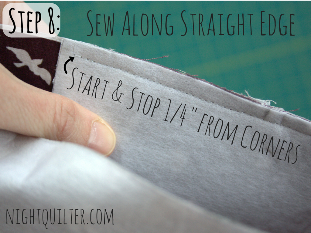 thread catch tutorialUsing the bottom of the thread catch as your reference and making sure it is lined up with the outer panel, sew along the straight edge of the bottom. Be sure to start and stop 1/4″ from both corners, backstitching at the beginning and end of your stitches.