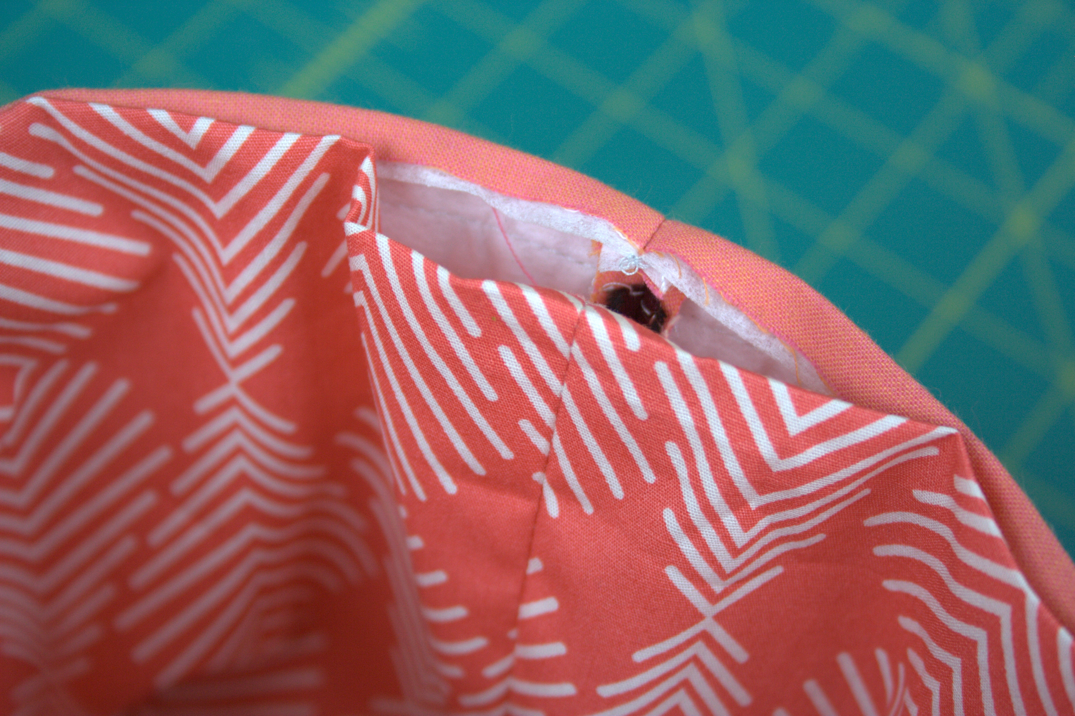 Turn right side out through the opening in the top. Push lining down into the outer body. Press top edge, tucking in raw edges of the opening and pressing well.