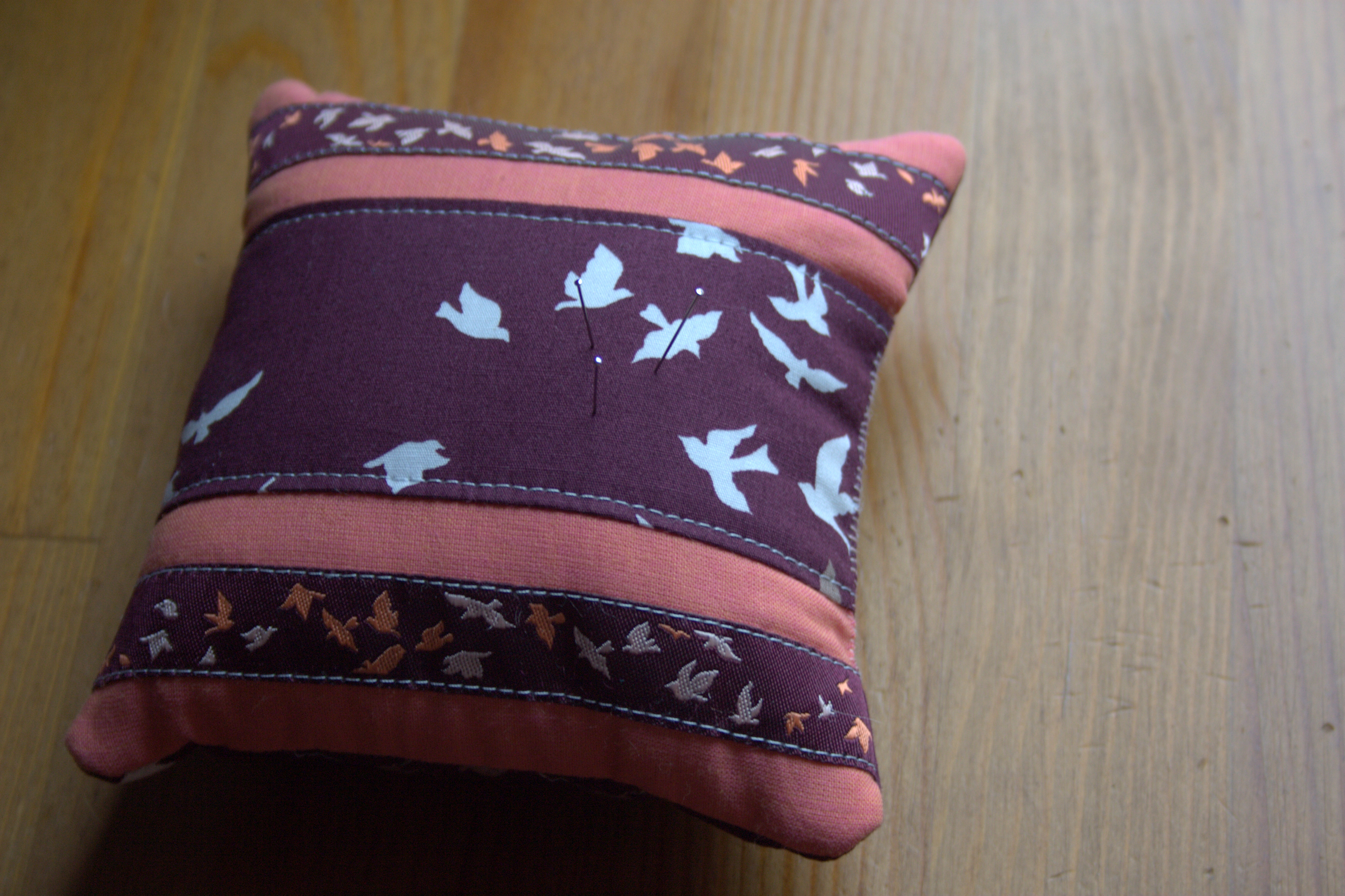 pin cushion tutorialFold in edges around opening and pin or finger press closed. Using a blind stitch (or visible whip stitch), hand stitch closed using coordinating thread.