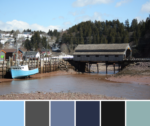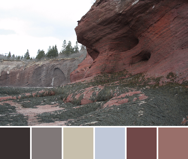 bay of fundyThe Bay of Fundy is known for having the highest tidal range in the world. I’ve wanted to travel to the Bay of Fundy in Canada since my estuarine ecology studies in college. There’s something about 40 foot tides and vast mud flats that makes me happy. Our short timeframe and my 8 months pregnant body didn’t really allow for as much exploring as I’d have liked, but we had a great time anyway. Today I’ll be sharing some color palettes from photographs taken on our trip, created with Play Crafts’ Palette Builder 2.1.