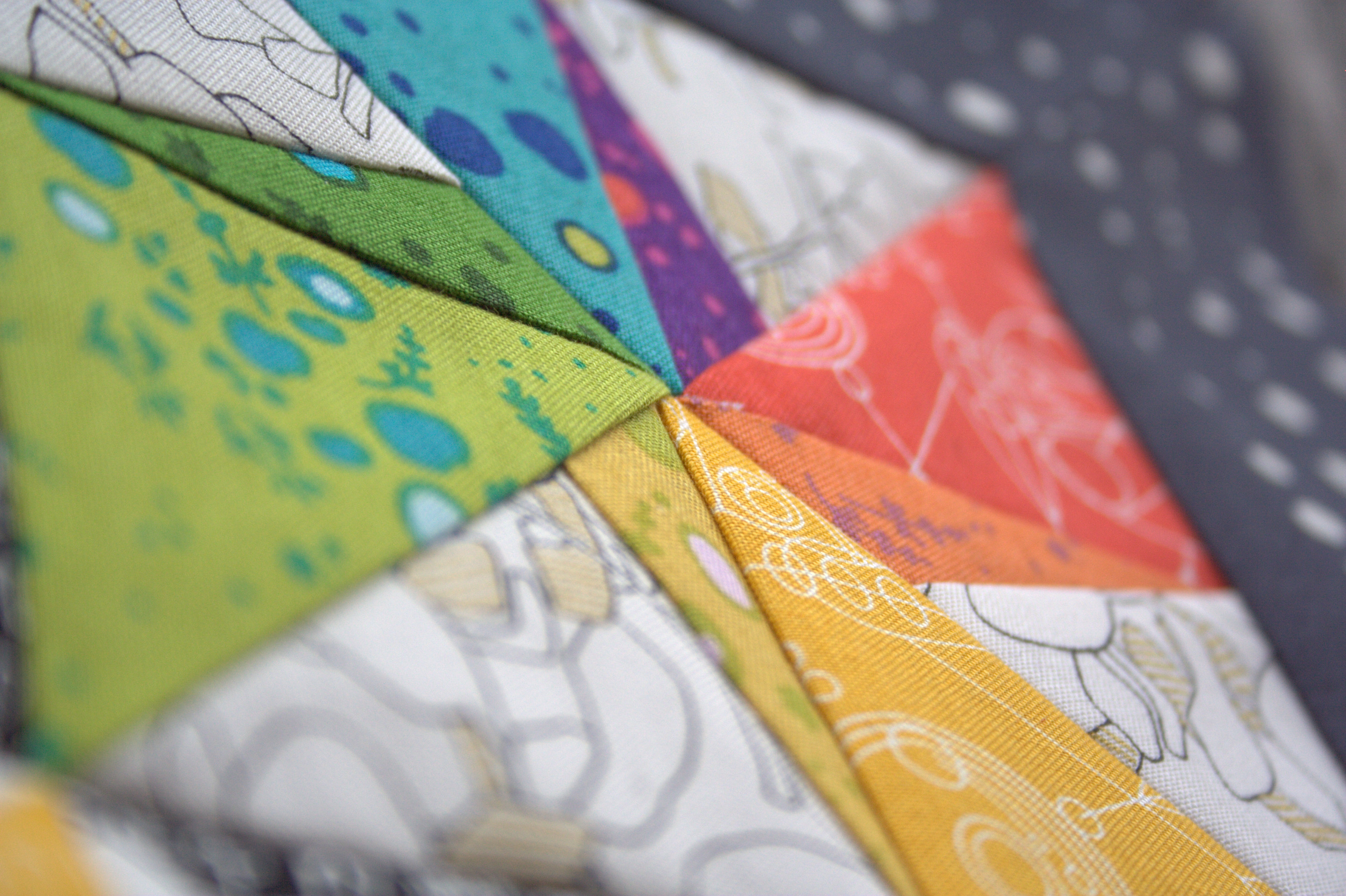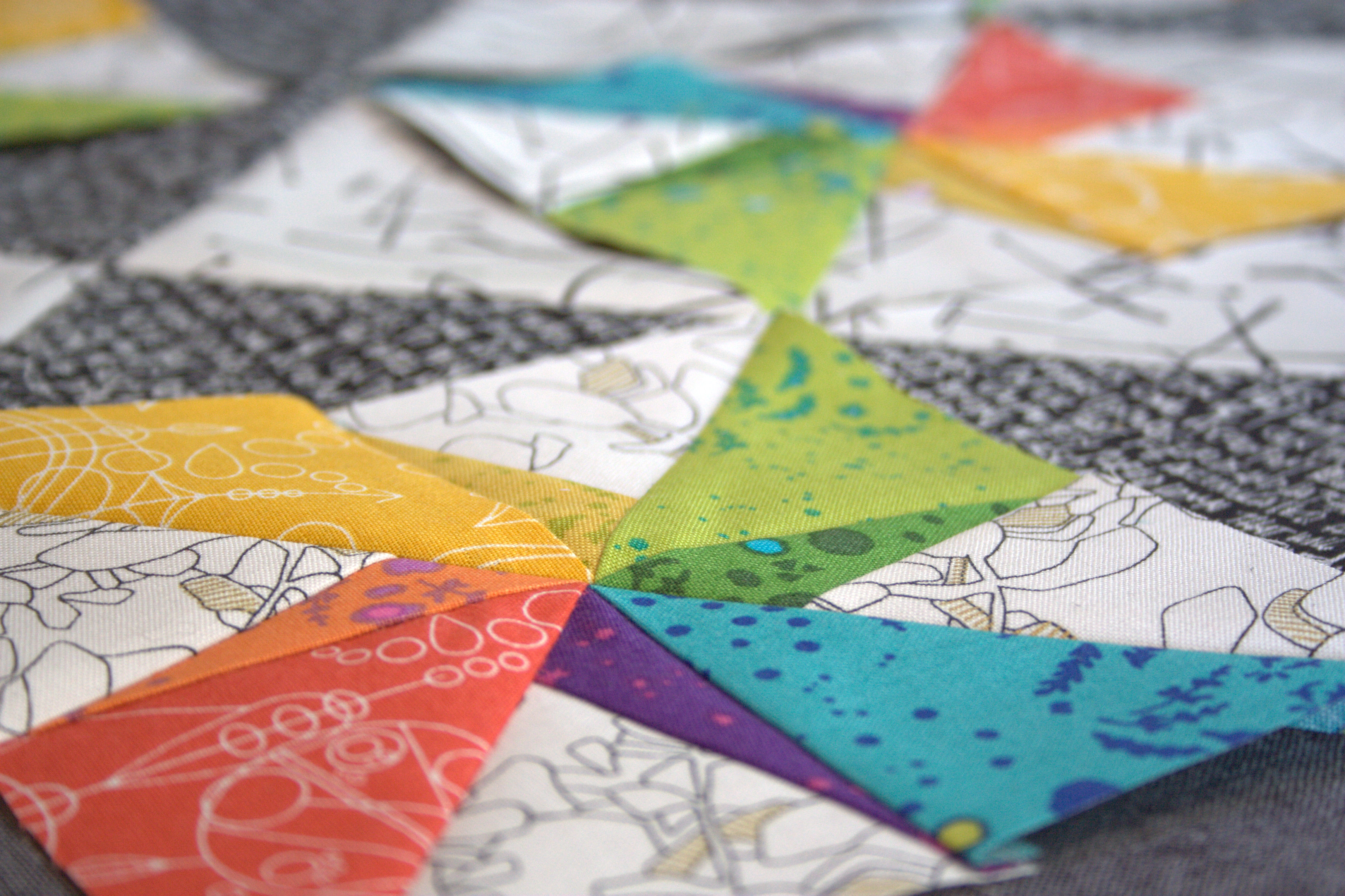 Fabric: Pinwheels are pieced using rainbow fabric from Alison Glass’s 2015 Sun Prints, Mercury and Grove (Andover Fabrics), with a background of Modern Floral in Charcoal from the Botanics fabric line by Carolyn Friedlander (Robert Kaufman Fabrics).