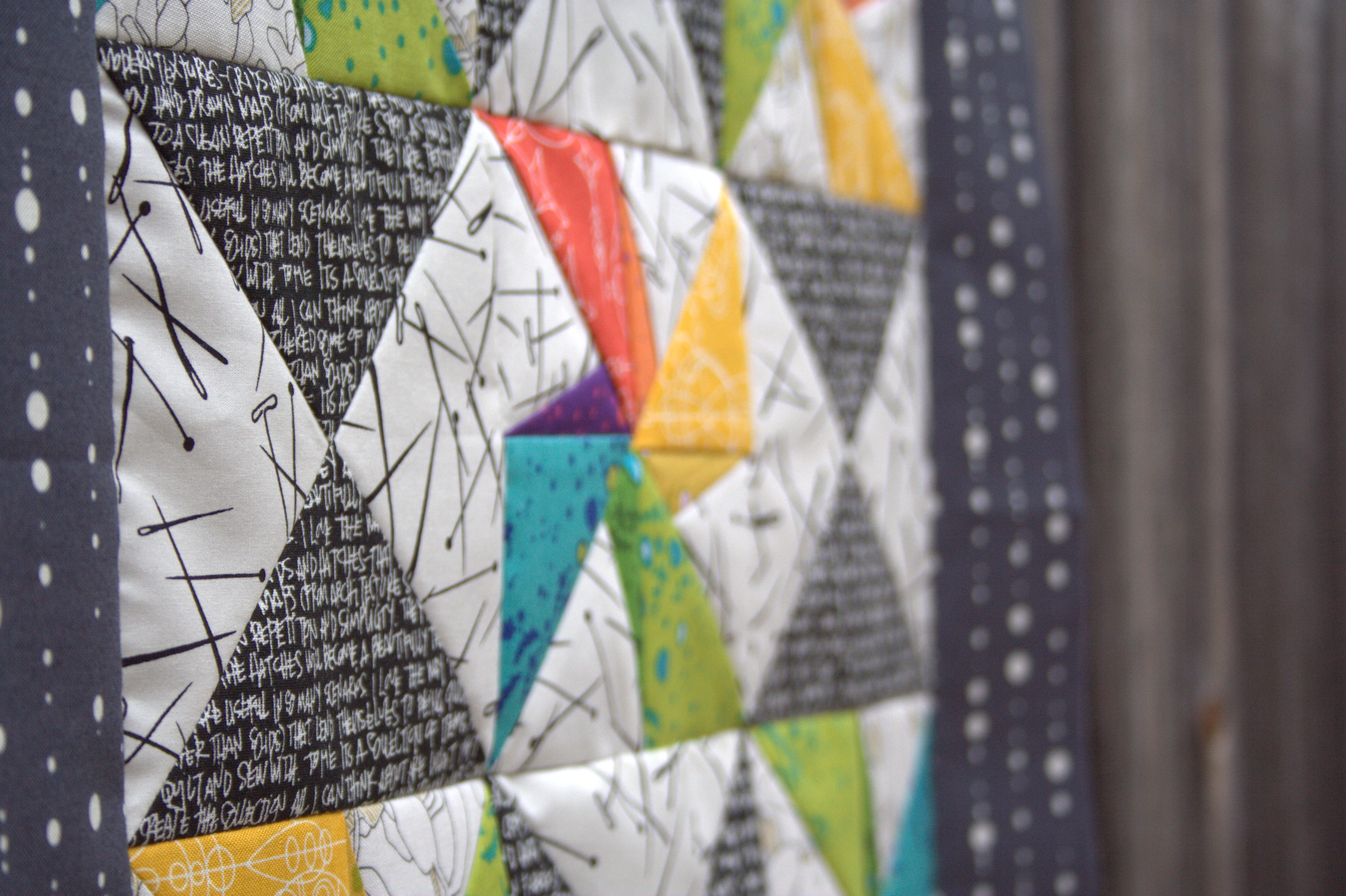 Hourglass blocks are pieced using Scribble Notes in Black from the Architextures fabric line by Carolyn Friedlander (Robert Kaufman Fabrics) and Make and Pin fabric from the Makers fabric line (Art Gallery Fabrics).