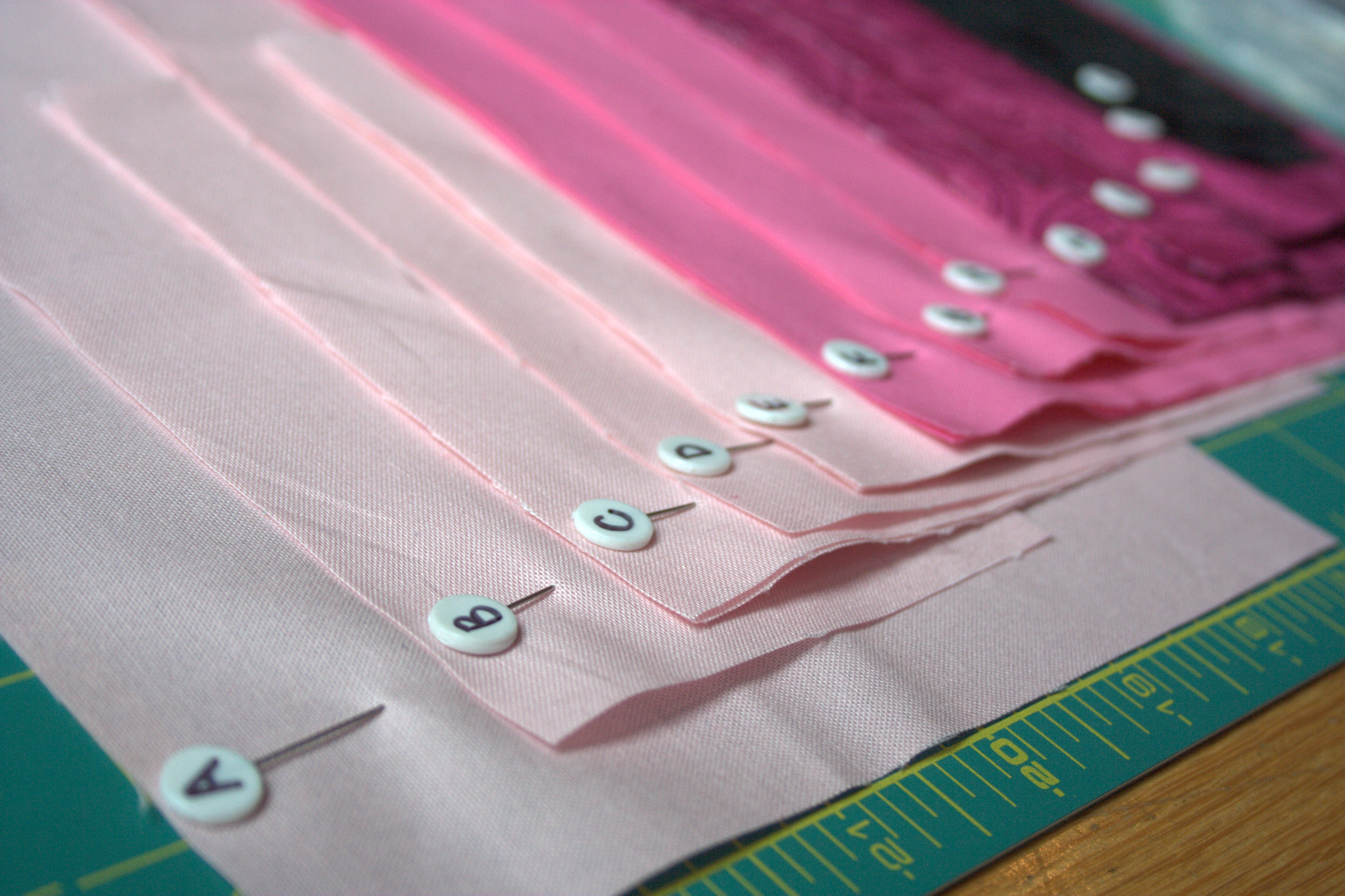 hazel hedgehog and numbered pins for organizing cut quilt piecesWith 20 numbered pins, I was able to create letters enough for all the Hazel pieces, while letting the letters correspond to the numbers (1 = A, 2 = B, etc.). This lets my OCD side rest easy knowing that my letters will be as easily organized and found as the numbers.