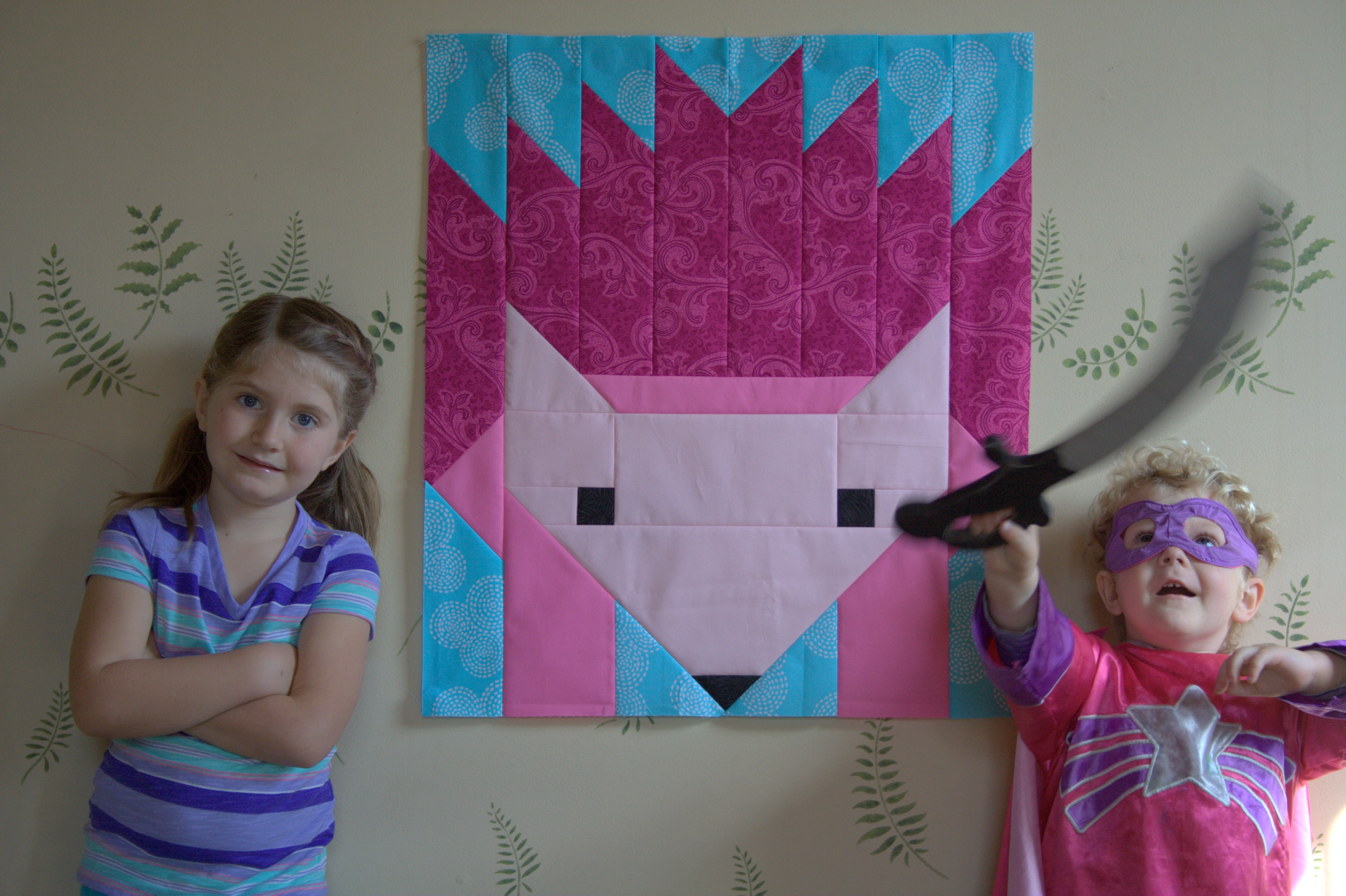 hazel hedgehog progressShe finishes at 24″x27″ since I have not yet put the borders on. She’s huge! Here are a few photos of Hazel with my kiddos for scale. Don’t mind my sword-bearing super hero son; he’s harmless, really!