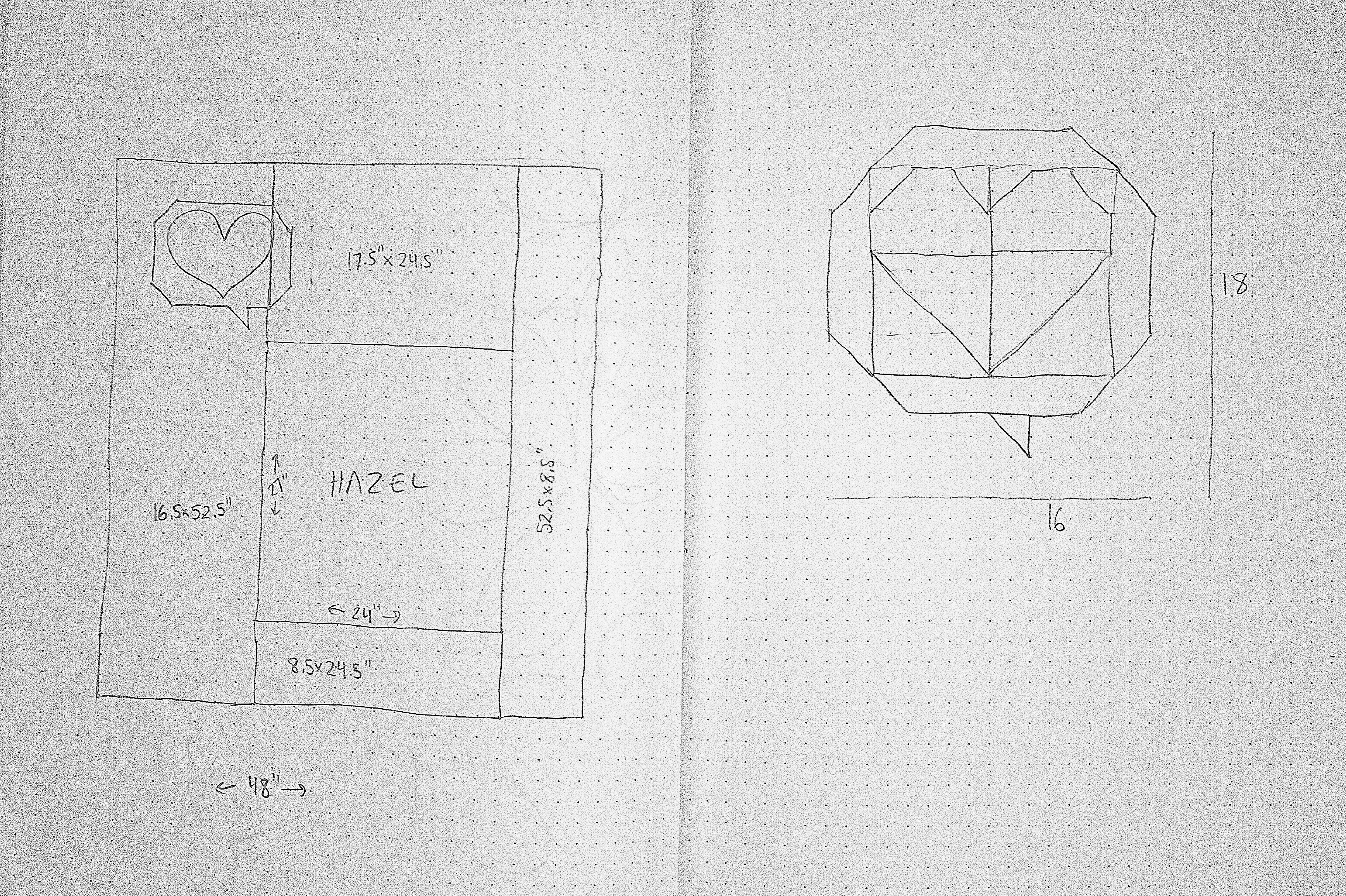 Originally, I was planning to add borders to have Hazel in the bottom right of a 48″x52″ baby quilt, with simple negative space/background around her. Easy peasy. There is actually a good chance I could have the quilt entirely finished by the baby shower on Sunday if this plan is chosen. Then, as I was sketching it out to calculate how big the borders should be, I thought an appliquéd heart in the top left would be a cute touch, which then progressed to a pieced speech bubble heart. How adorable would that be, though!? This is how my brain works, folks. If something is easy, I will immediately find a too-cute-to-ignore way to make it more complex (but awesome).