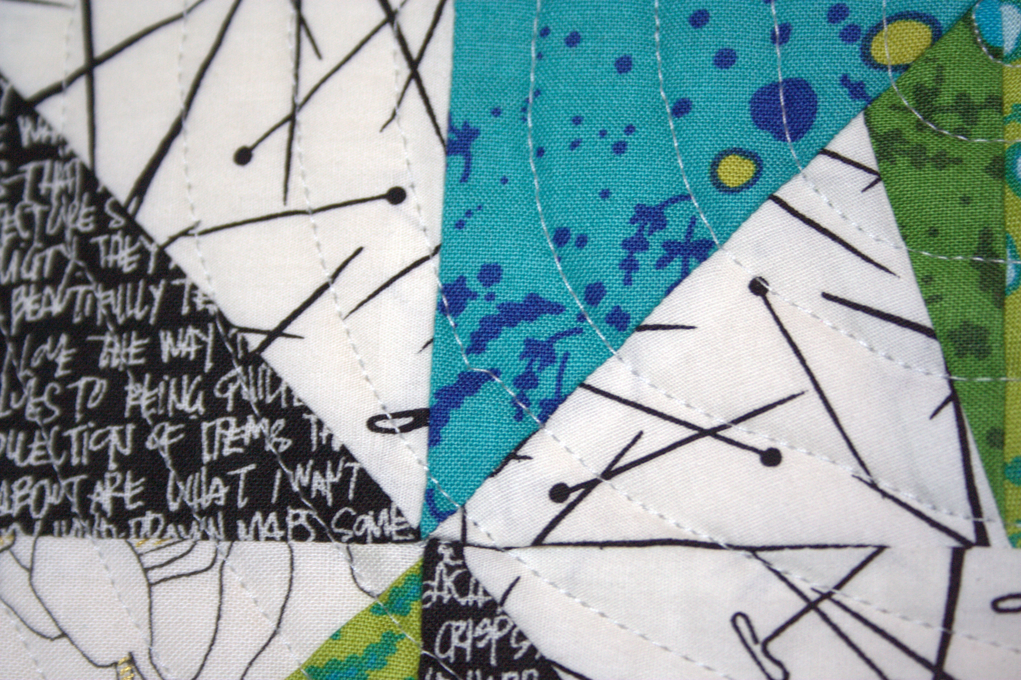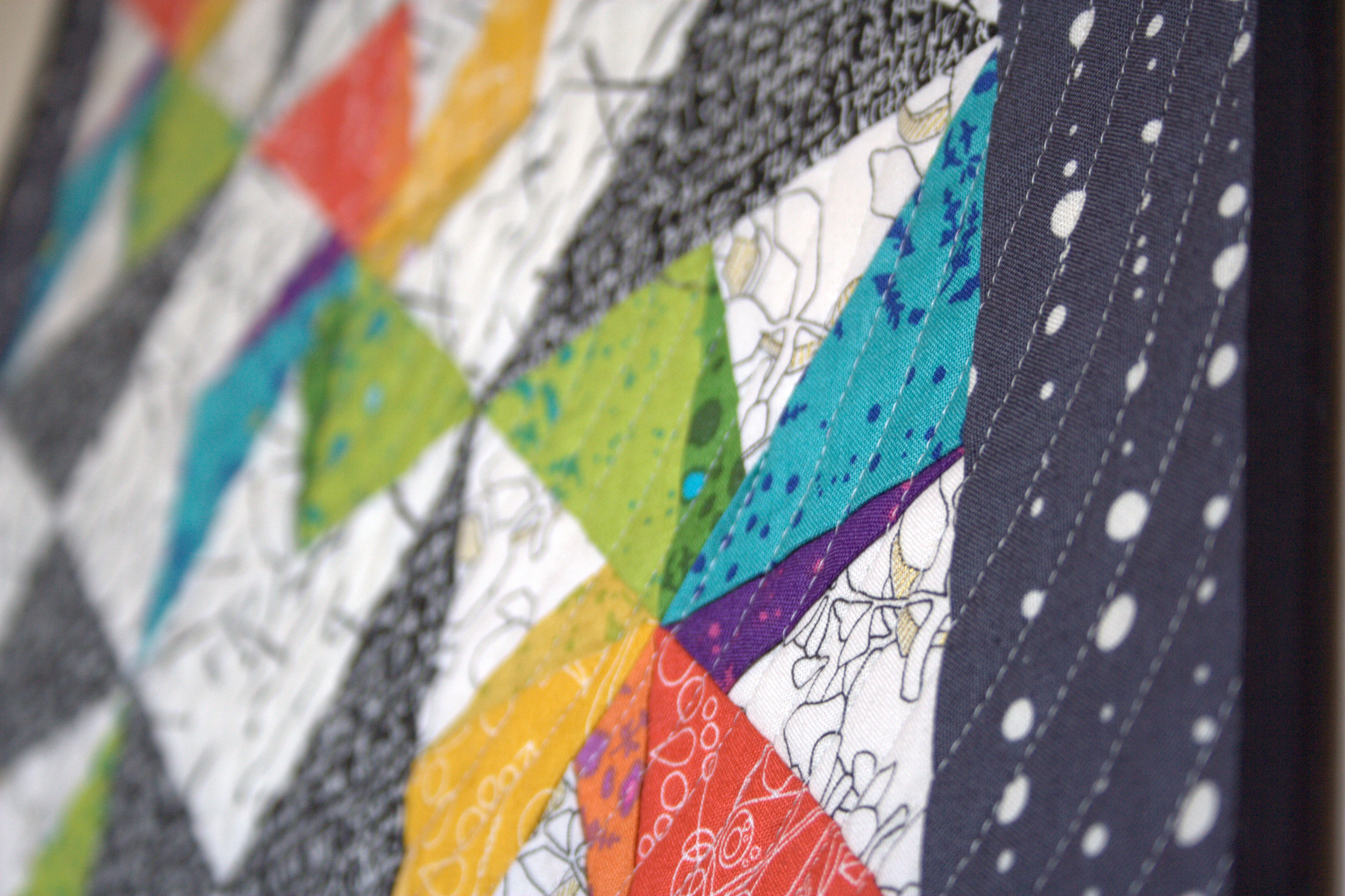 There were quite a few “jumps” where I had stopped sewing to reposition the quilt under my machine and must have restarted sewing with too much torque on the quilt. Either that, or perhaps I tried to turn the curve while my machine was stopped. (You can see one of the “jumps” in the bottom of the blue triangle. Just a little wiggle.) If I were planning to submit this quilt to shows or give it to someone who would noticed the imperfections (are there such gift-quilt recipients?), I might have ripped out the quilting and tried again. But for this, a quilt meant to hang in our own entryway, I opted to just let them be. When you step back and view the quilt as a whole, the imperfections are lost.